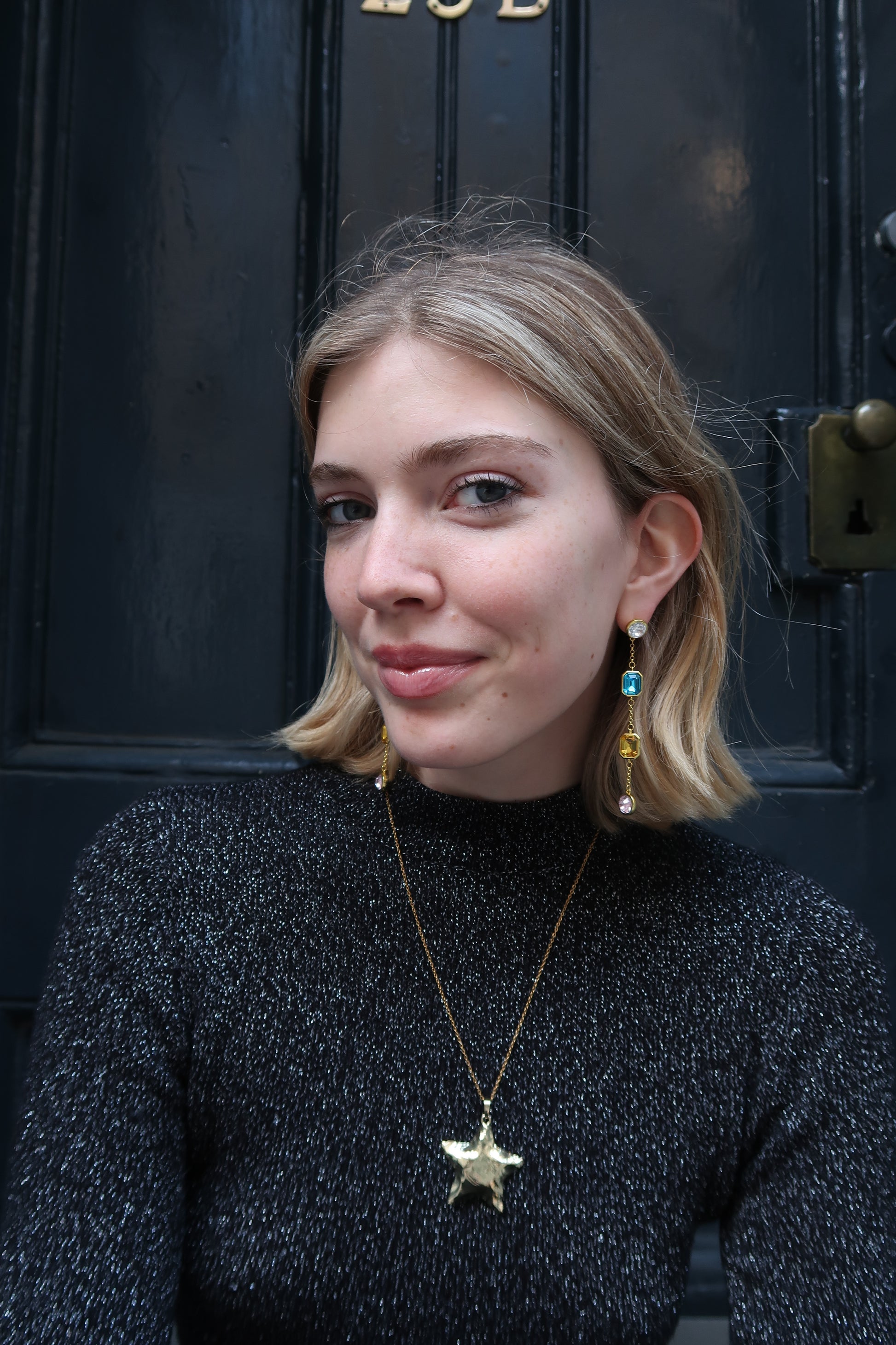 Elle’s droplet earrings are bold and elegant earrings with hanging gemstone droplets in pink, yellow, blue, and white. These are the perfect statement piece for any occasion.