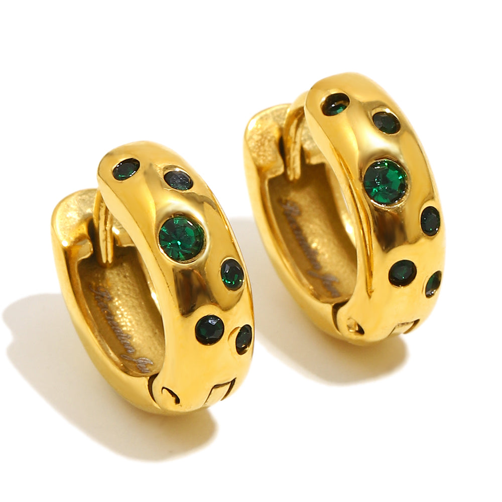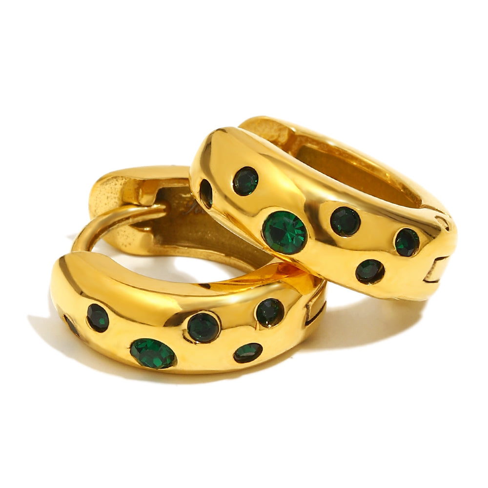 Ellie's Green Hoops are gold huggie hoops with embedded green gemstones. These earrings are perfect for pairing in a stack or to wear on their own.