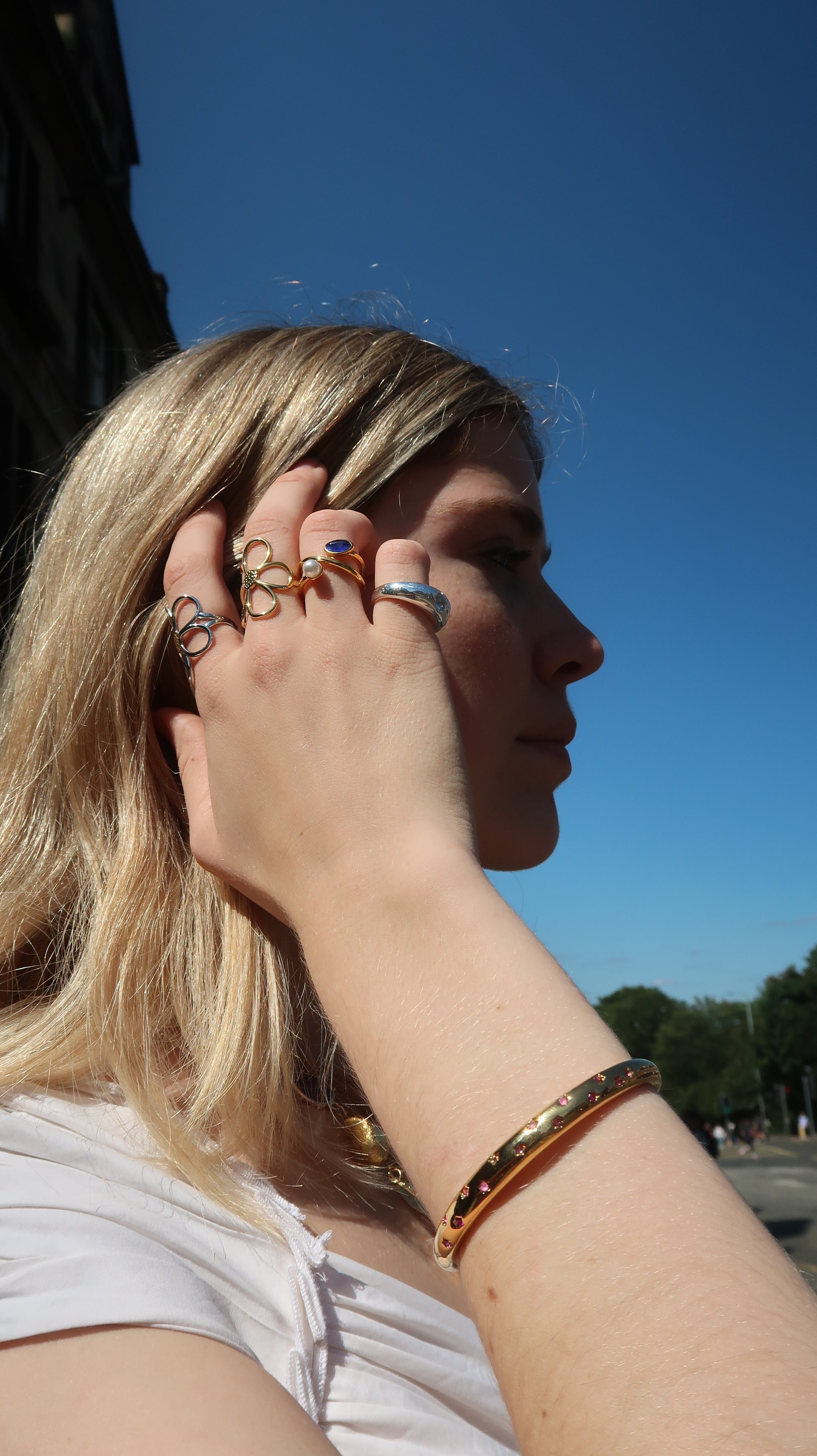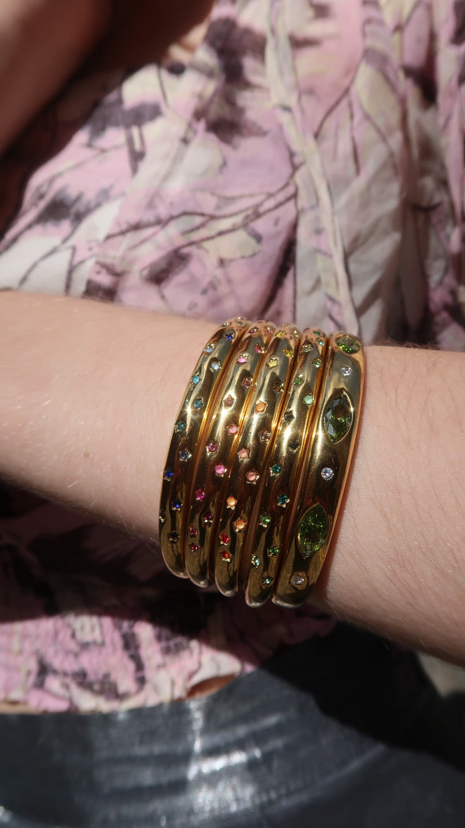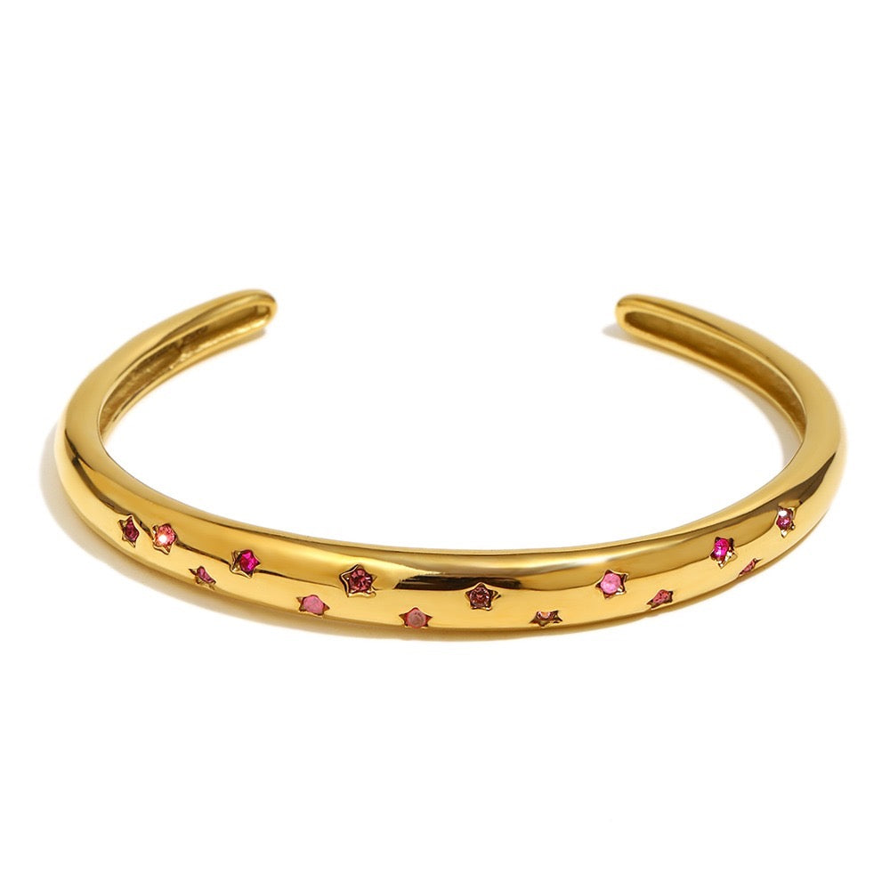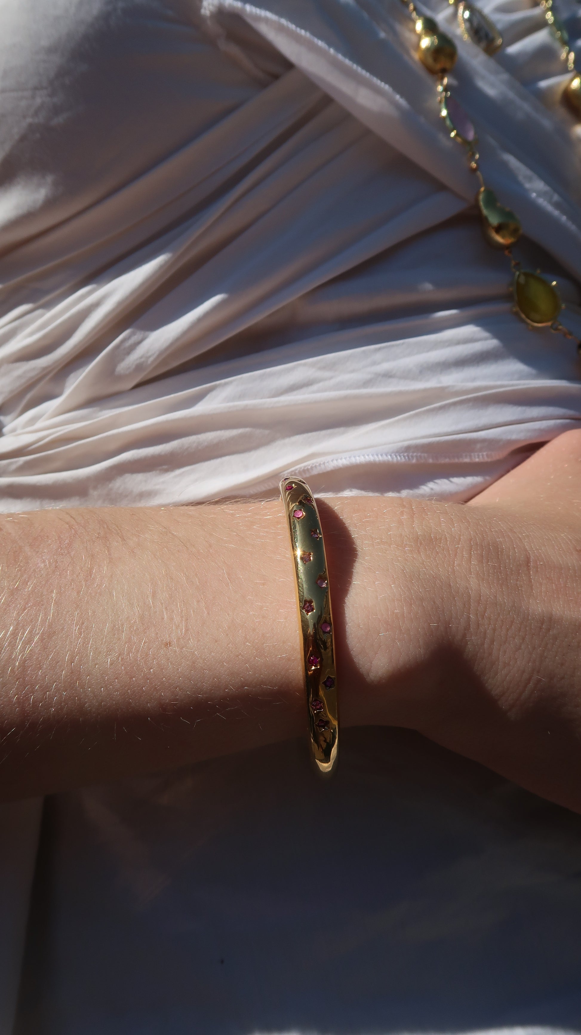 Eloise's Pink star bangle is a thin gold bangle with star-shaped gems in different shades of pink. This is the perfect bangle to add to your everyday stack.