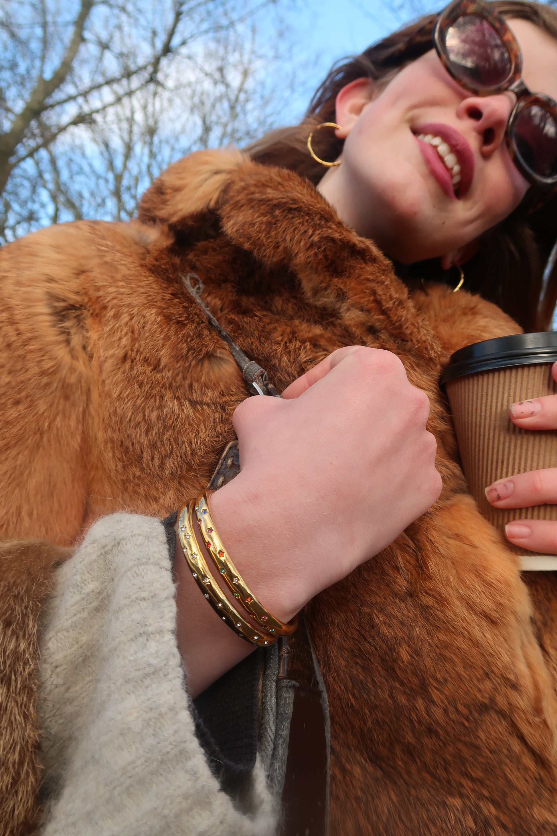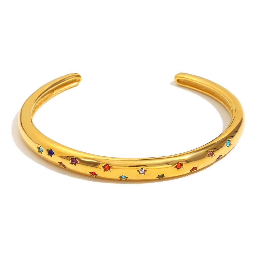 Eloise's Star Bangle is a rounded gold bangle adorned with multicoloured rainbow stars. Perfect for stacking with other bangles or worn alone as part of your every day jewellery.