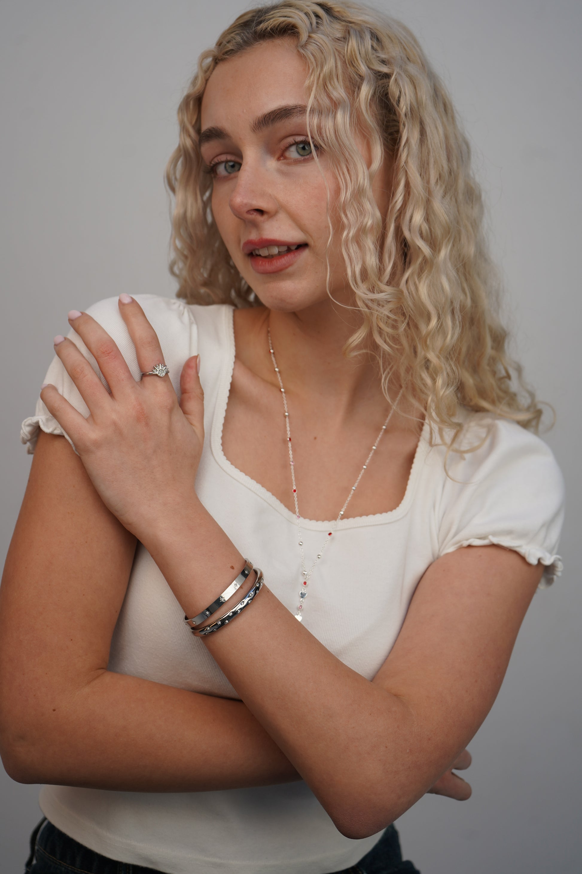 Our jewellery is crafted from 316L medical-grade stainless steel or 925 sterling silver, making it hypoallergenic and safe for sensitive skin. Each piece is 18k gold-plated using PVD coating, ensuring long-lasting shine that won’t tarnish or turn your skin green.