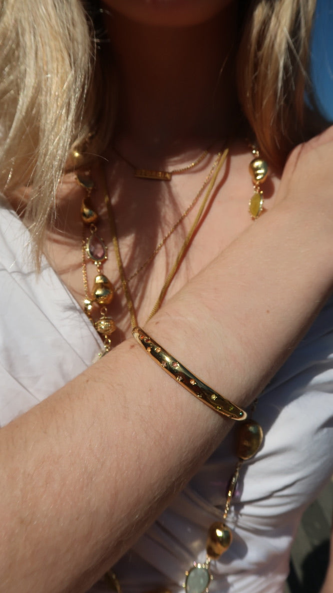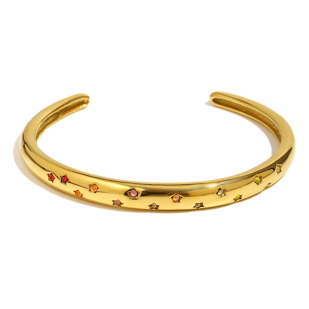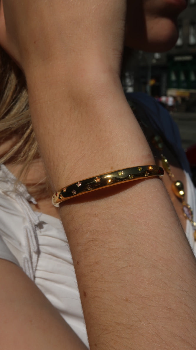 Eloise's star bangle in sunset is a slim gold bangle accented with bright red, orange, and yellow star-shaped gems. This simple yet elegant bangle is perfect to add to any stack.