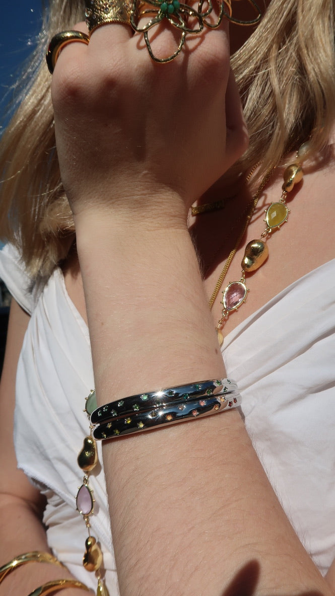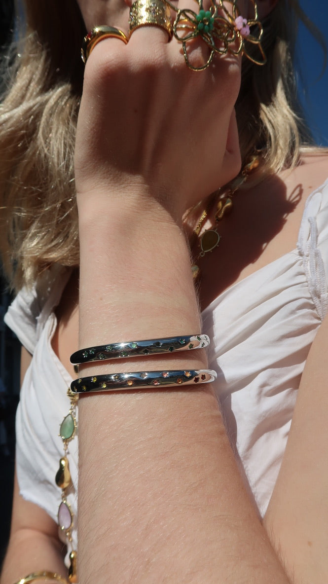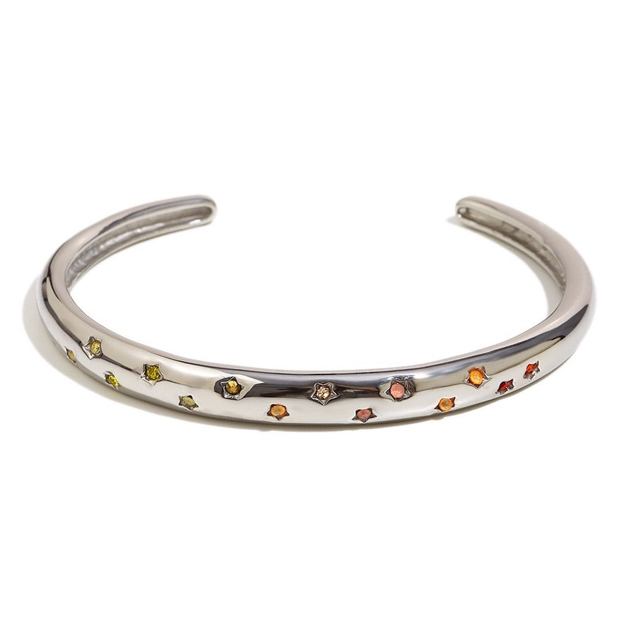 Eloise's sunset star bangle in silver is a thin silver bangle with star-shaped red, orange, and yellow gemstones. This is the perfect bangle to stack or wear on its own as a statement piece.