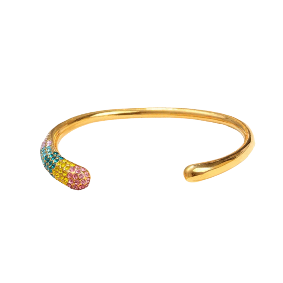 Elsie's multicoloured everyday bangle is a simple gold bangle featuring bright colourful gemstone accents on one side of the bangle. This piece is perfect to add a pop of colour to your bangle stack.