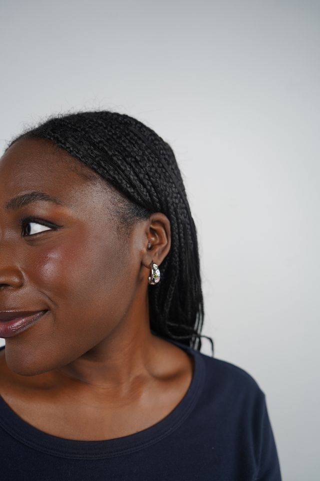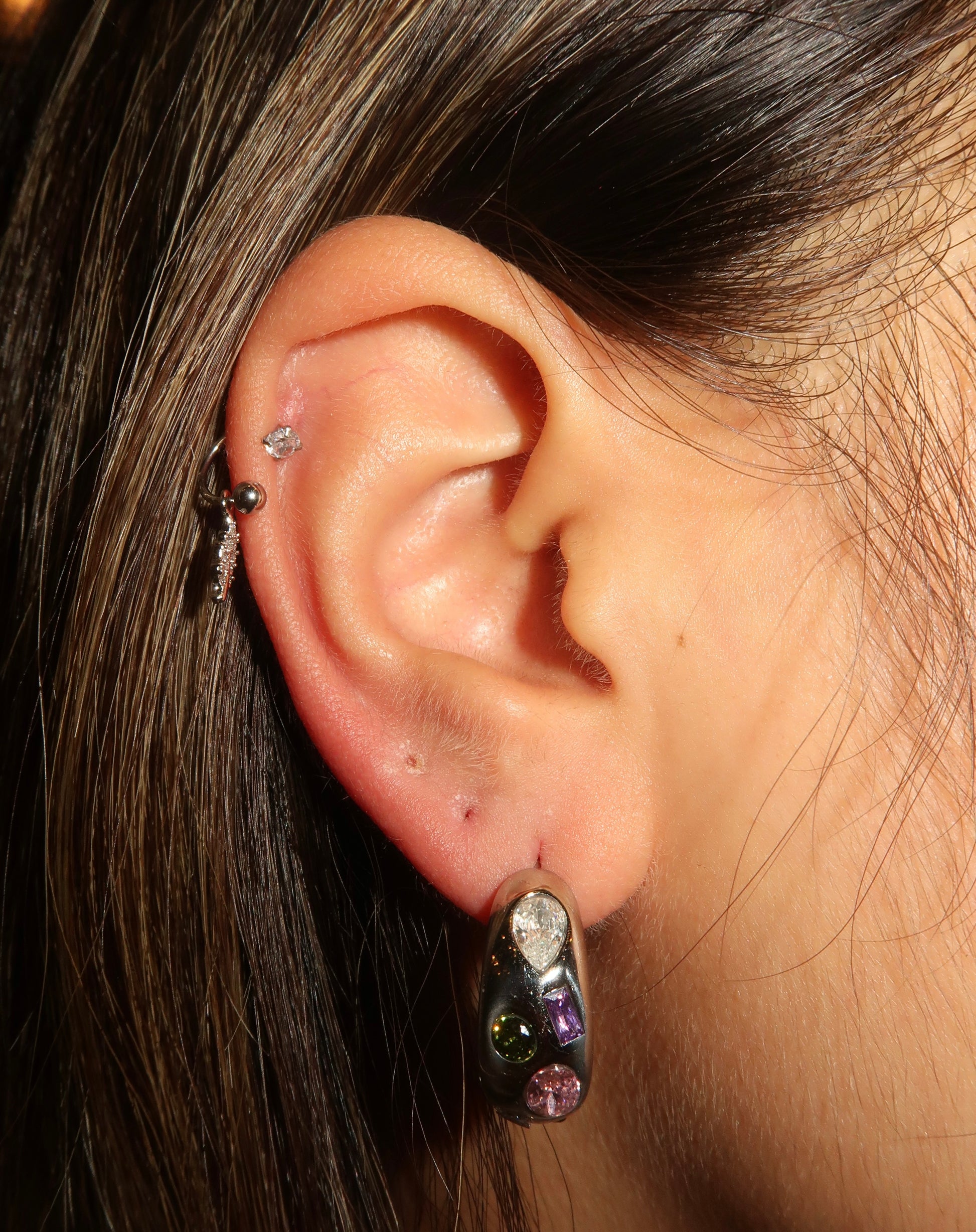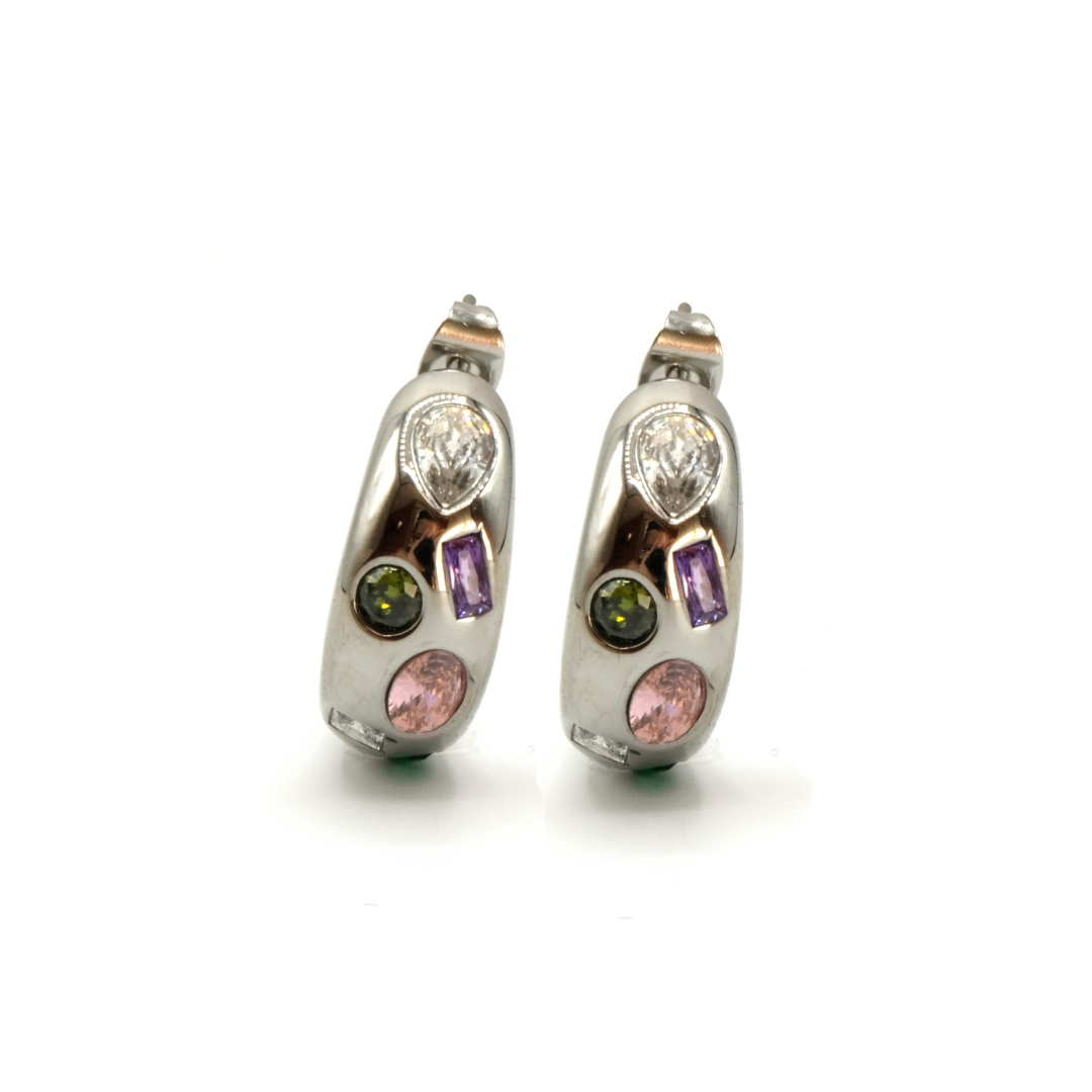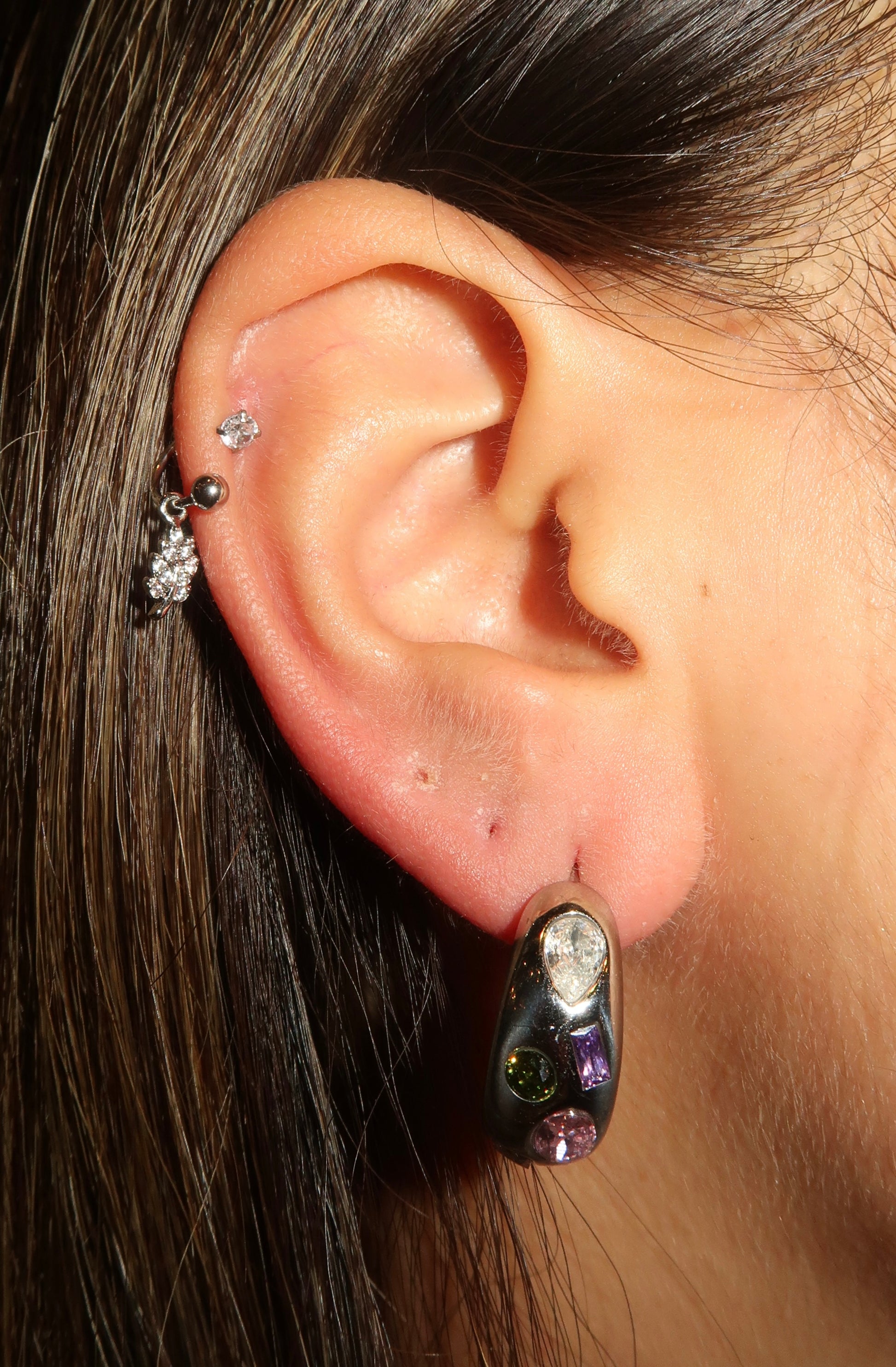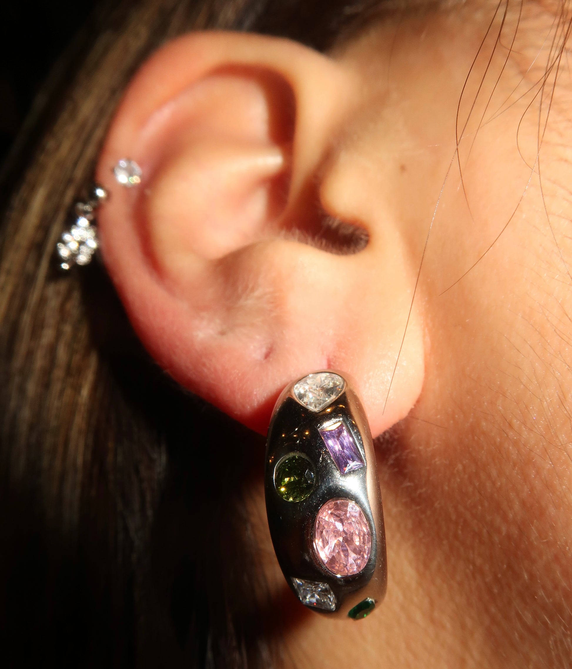 Emma's multicolored hoops are chunky silver hoops accented with gemstones of different shapes, sizes, and colours. These make the perfect statement piece that will elevate any outfit.