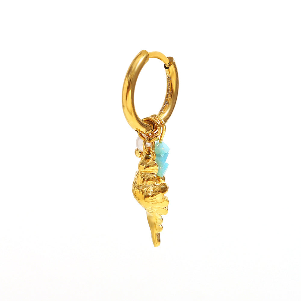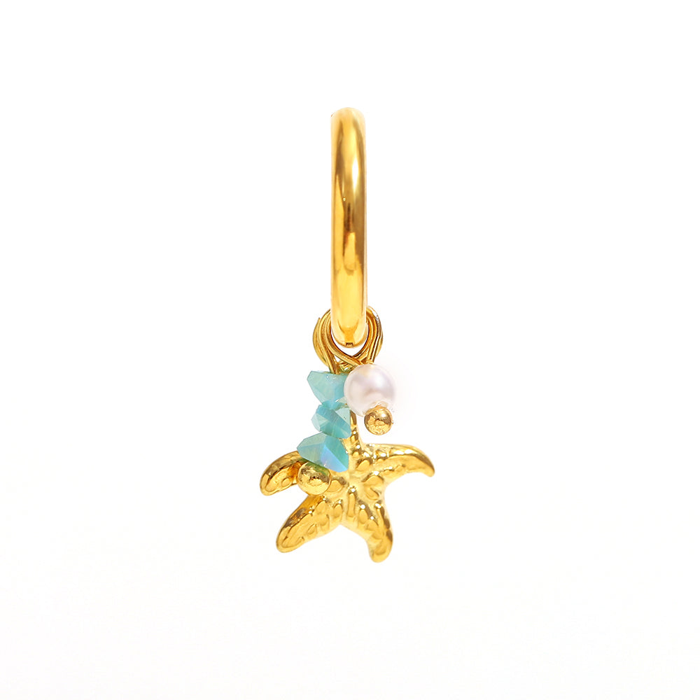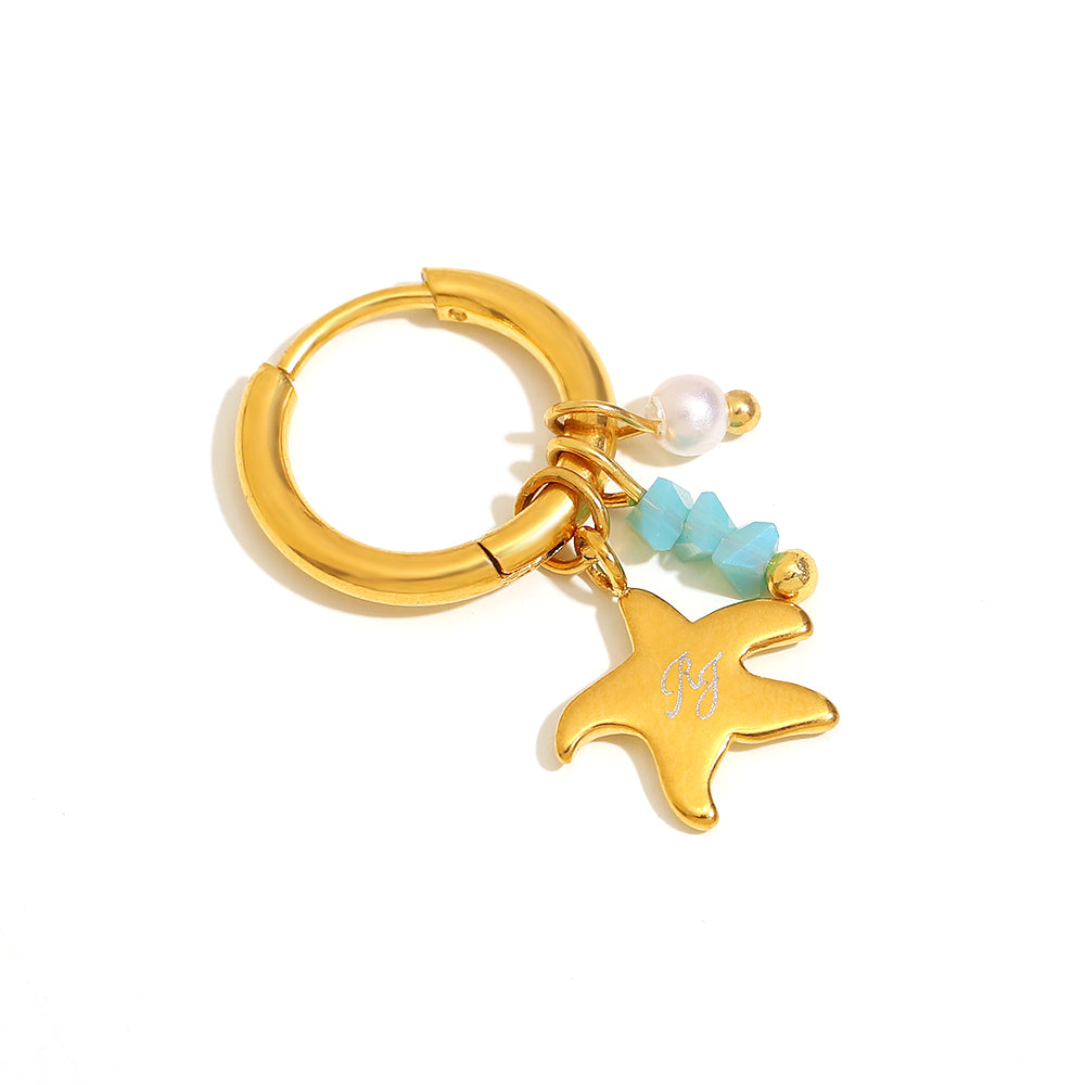 Jess’s Seaside Huggies are gold huggie earrings featuring a dainty starfish charm, freshwater pearl, and turquoise gemstone chips.