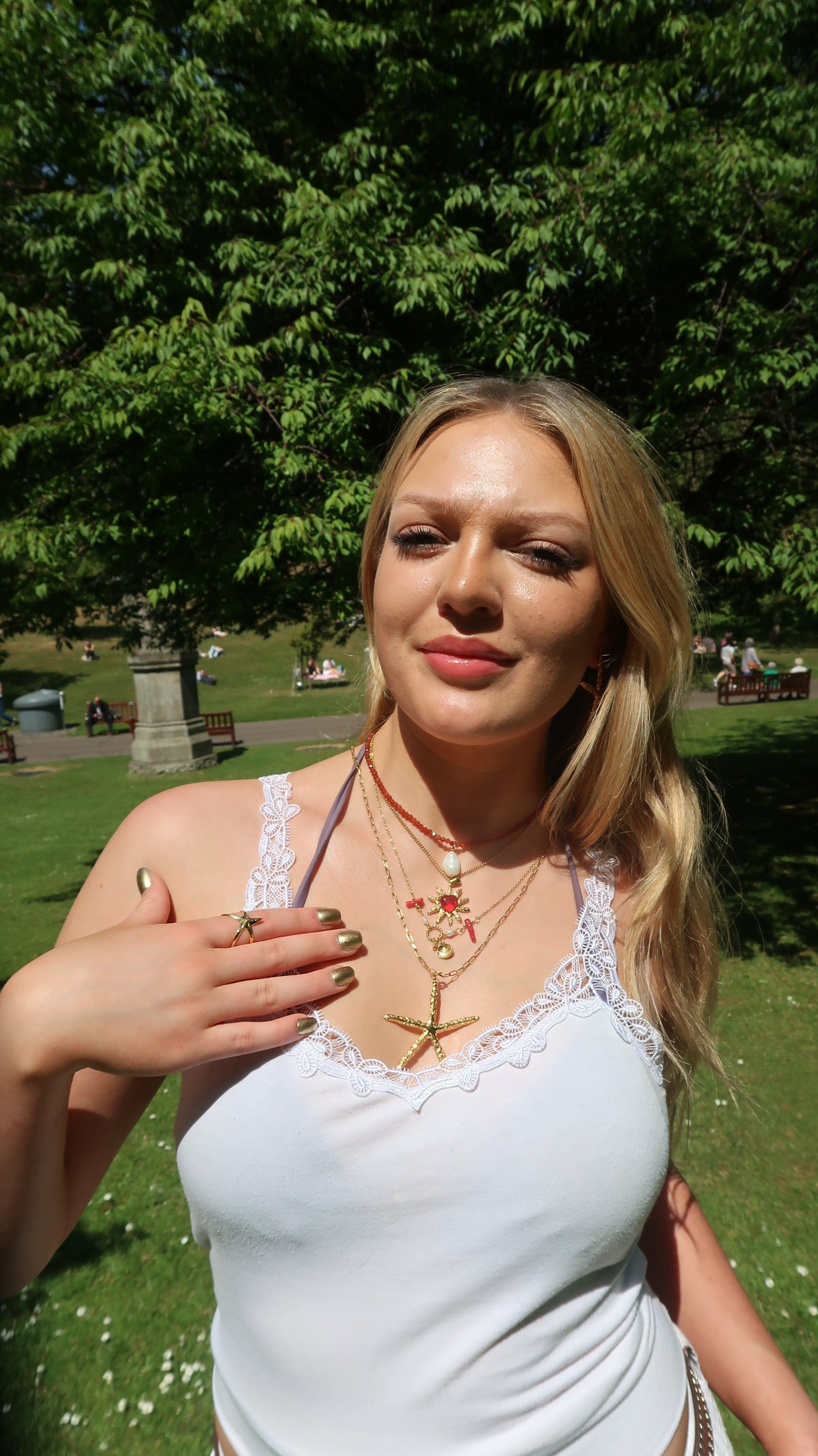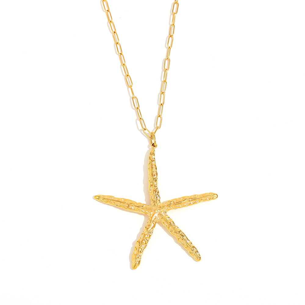 Estée's Starfish Necklace features a sculptural starfish pendant suspended from a minimalist gold link chain. Elegant yet bold, it brings a refined coastal touch to your summer wardrobe — perfect on its own or layered with your everyday favourites.