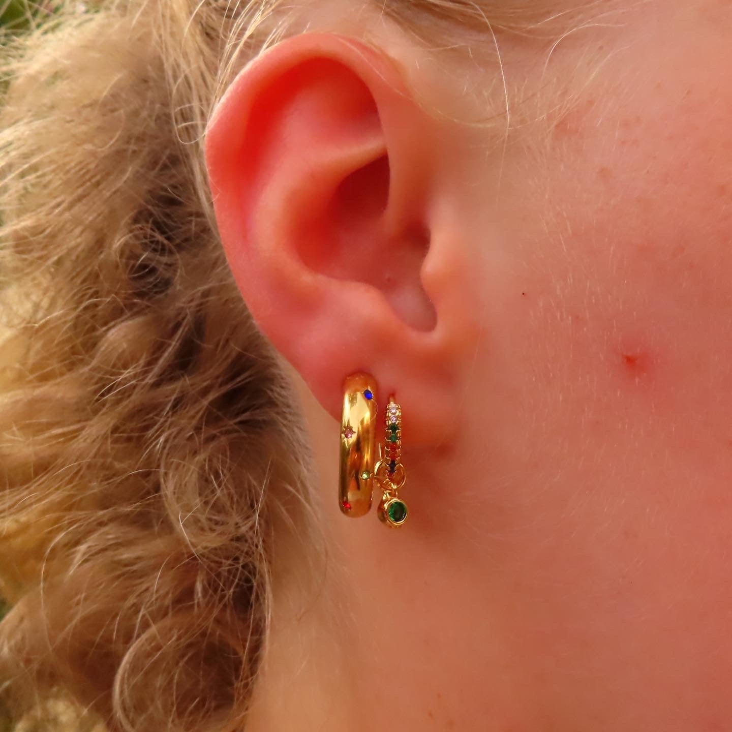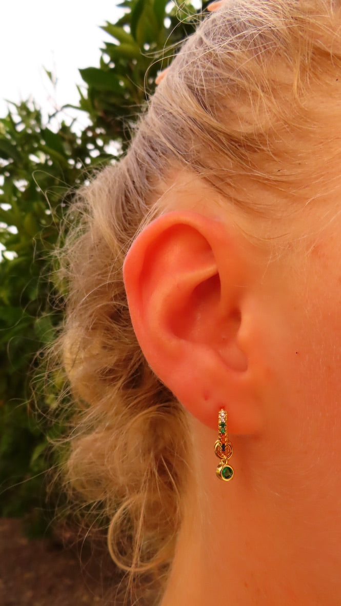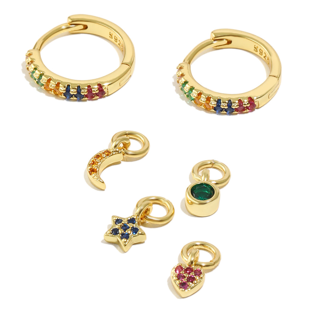 Eva's Everyday Huggies are small huggie earrings covered in colourful gemstones with four interchangeable charms. These earrings are perfect for pairing in a stack or to wear on their own.