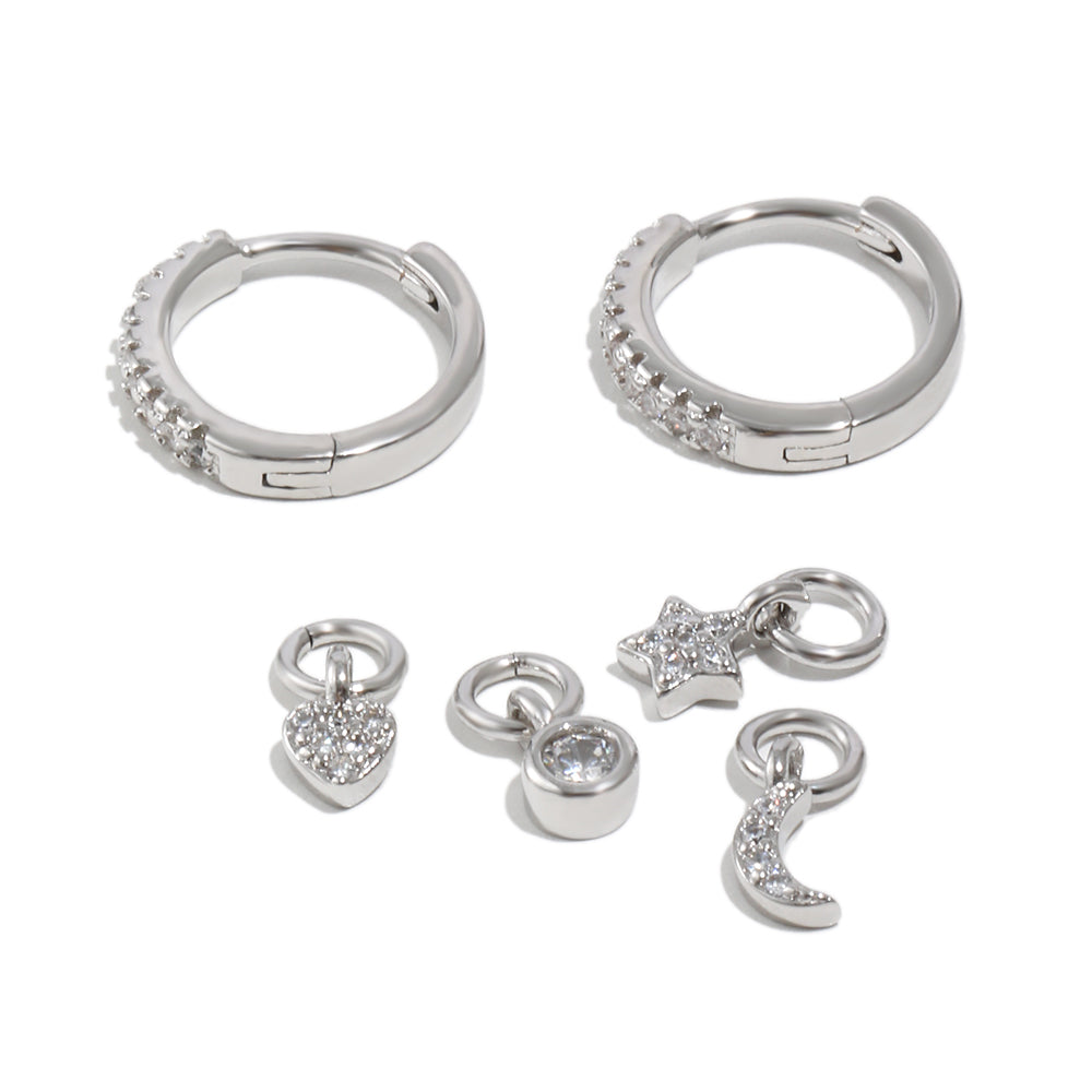 Eva's Everyday Silver Huggies are small silver huggie earrings covered in colourful gemstones with four interchangeable charms. These earrings are perfect for pairing in a stack or to wear on their own.