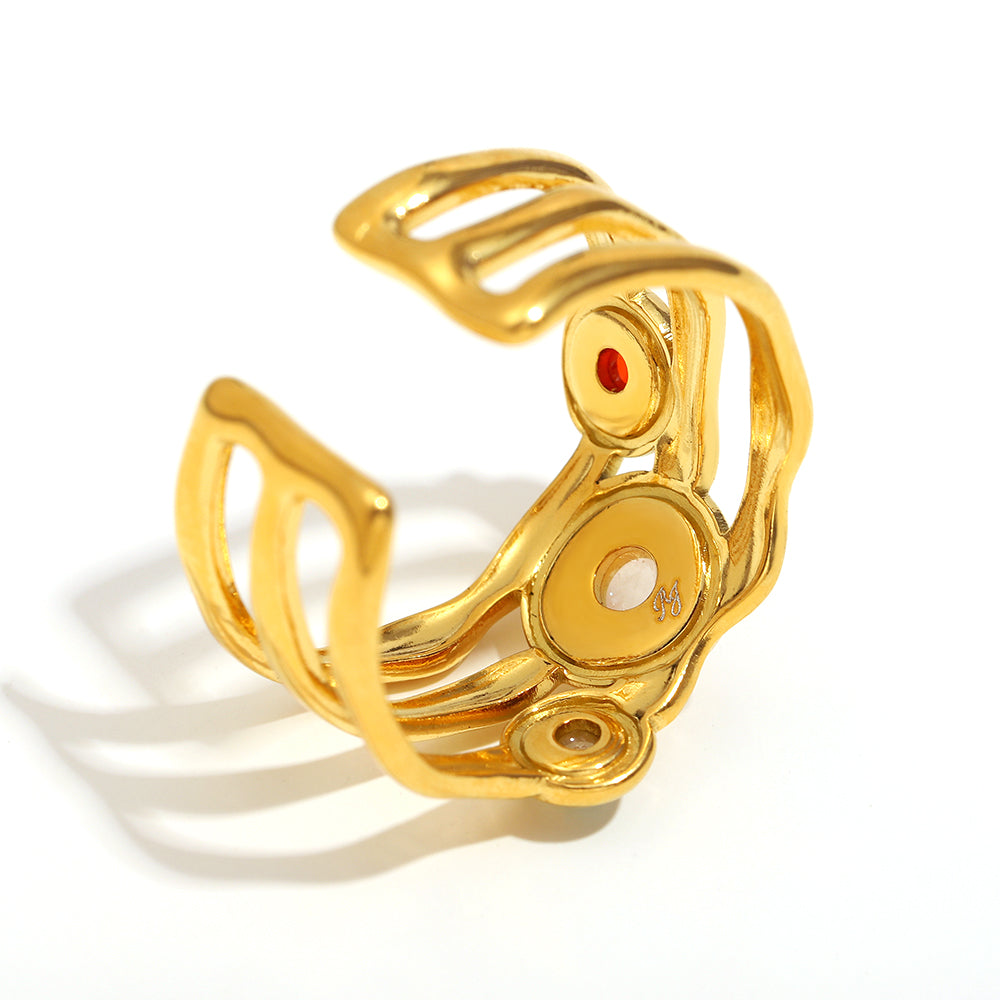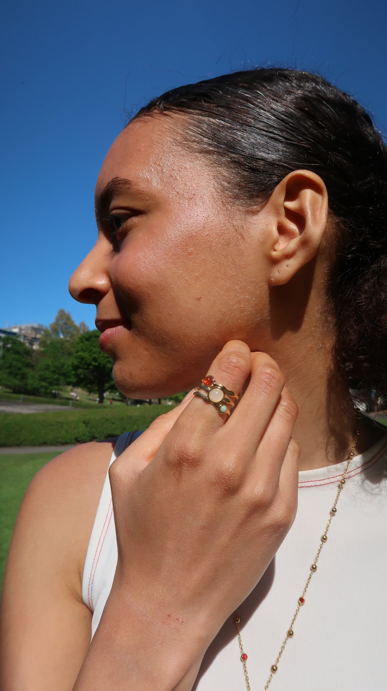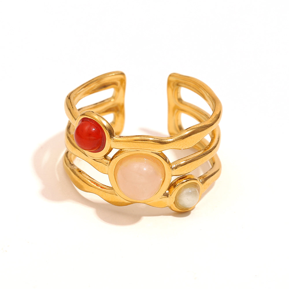 Crafted with three natural gemstones — rose quartz, red agate and green aventurine — this ring adds just the right pop of colour.