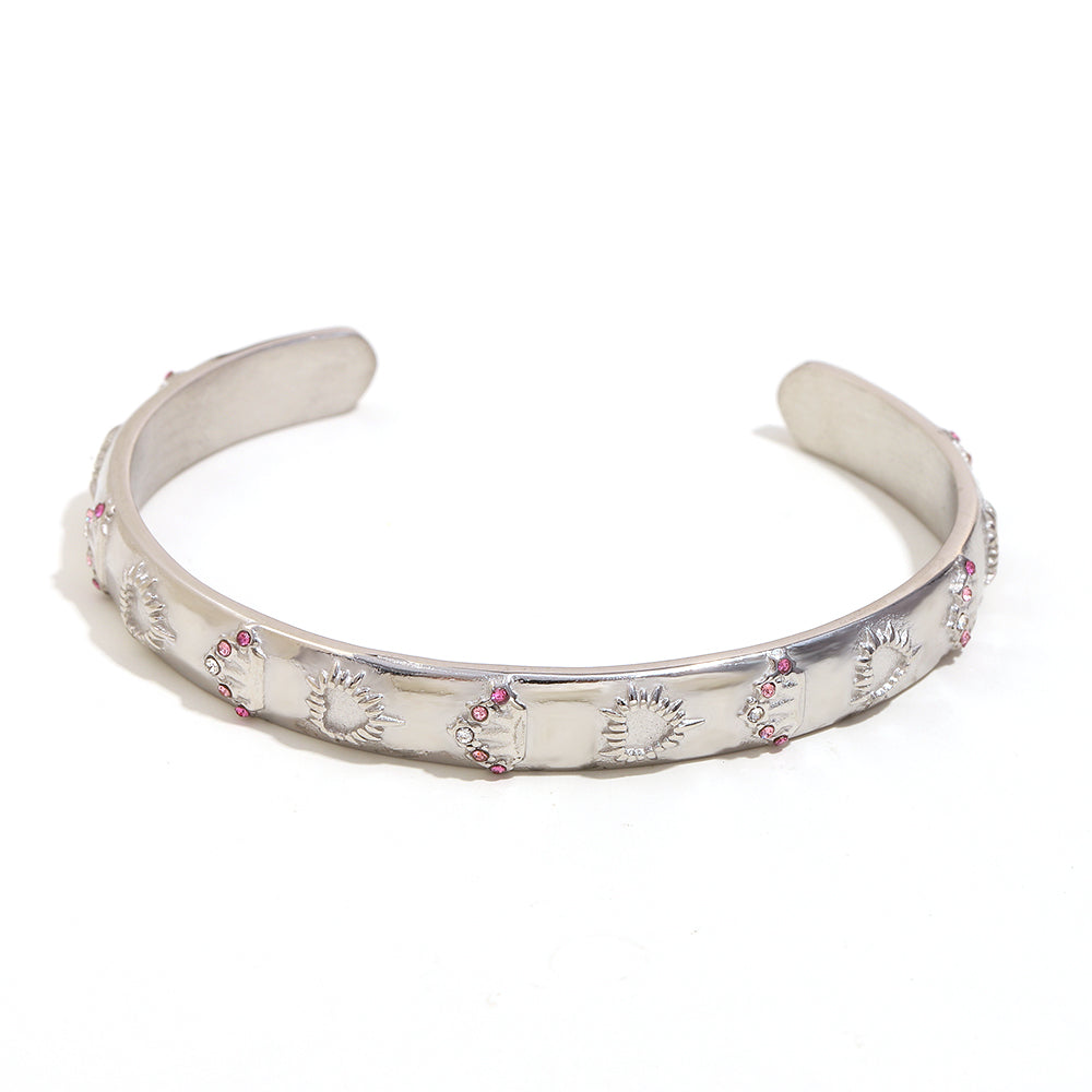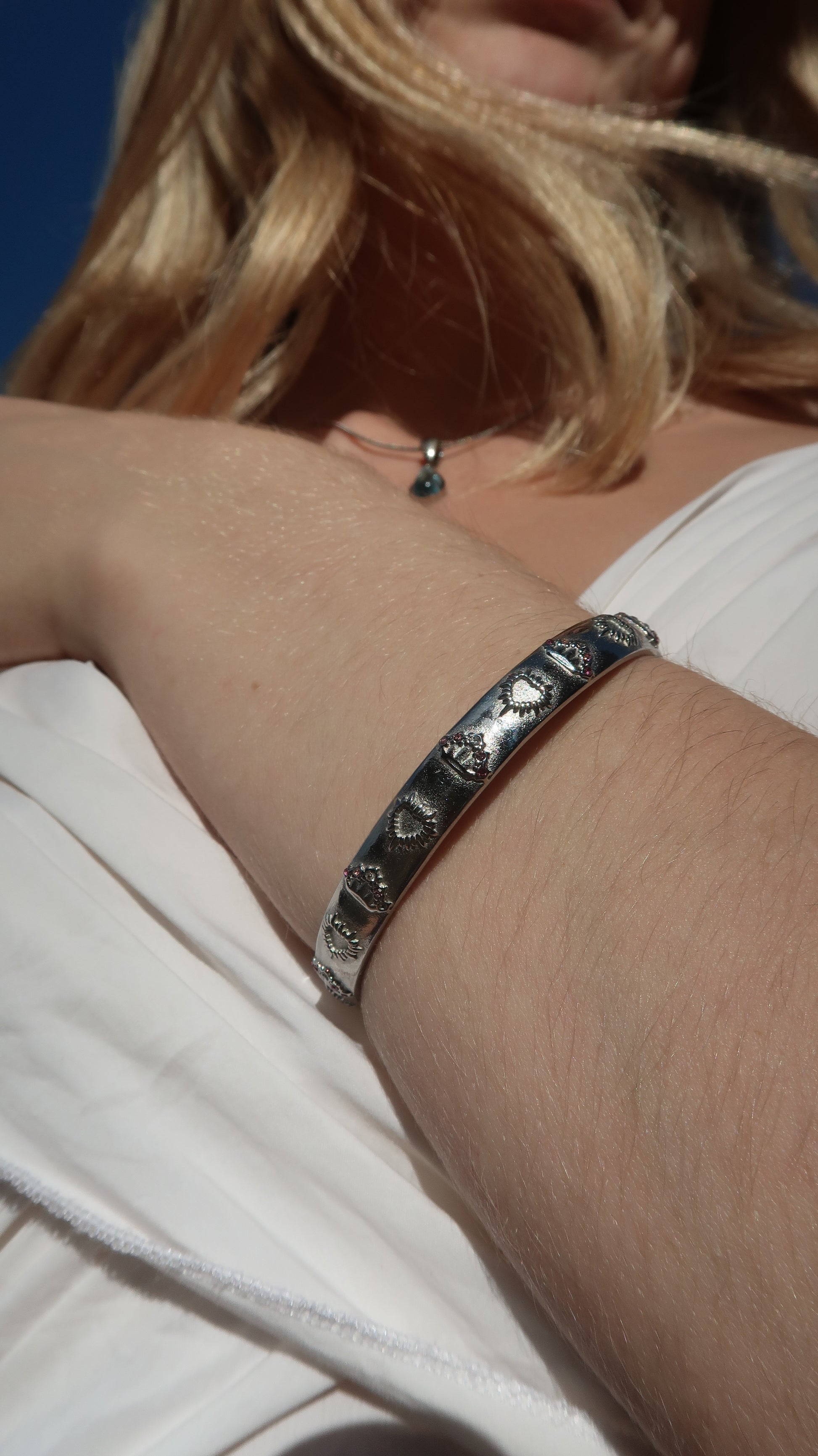 Giselle’s Bangle is a silver bangle featuring repeating tiara and heart motifs, accented with tiny pink crystals. A delicate yet standout piece to elevate any look.