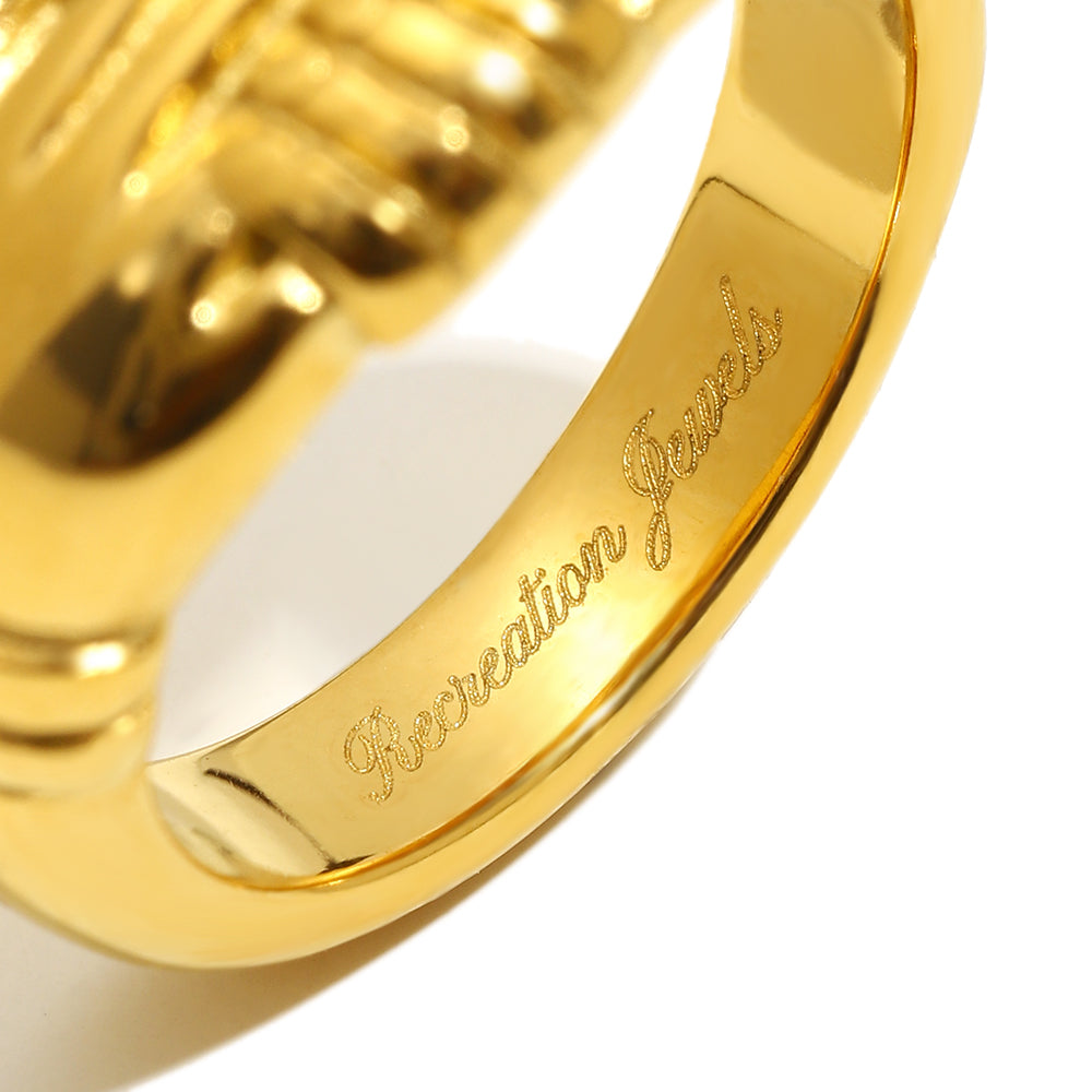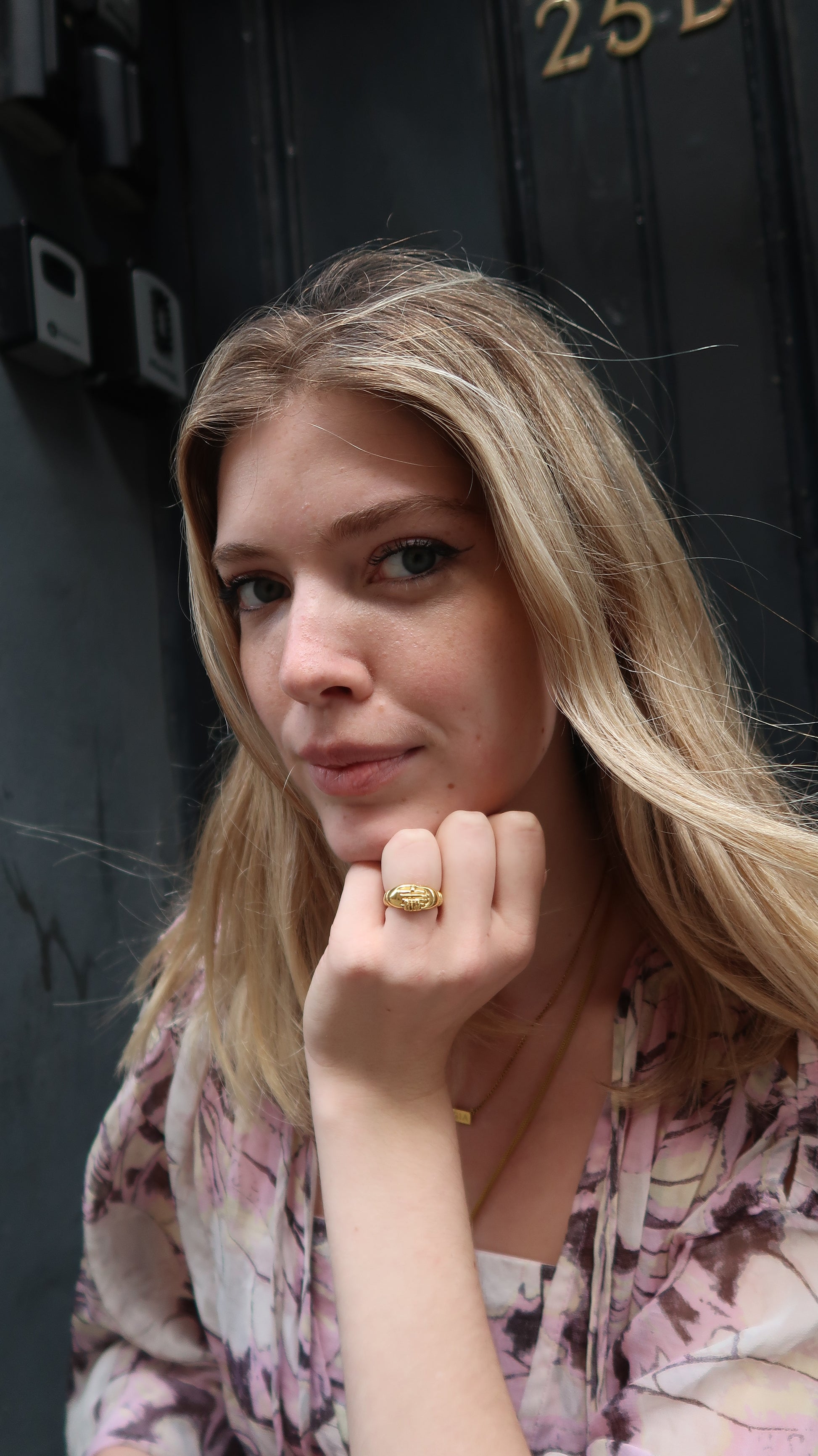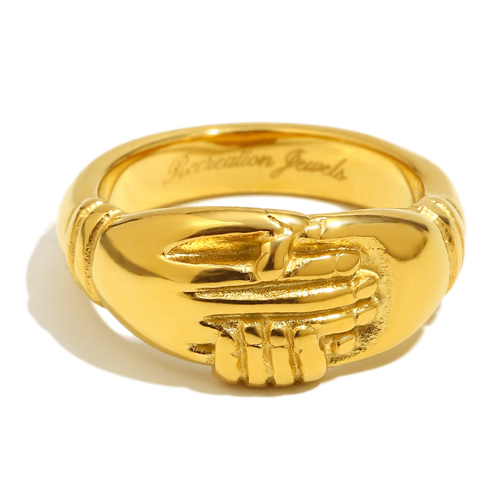 Hannah's gold ring is a gold ring in the shape of interlaced hands. This is the perfect simple yet unique ring to add to any stack.