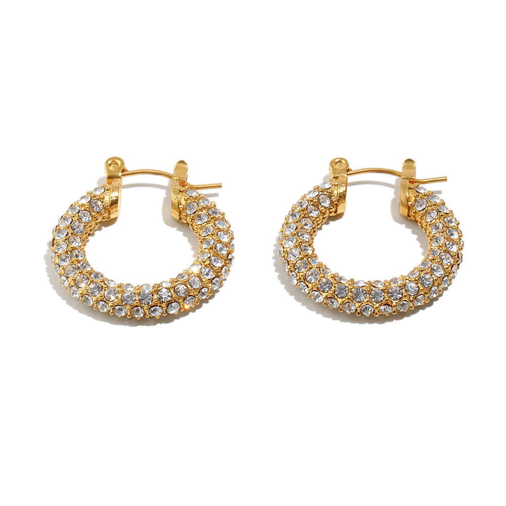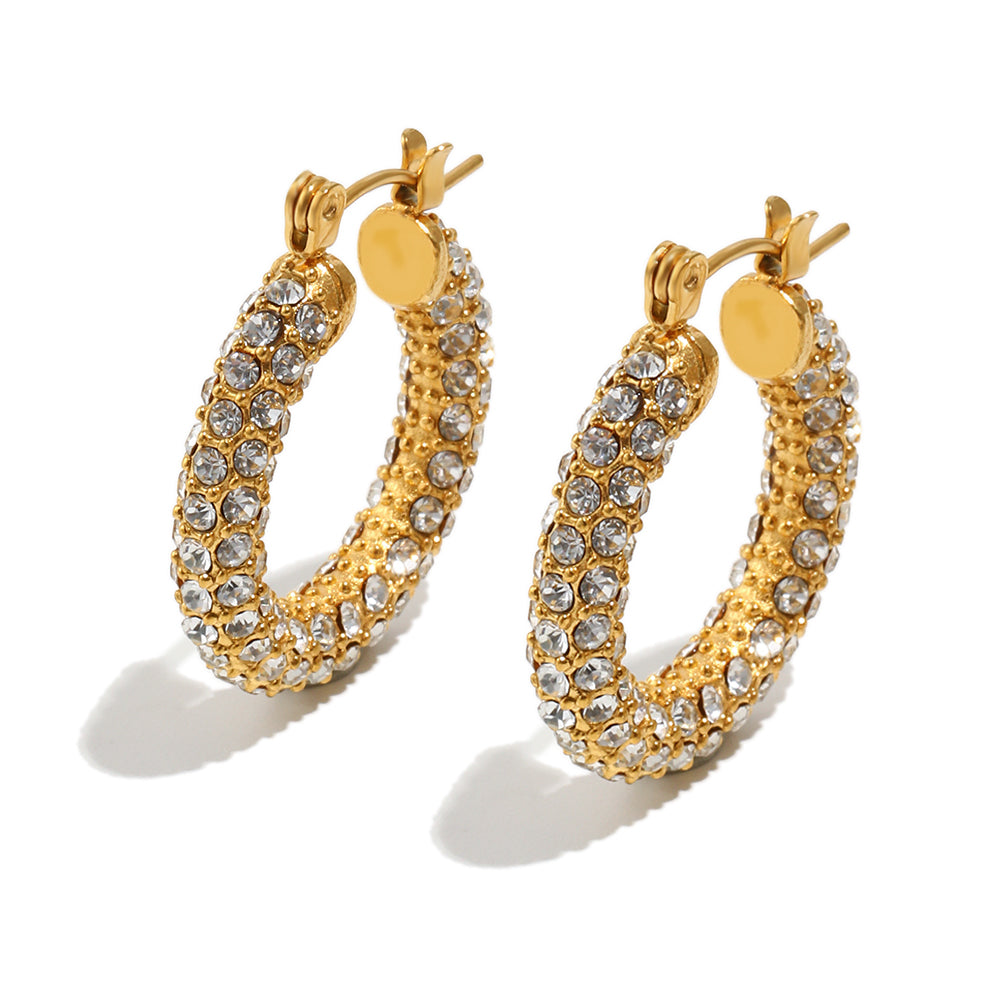 Harriet's White Hoops are small hoop earrings encrusted with bright white gemstones. These are Perfect for adding a bit of sparkle to your everyday style or dressing up for a night out.