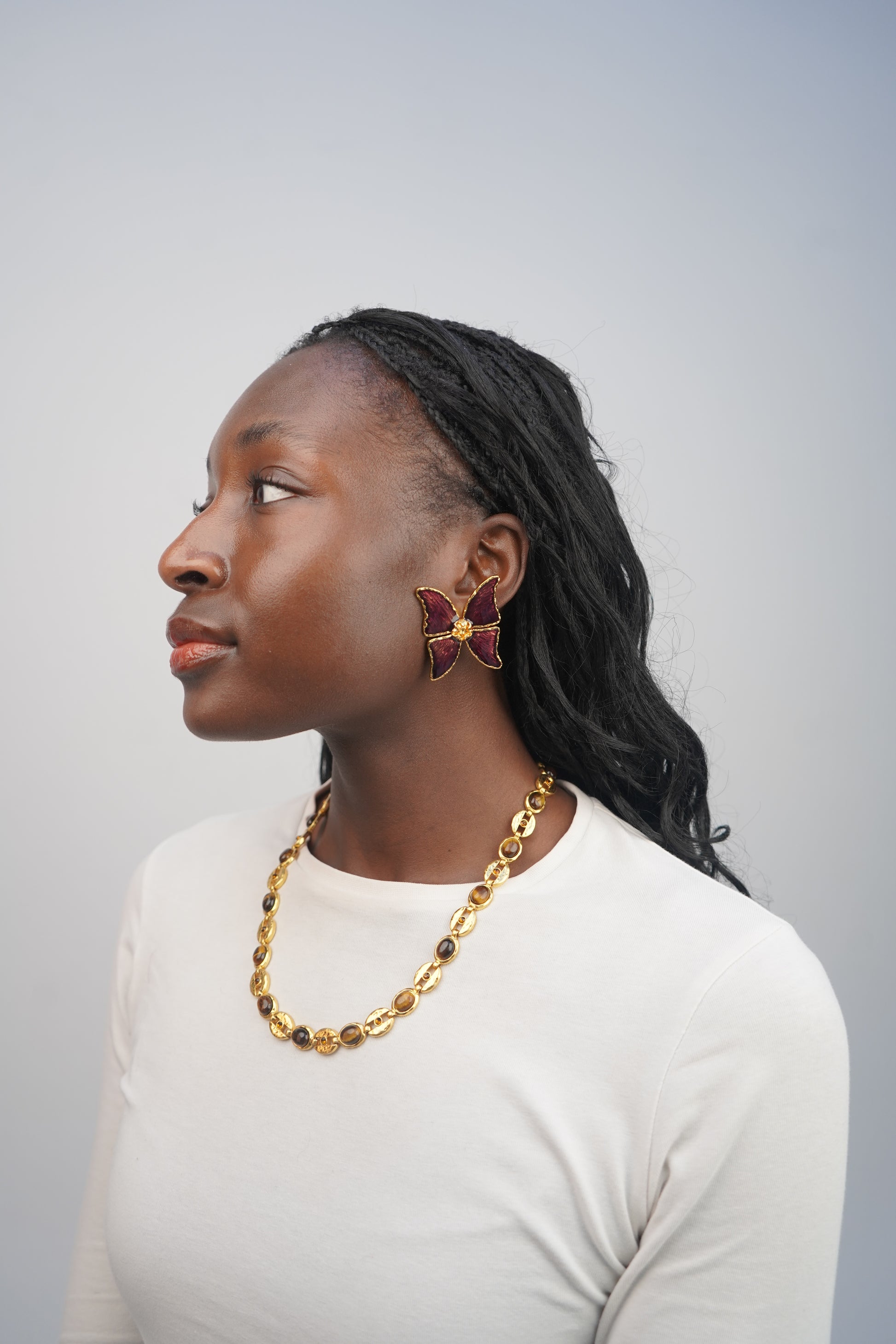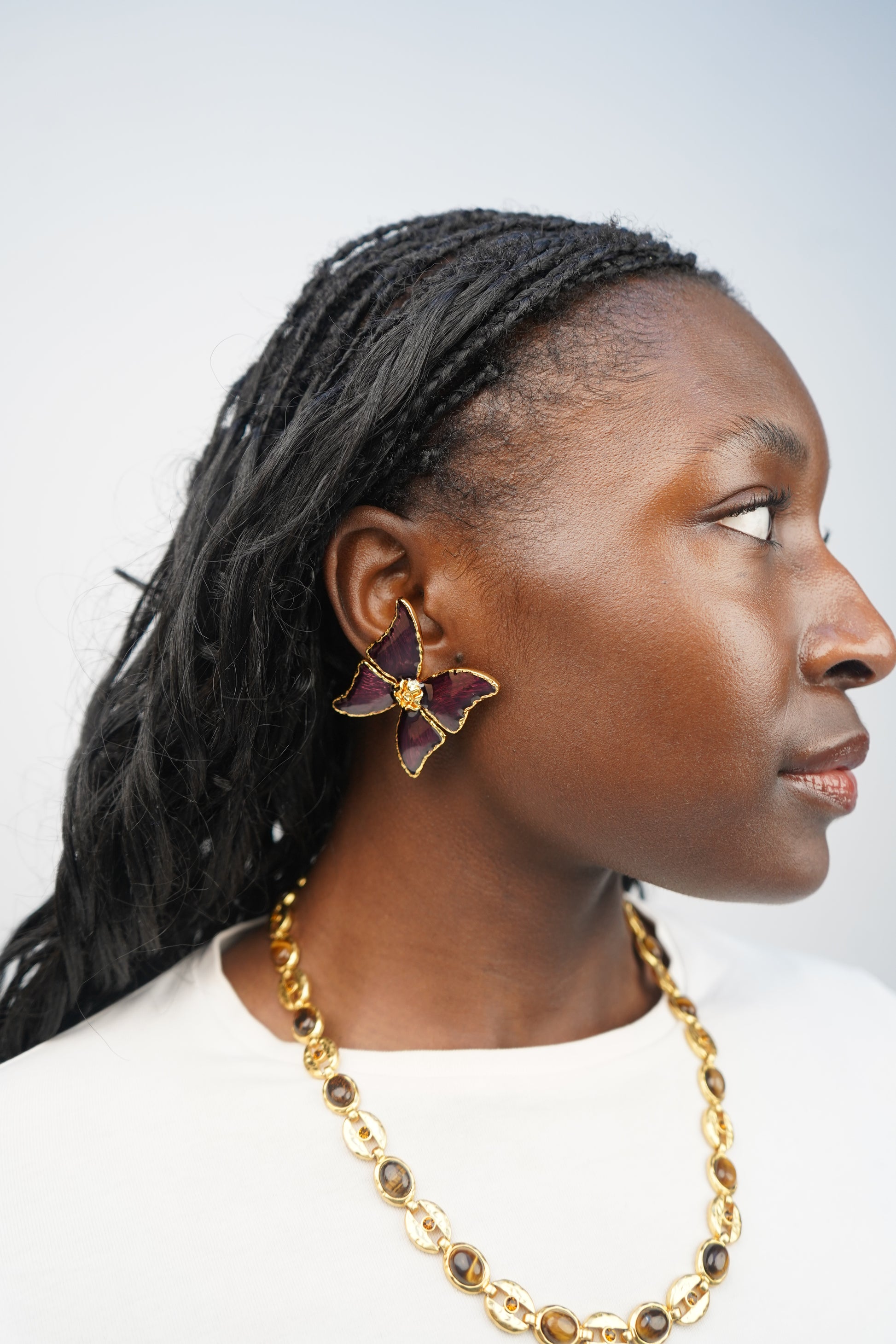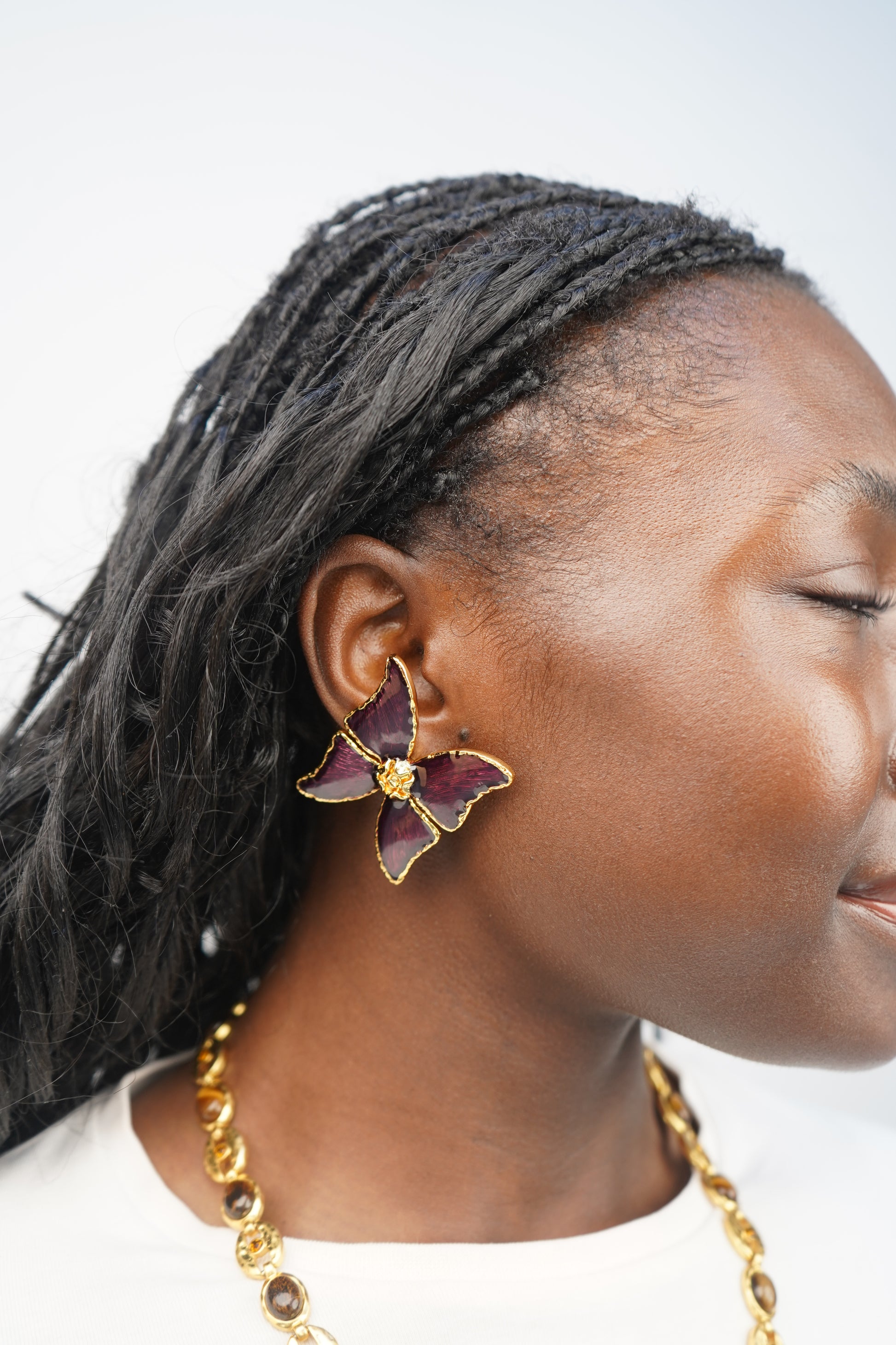 Heather's butterfly clip ons are large, purple butterfly shaped clip on earrings. These earrings are the perfect bold statement piece that can be worn with or without pierced ears.