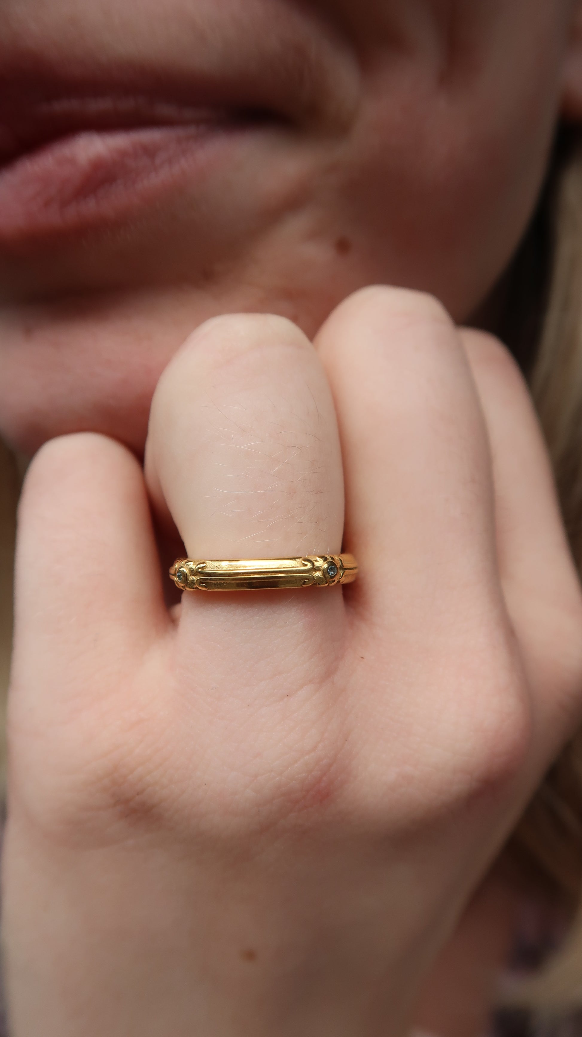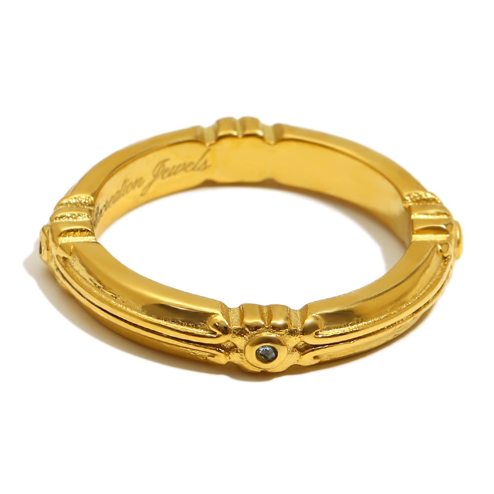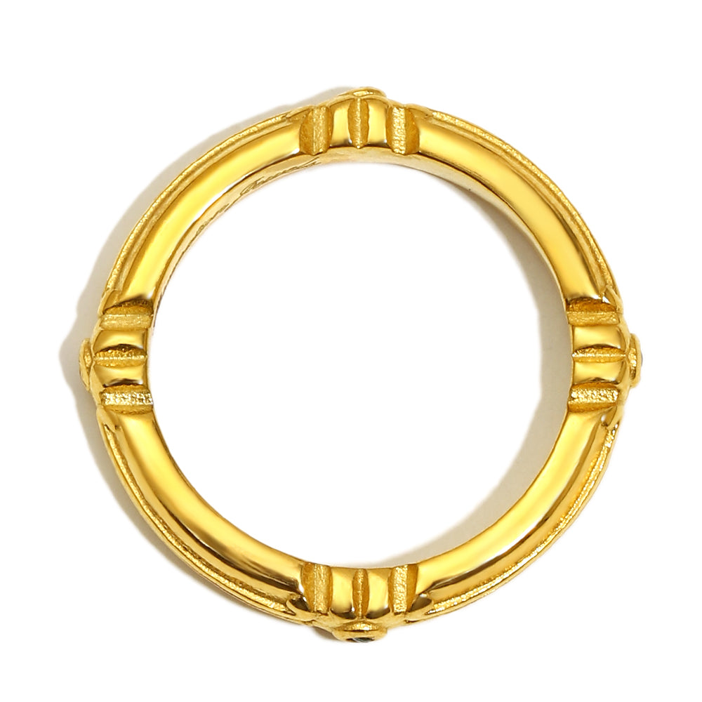 Honor's gold ring is a thin gold ring with ridged detailing and four small blue gemstone accents. This is the perfect ring to stack or wear in a simple and dainty minimalist look.