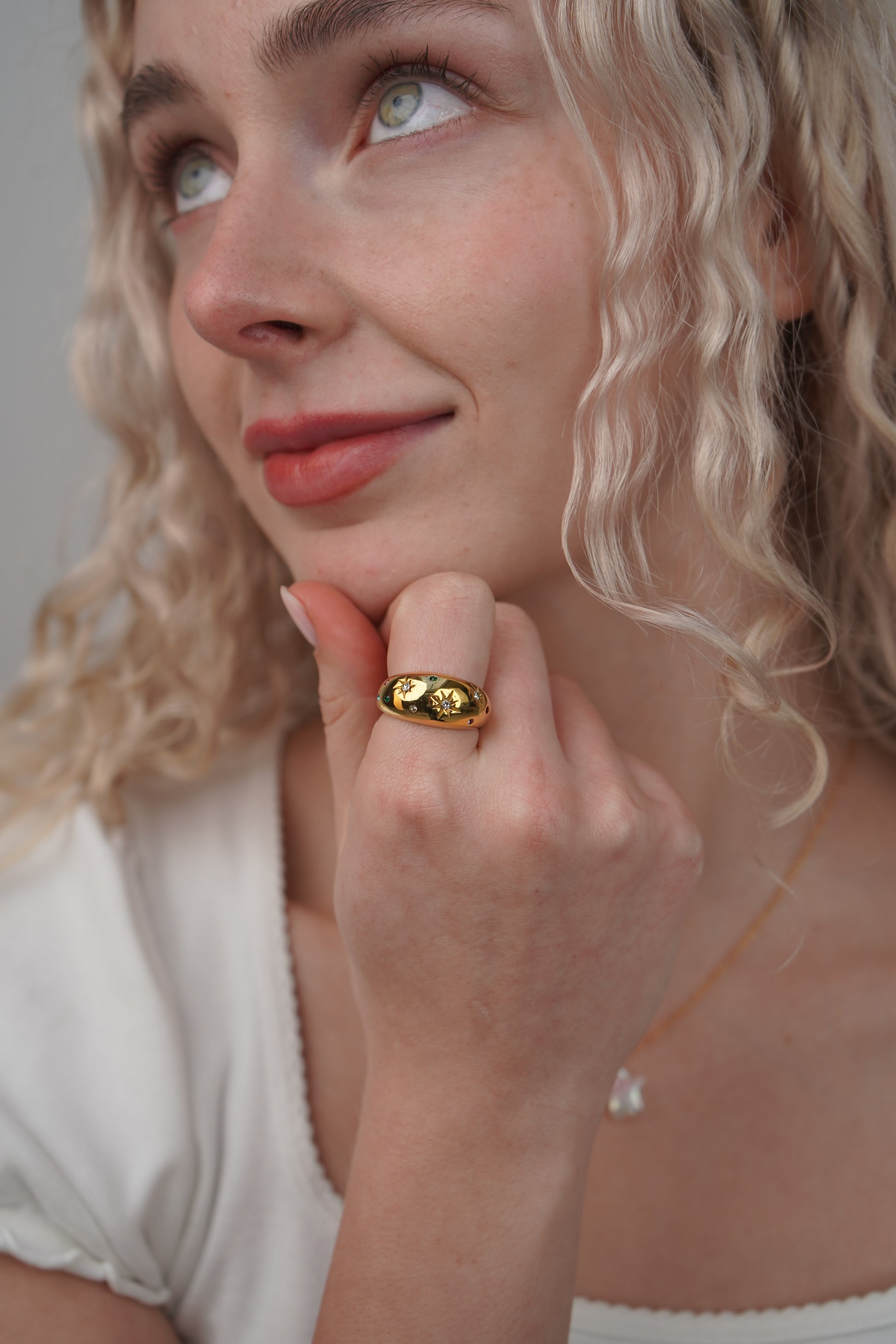 India’s Star Ring is a chunky gold ring that features intricately engraved stars embedded with multicolored gems and twist detailing. This is the perfect ring to add to a maximalist stack.