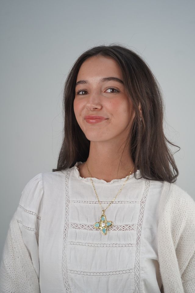 Irene's Cross Necklace is a unique design that features a Green Howlite Stone Pendant with a single Gold Electroplated Pearl Cross, offering an exclusive blend of elegance and individuality. This is the perfect statement necklace to add a pop of colour to any look.