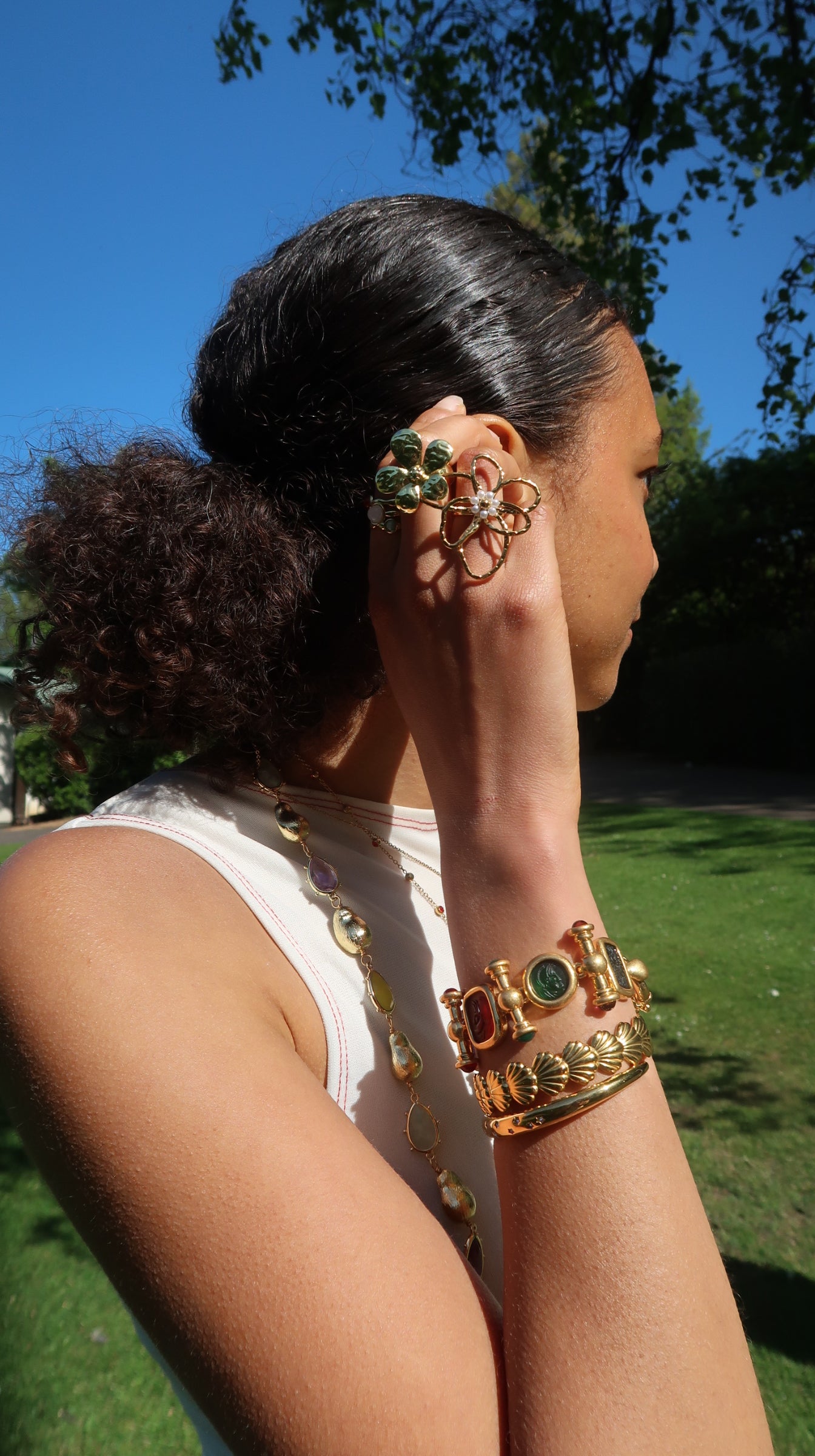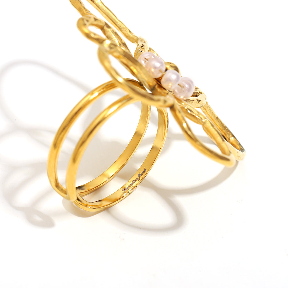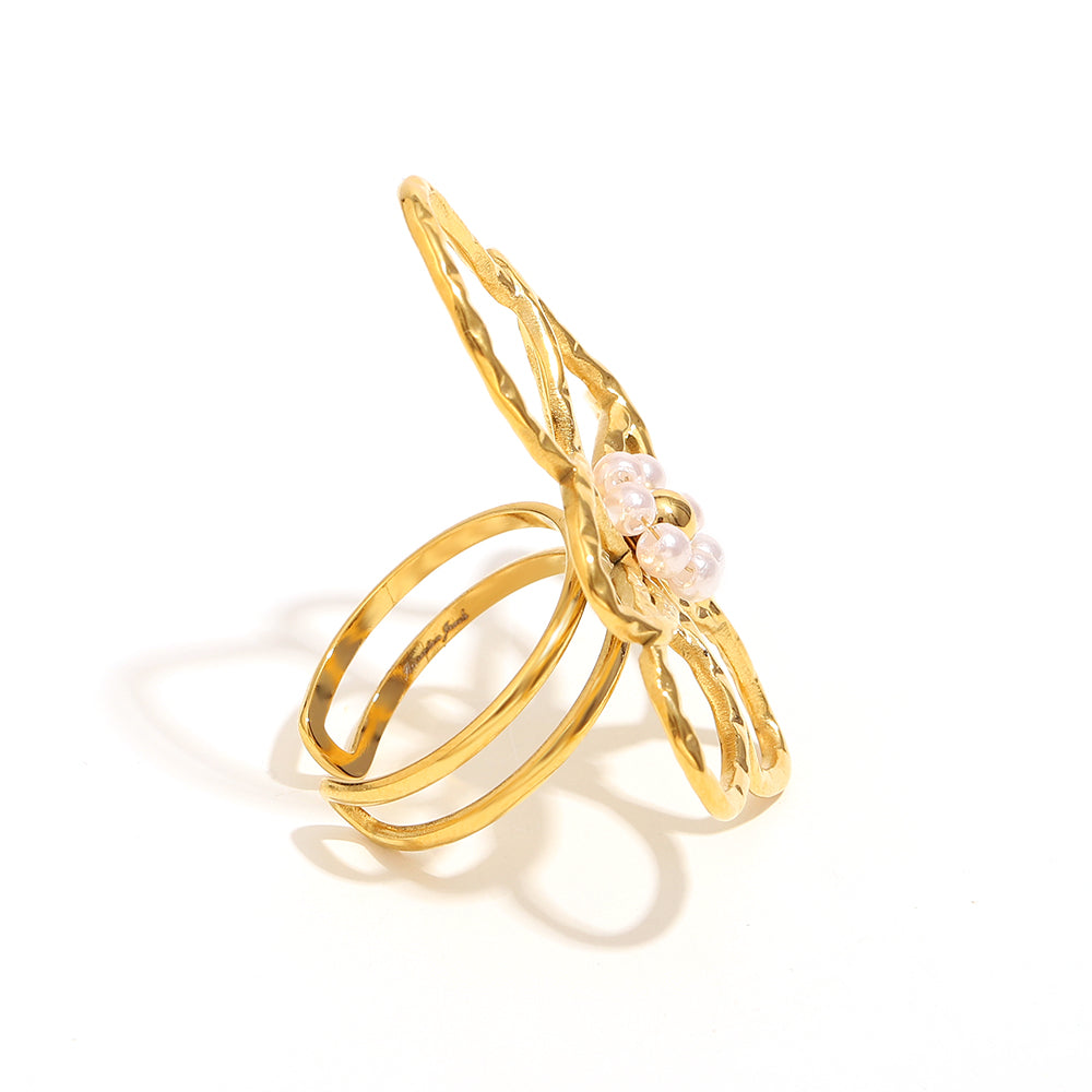 This sculpted flower ring is finished with soft pearl accents and open hammered petals for a light, airy feel. Eye-catching but easy to wear, it adds the perfect touch of gold to summer styling.