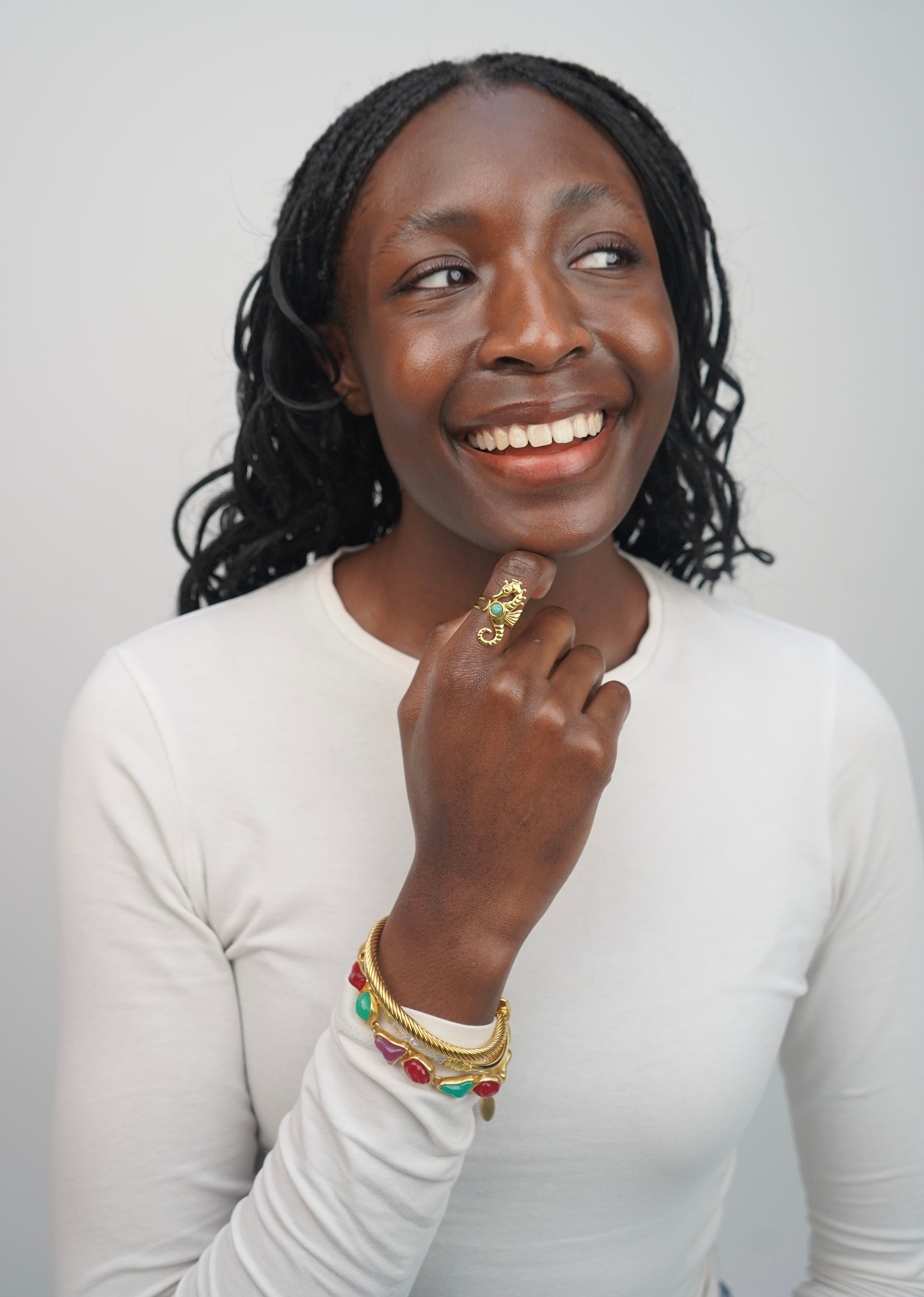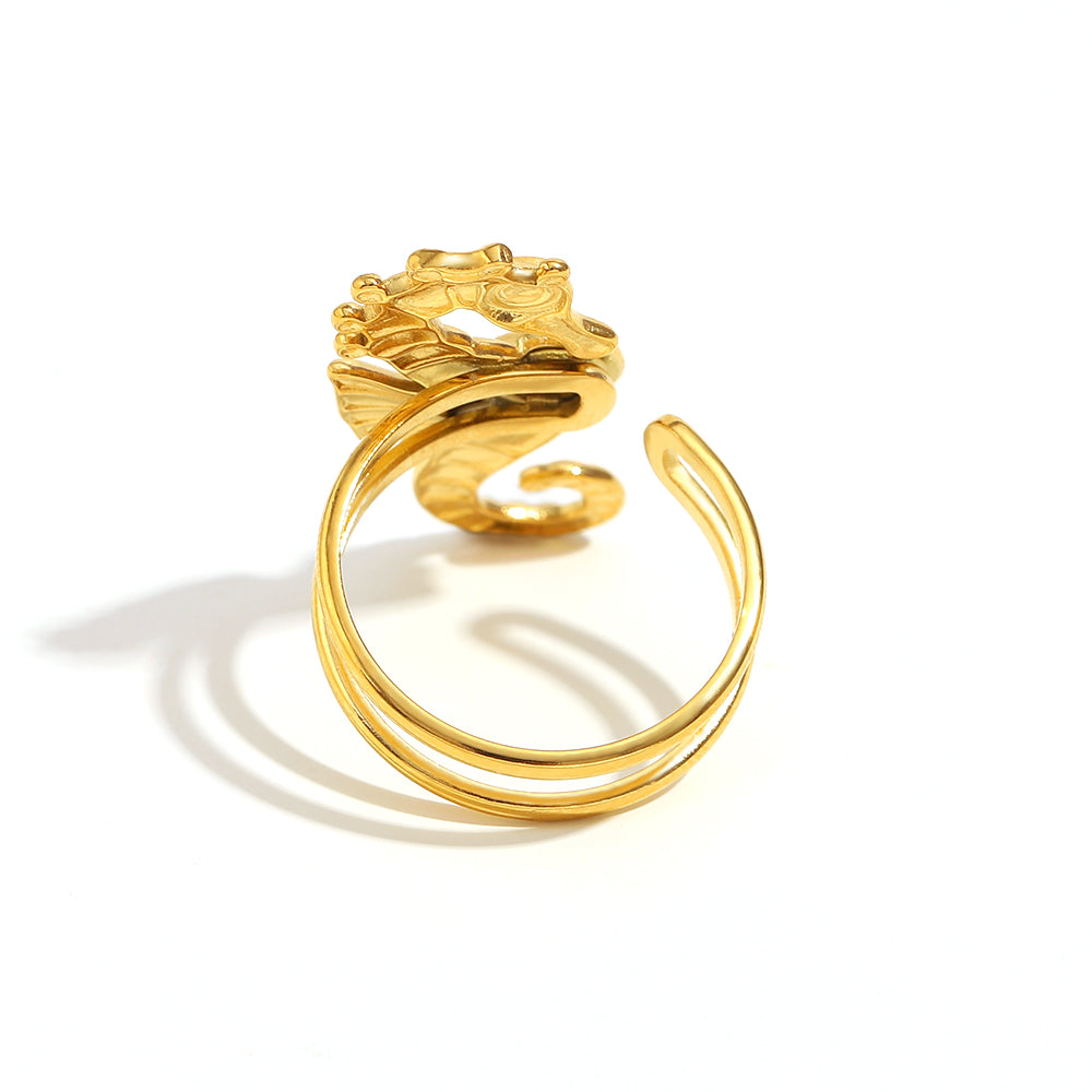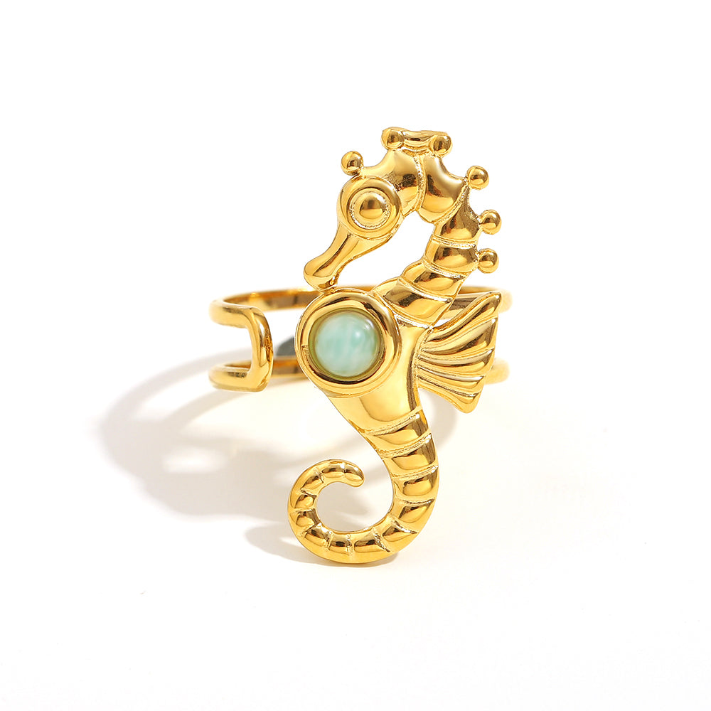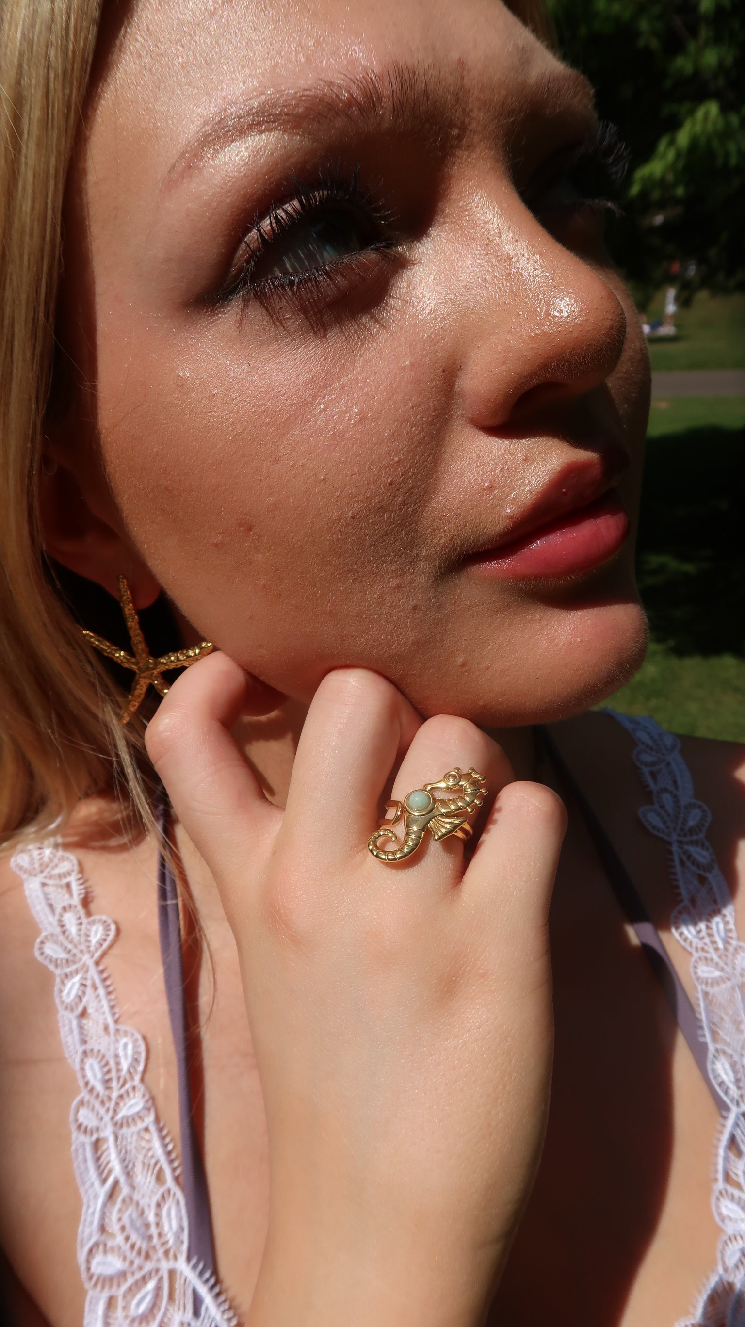 Isla’s Seahorse Ring is a gold adjustable ring featuring a playful seahorse design with a glossy light blue gemstone at its centre.