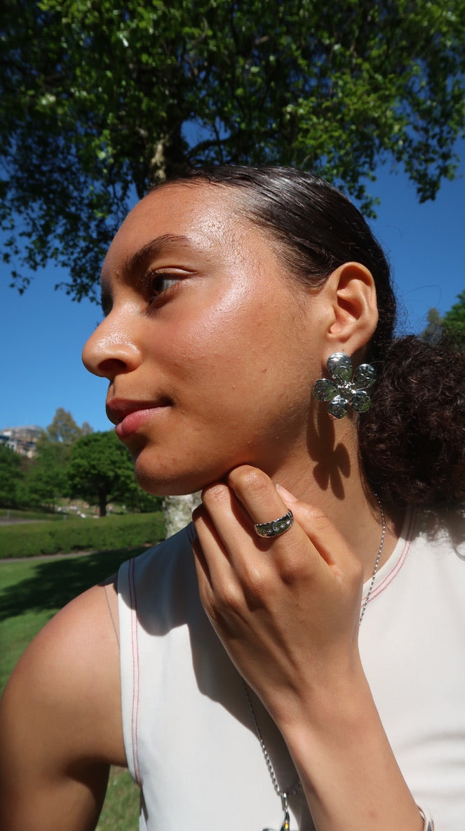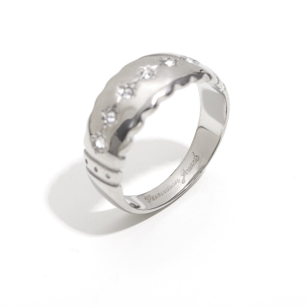 Isla's Star Ring is a chunky silver ring with scalloped edges featuring an arrangement of white gemstones with star detailing.