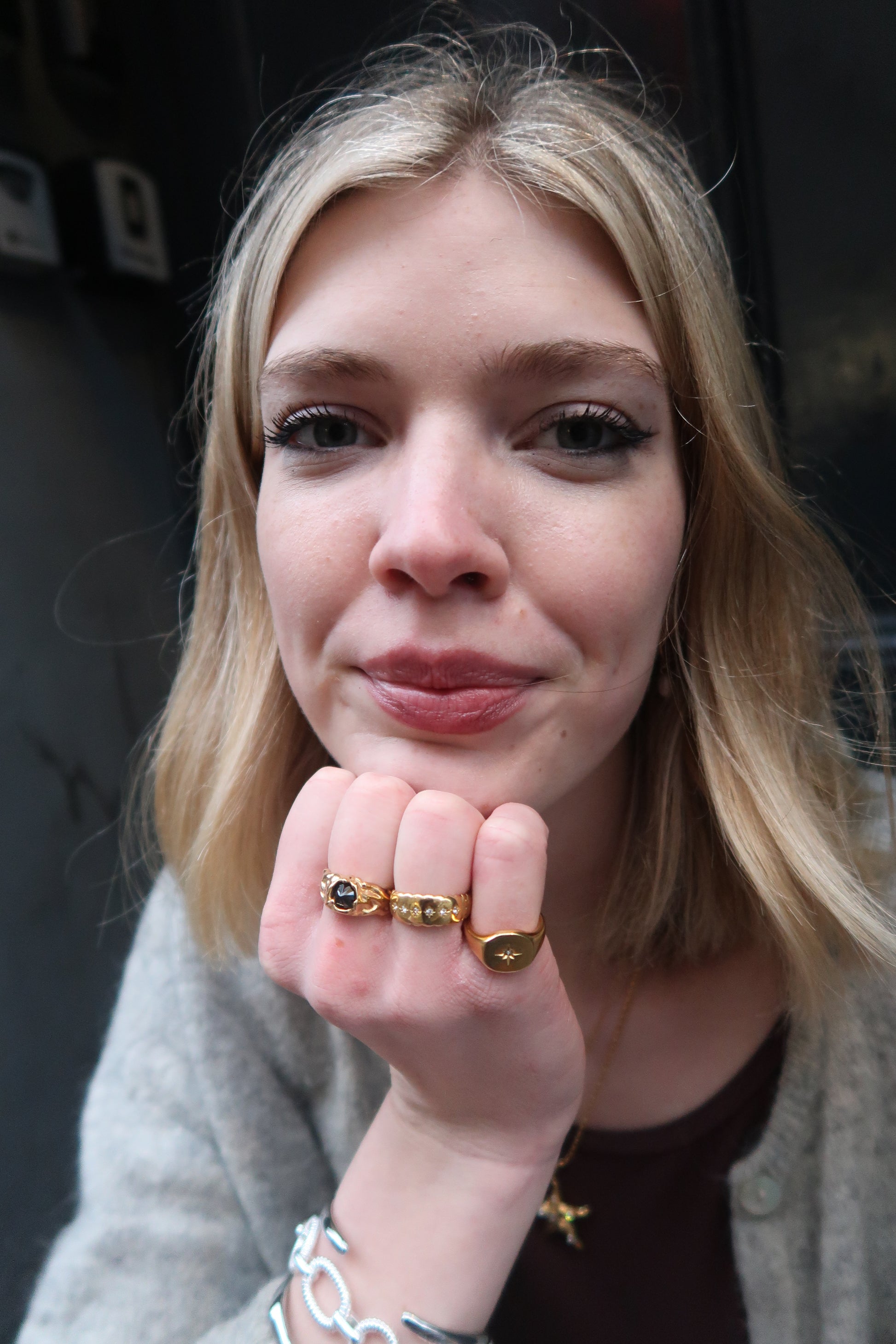 Isla's star ring is a chunky gold ring with scalloped edges featuring an arrangement of white gemstones with star detailing.