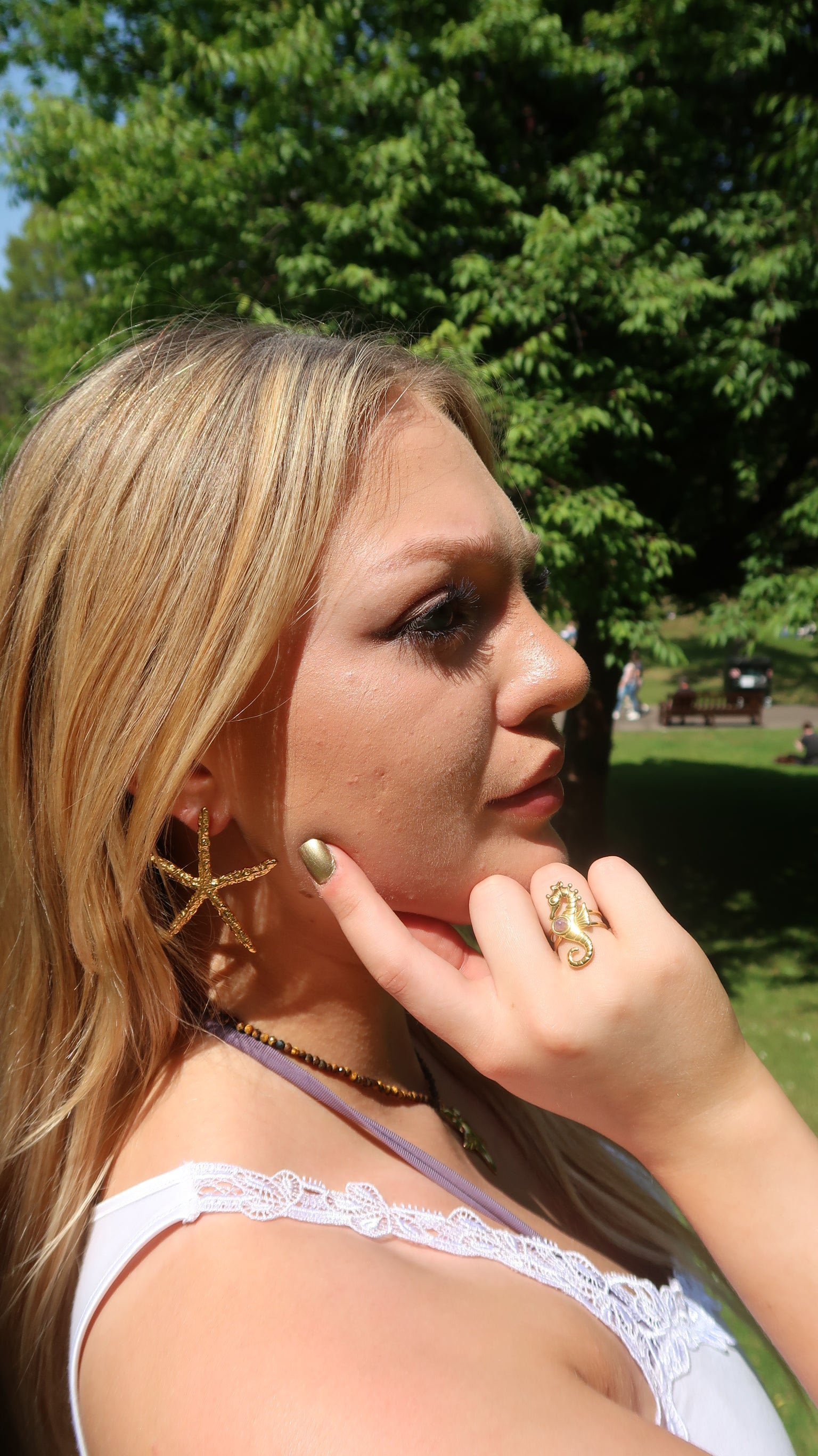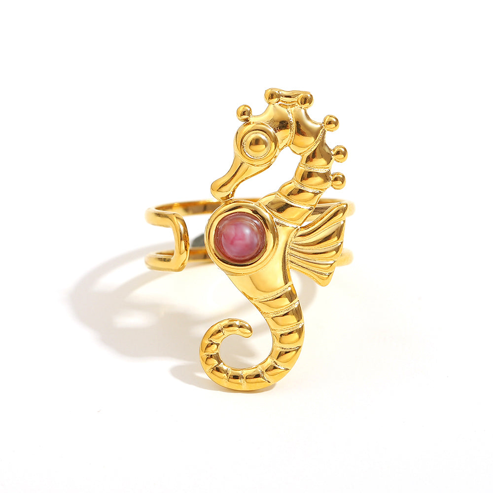 Isla’s Seahorse Ring is a gold adjustable ring featuring a playful seahorse design with a glossy pink gemstone at its centre.