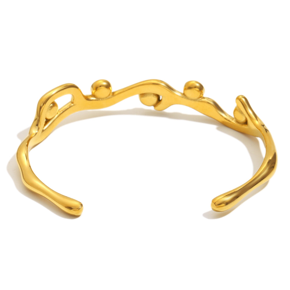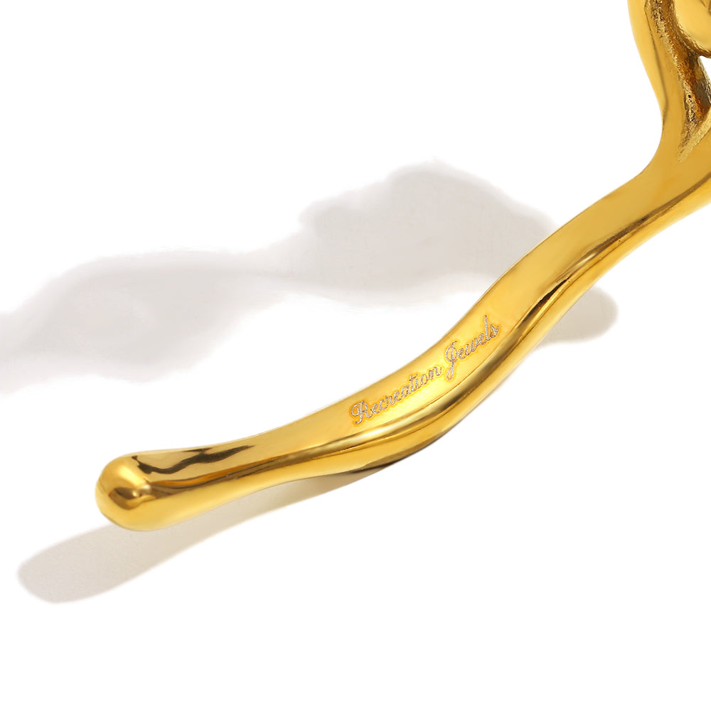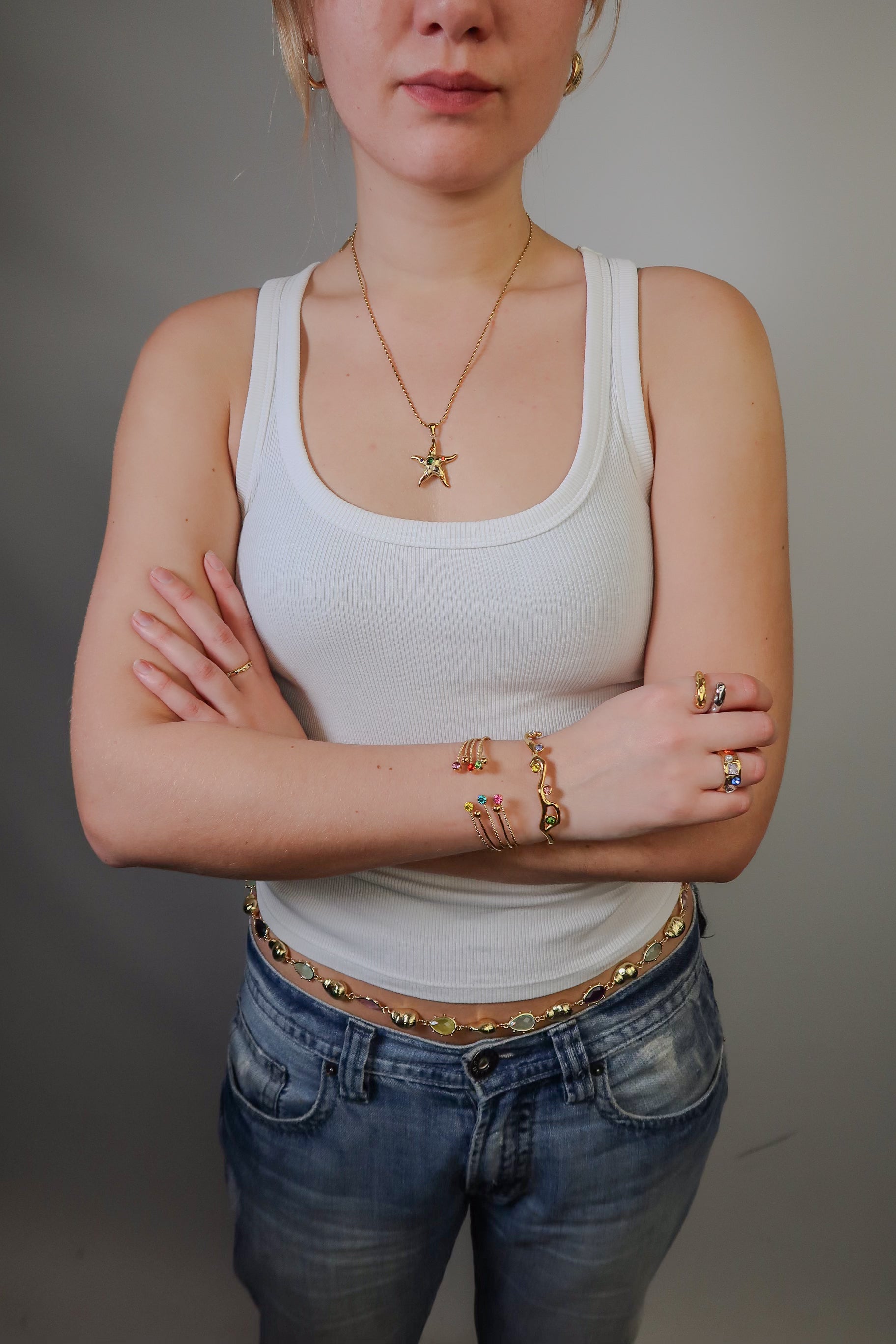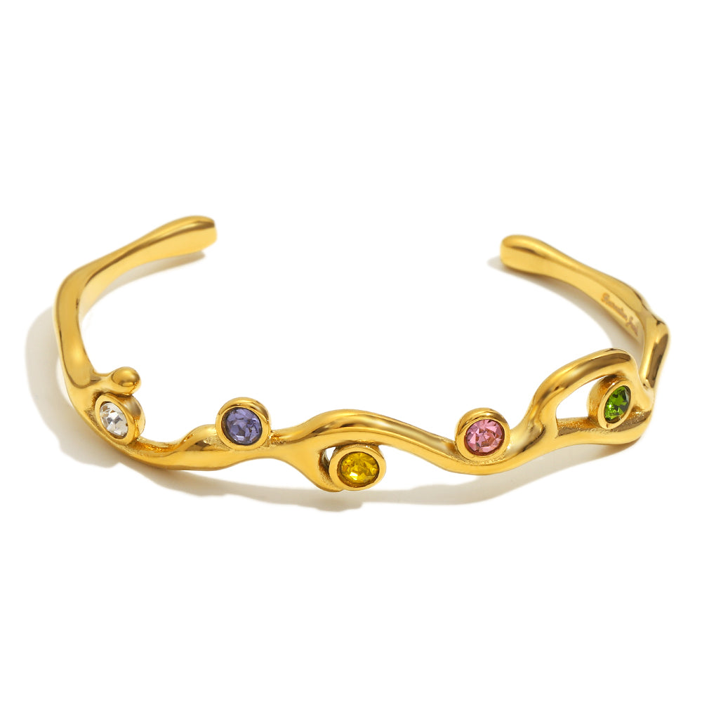 Ivy's Enchanted Multicoloured Bangle is a gold bangle with an intricate wave design that resembles a branch shape accented with vibrantly coloured gemstones. It is the perfect bangle to add to a stack or wear as a statement piece.