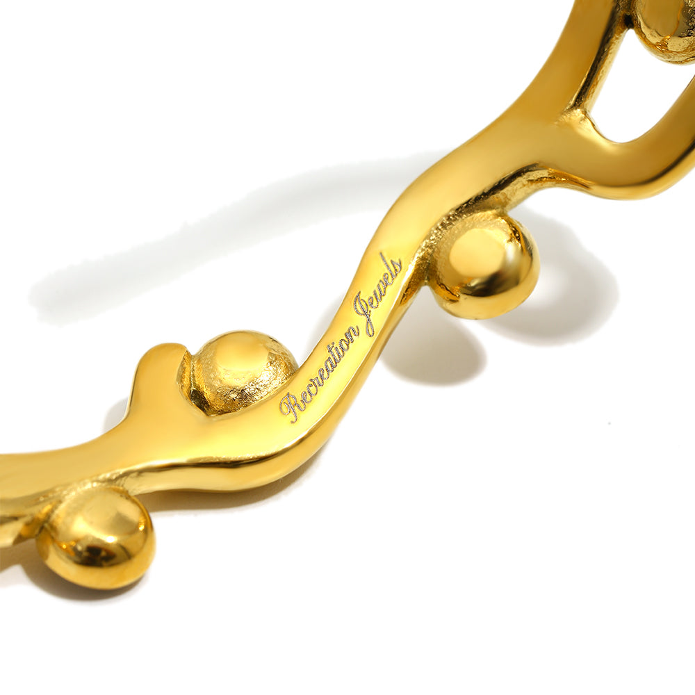 Ivy's Enchanted White Bangle is a gold bangle with a wavy branch like design with bright white gemstone accents. It is waterproof, hypoallergenic, and completely adjustable perfect for every day wear.