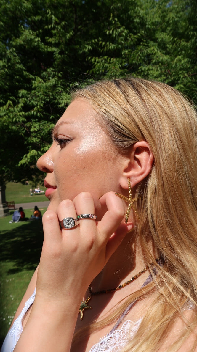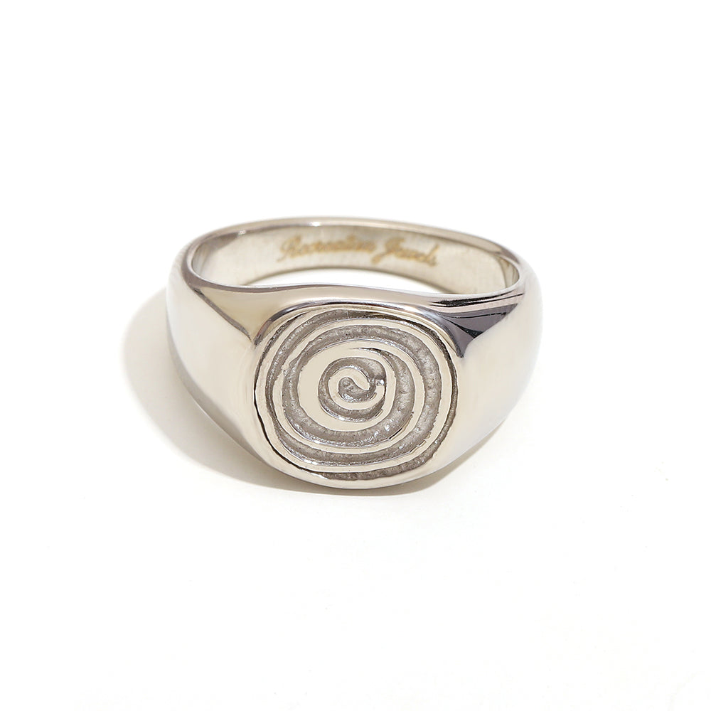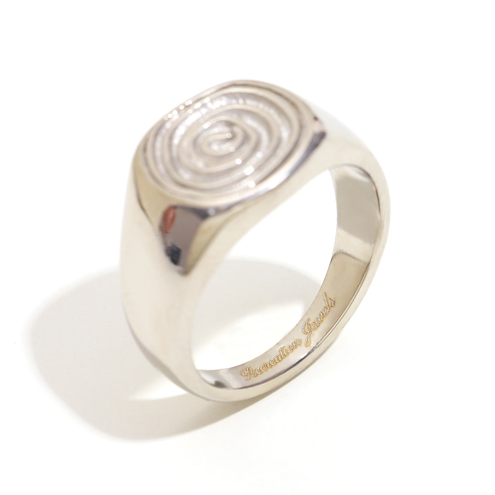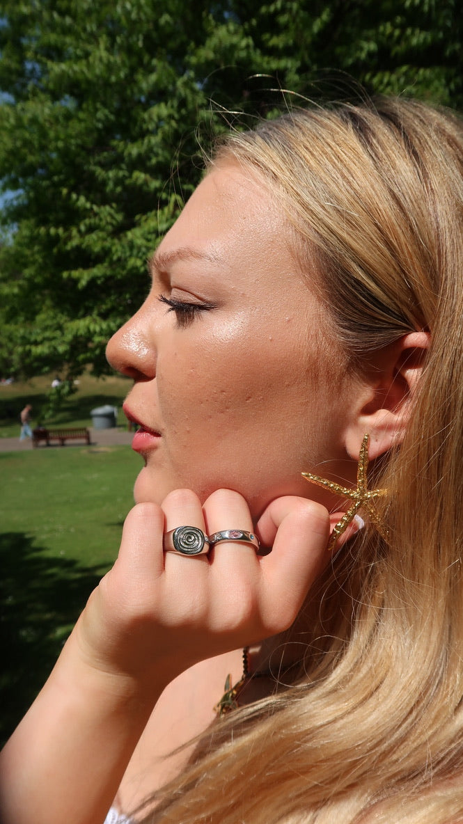 Jemma’s twirl ring in silver is a chunky silver ring with a thumbprint-like swirl on the top. This ring is perfect to add to your daily ring stack.