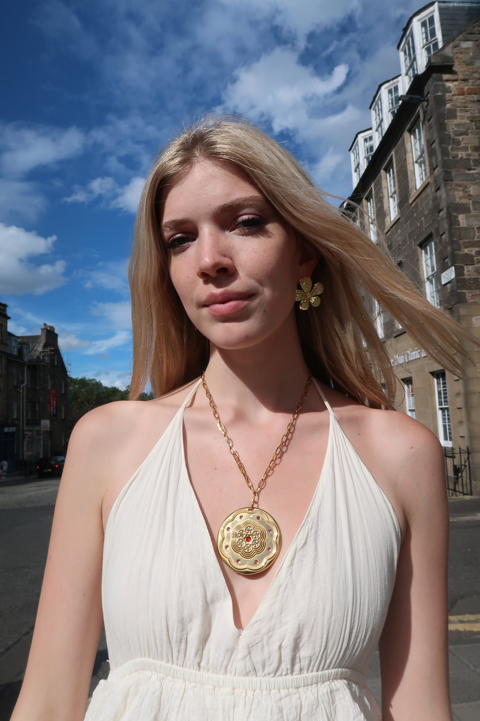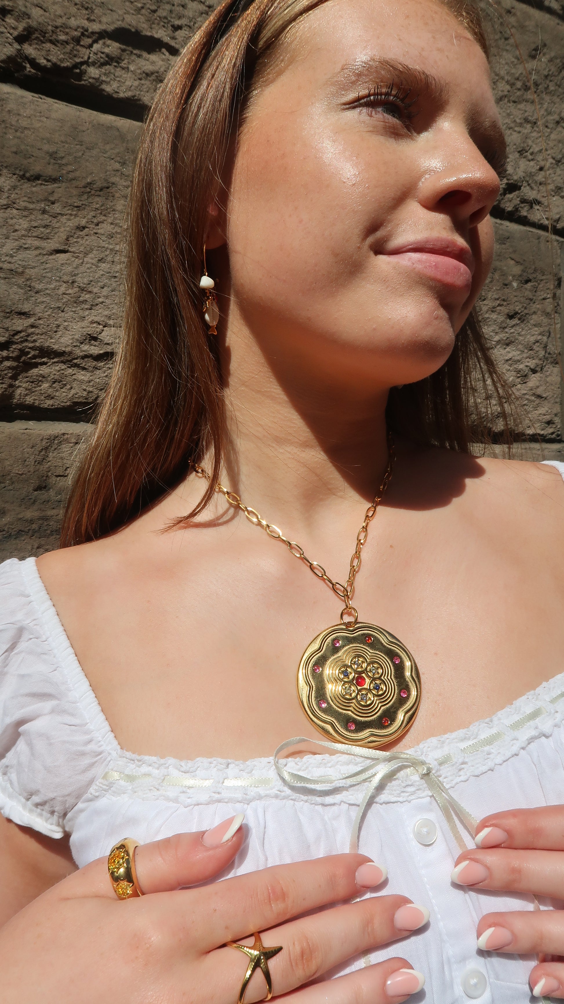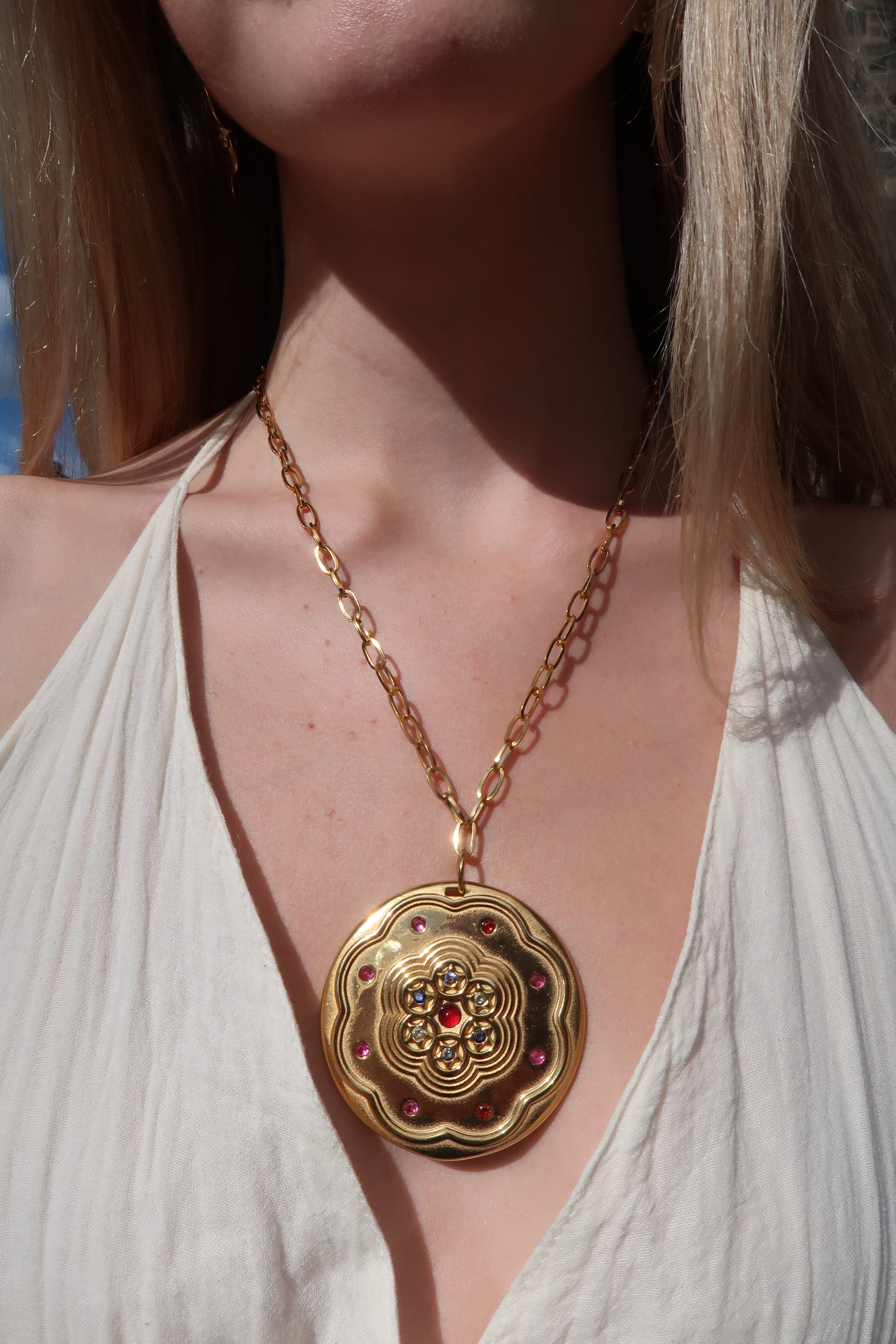 Lana’s gold pendulum is a large round pendant with a red stone at the center with different shades of light blue gemstones surrounding it and pink gemstones around the border. This vintage inspired piece is the perfect maximalist statement necklace.