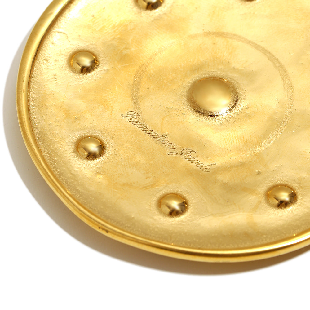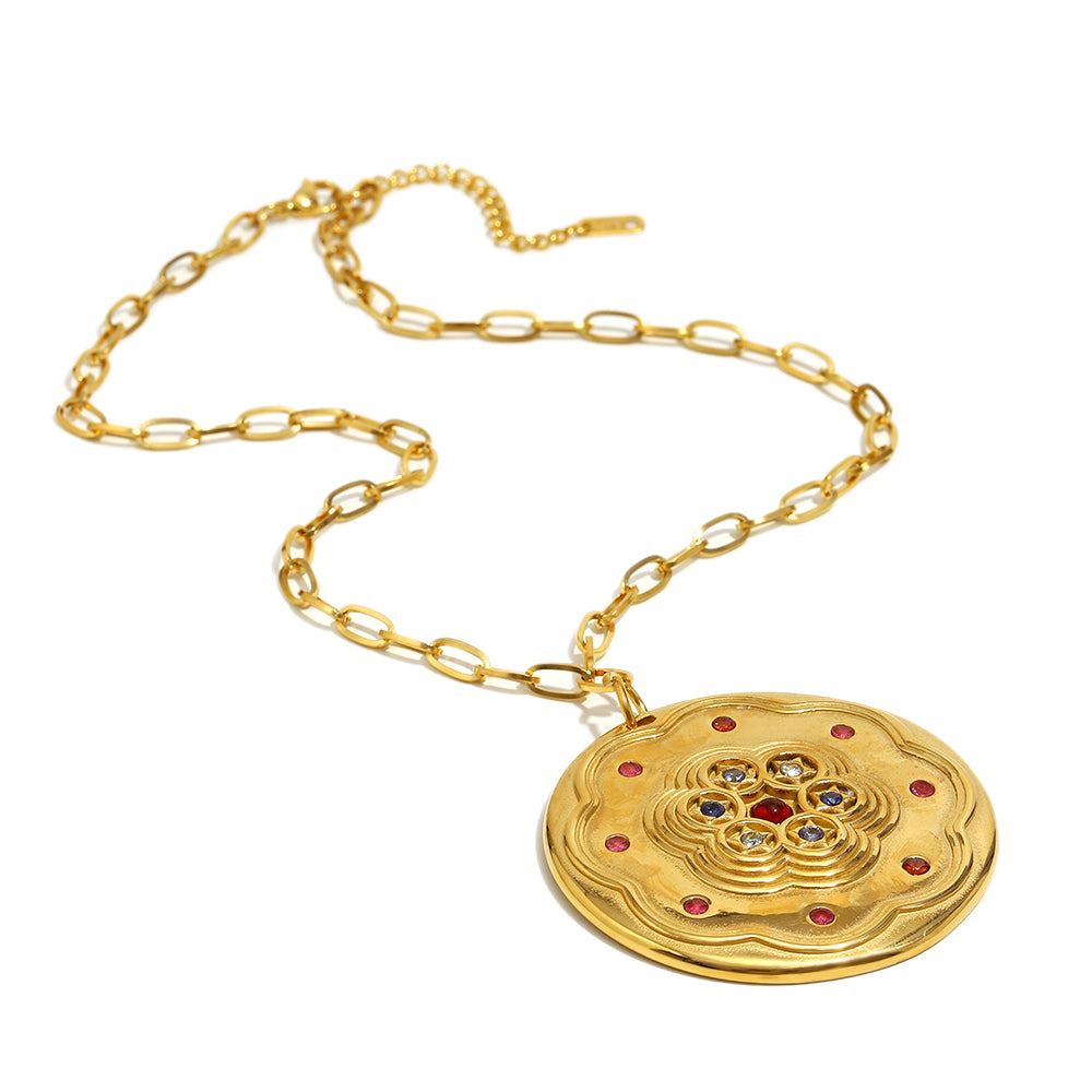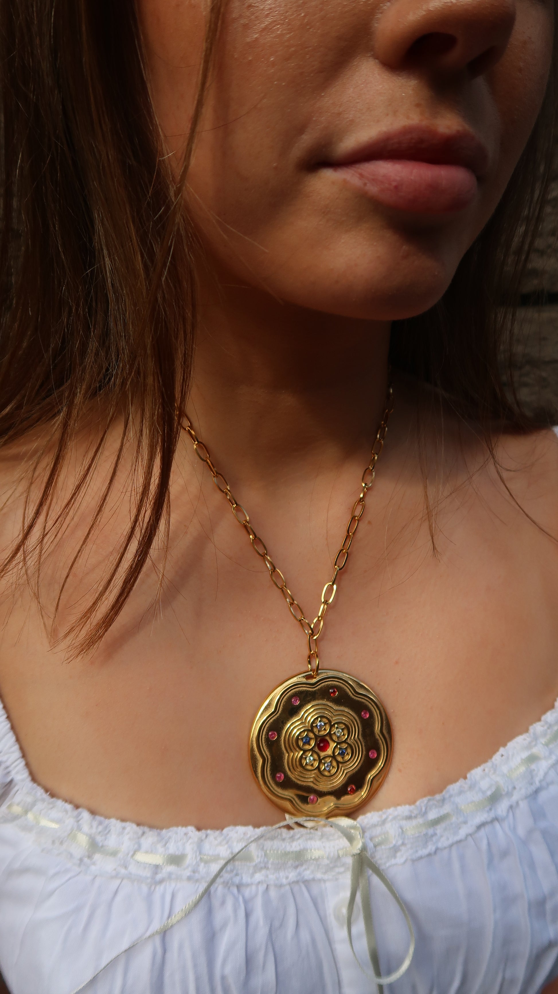 Lana’s gold pendulum is a large round pendant with a red stone at the center with different shades of light blue gemstones surrounding it and pink gemstones around the border. This vintage inspired piece is the perfect maximalist statement necklace.