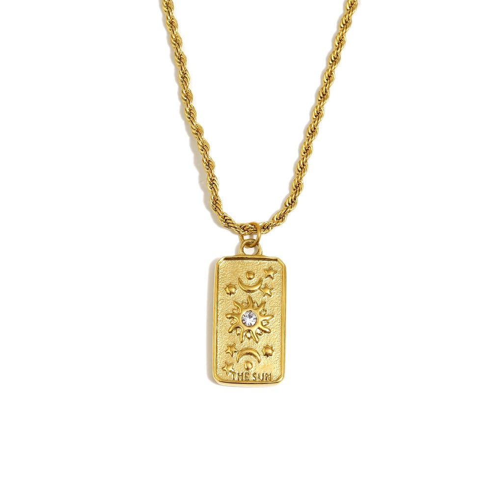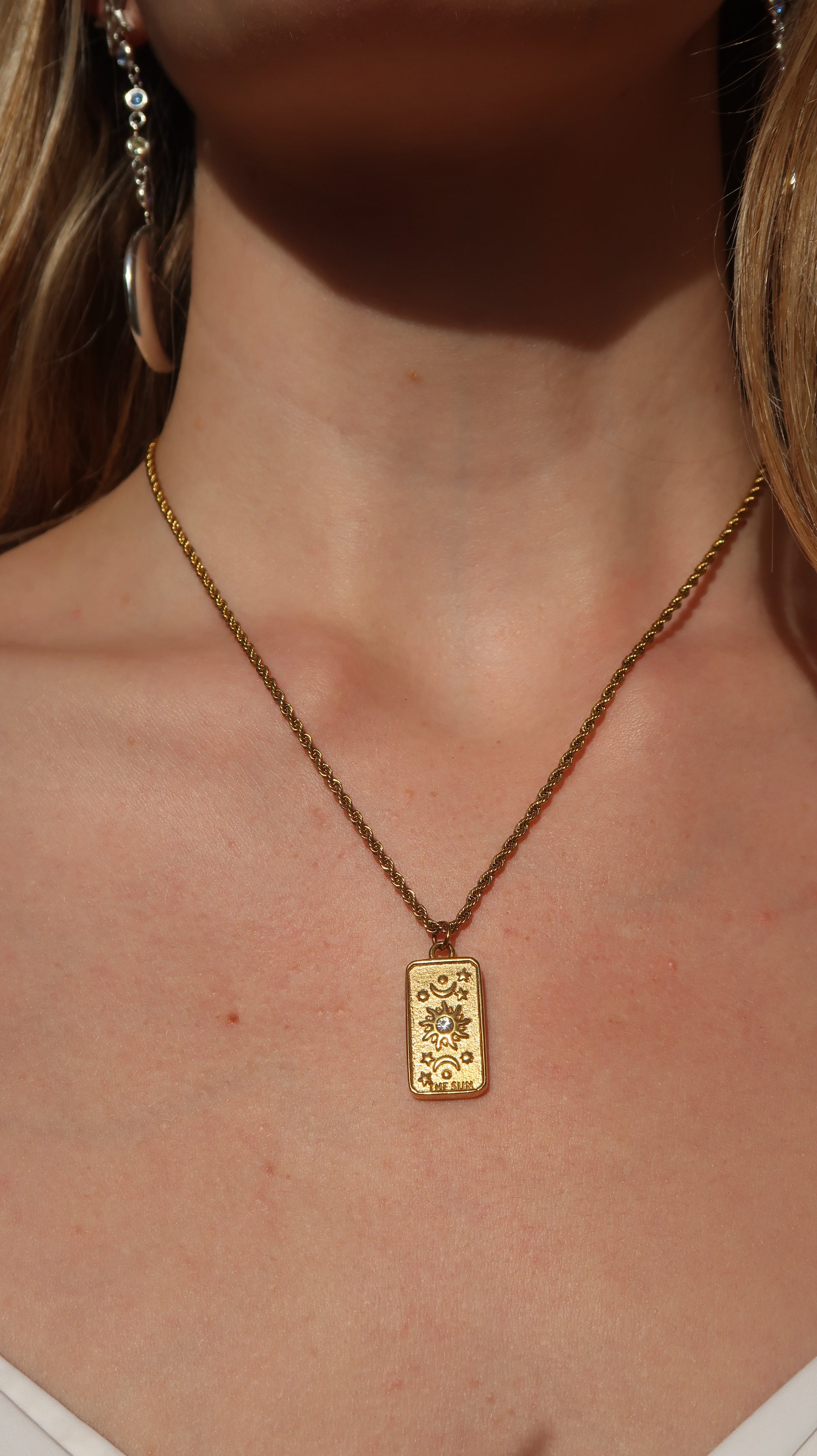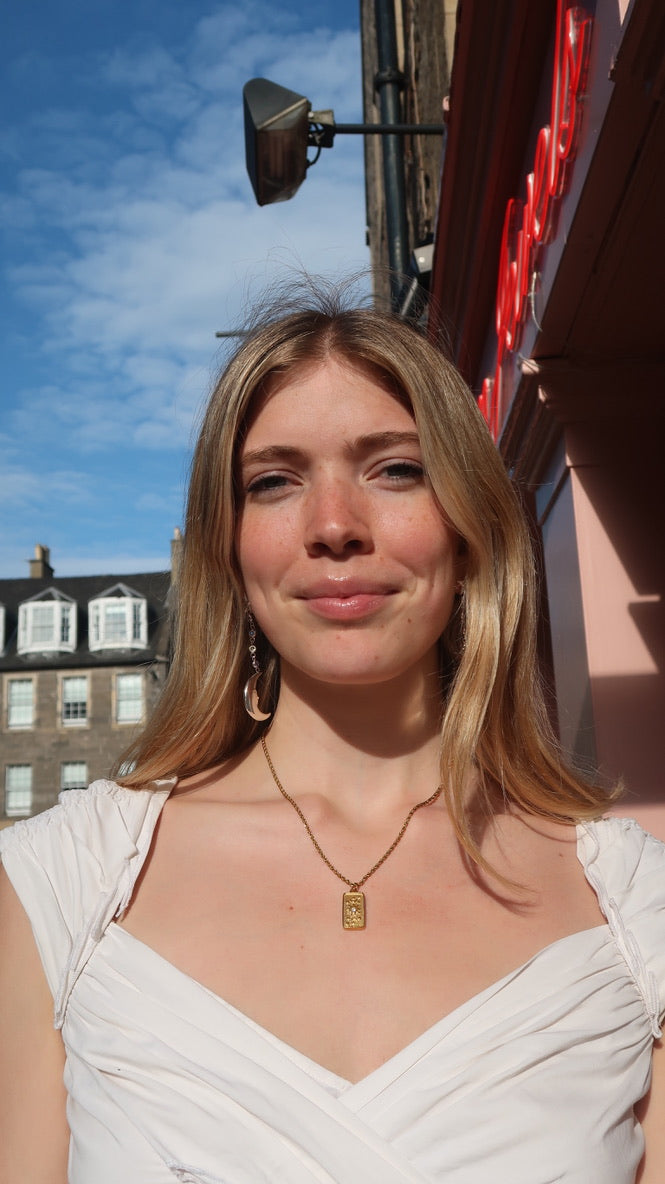 Lila’s Sun Necklace is a tarot-inspired piece that symbolizes positivity, joy, and new beginnings. This is the perfect piece to layer with other necklaces or wear on its own for a simple and elegant look.