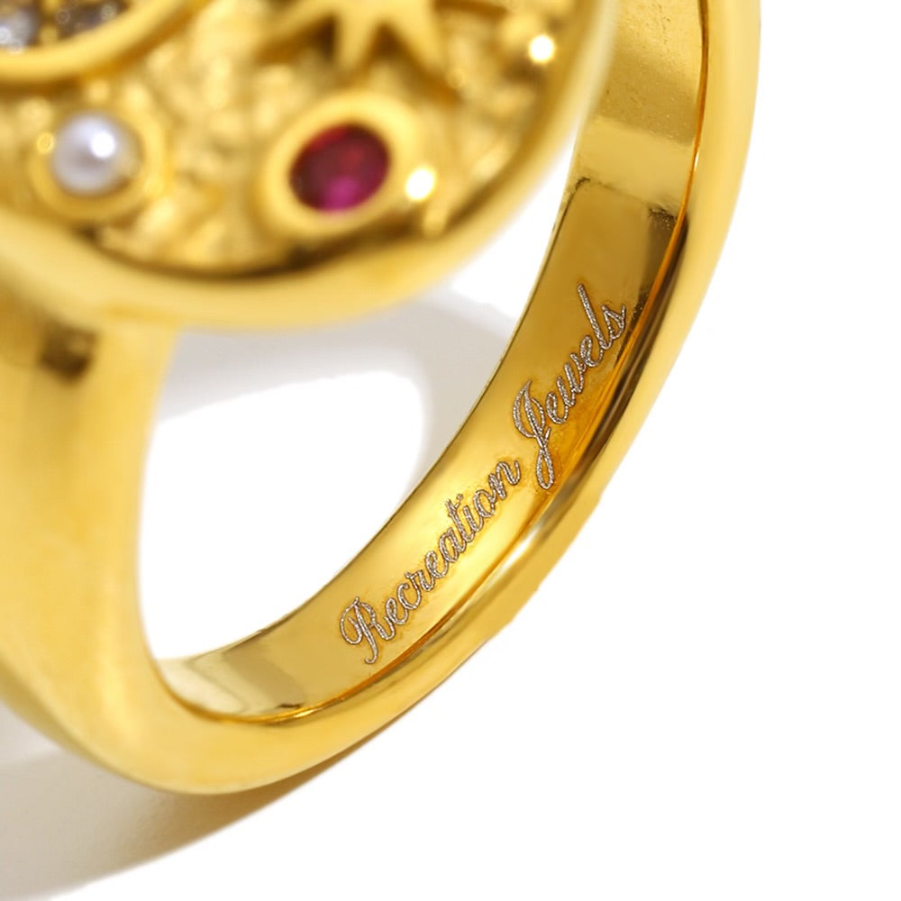 Lucia’s Celestial Ring is a gold ring featuring intricate celestial engravings of stars, the moon, and an eye, all accented with different coloured gemstones.