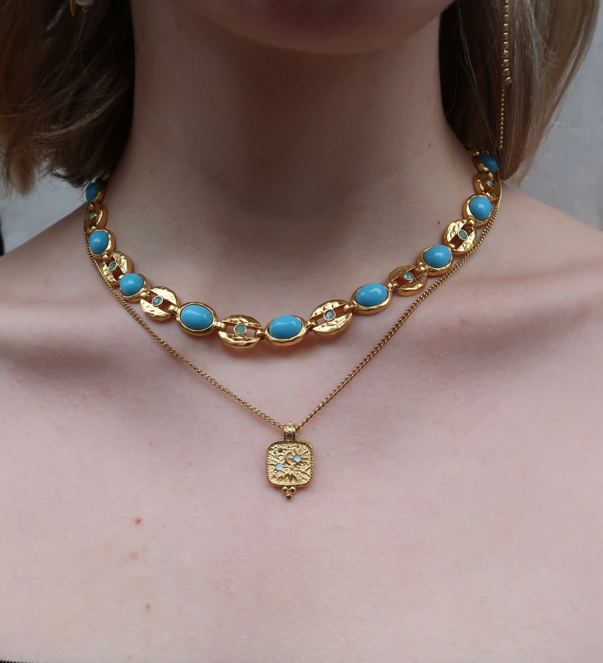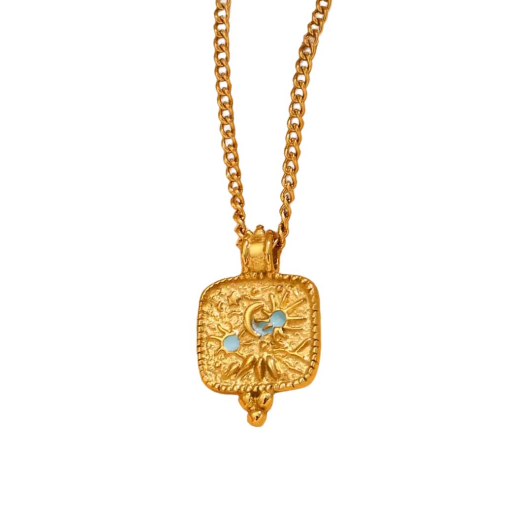 Luna's sky pendant is a delicate square medallion pendant inspired by celestial beauty with an intricate sunburst design and soft blue accents reflecting the hues of the sky. This dainty necklace is perfect for layering, or to be worn in a minimalist look.