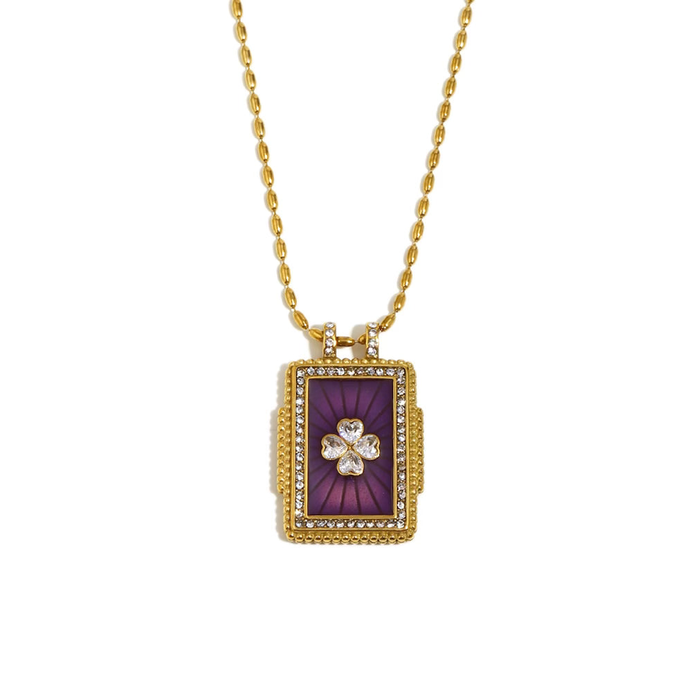 Lydia's Clover Pendant is a medium rectangular pendant with a white gemstone border and a clover at the center also accented with white gemstones. This necklace is perfect for stacking or layering.