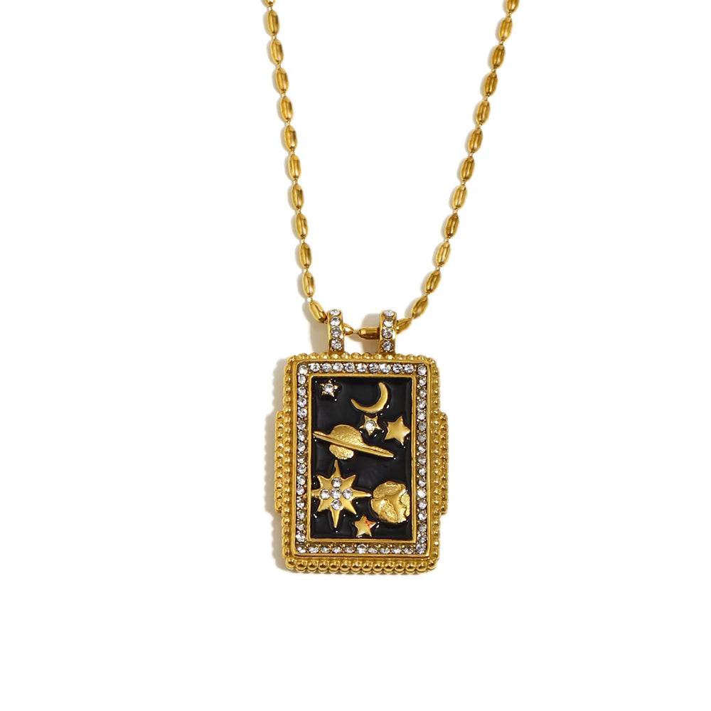 Lydia's planet pendant is a medium rectangular pendant accented with a gemstone border and gold planets and stars. This necklace is perfect for stacking and layering.