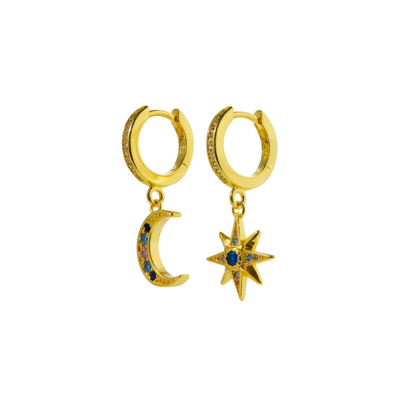 Maia’s Midnight sky huggies in gold are small gold huggie earrings covered in white gemstones. This enchanting set features a star pendant on one earring and a moon pendant on the other both with blue and light blue gemstone accents.