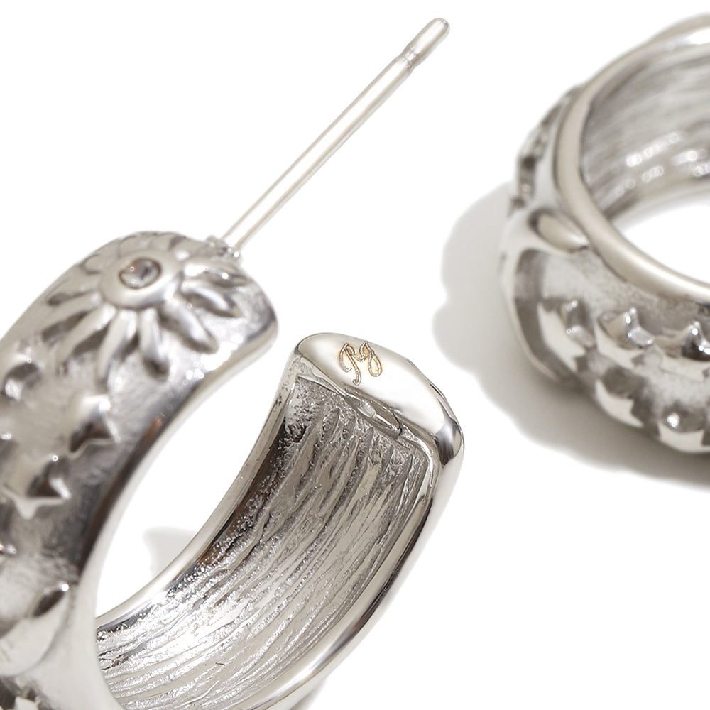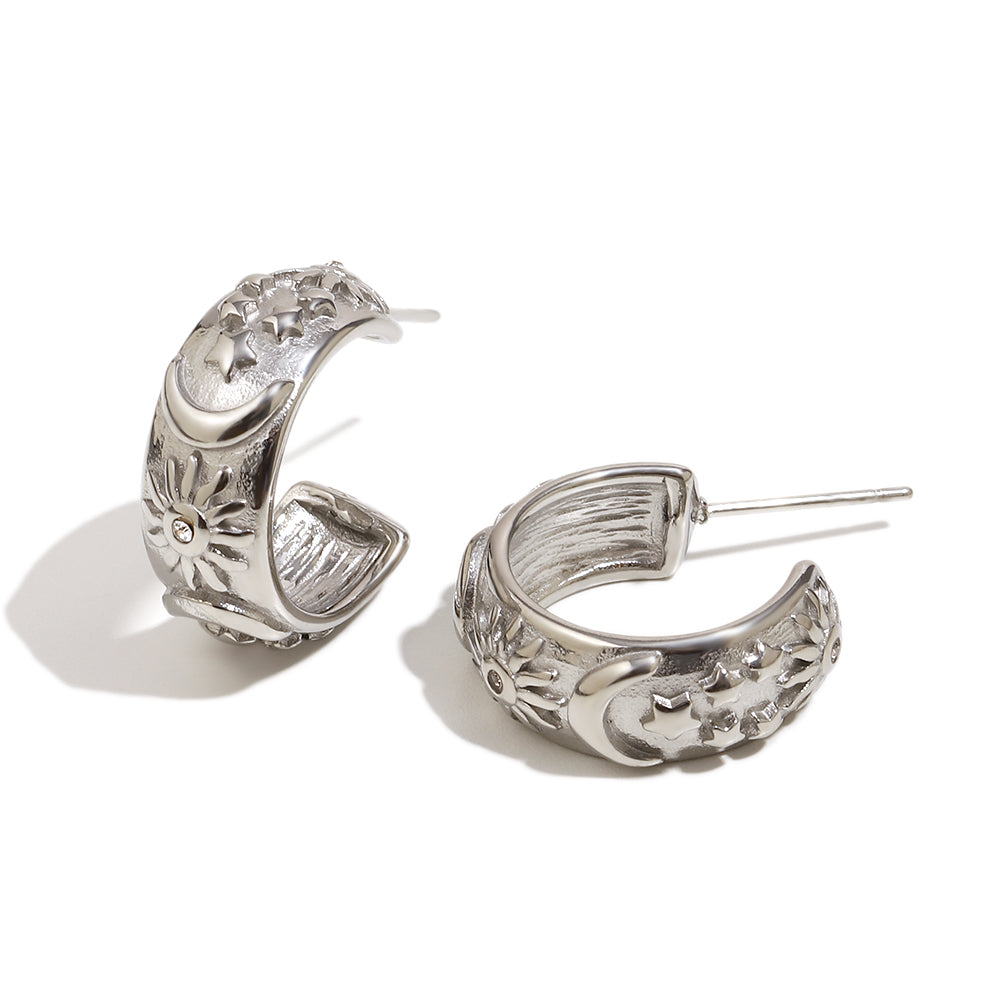 Maria's celestial earrings in silver are medium-sized silver earrings with intricate sun, star, and moon detailing accented with white gemstones.