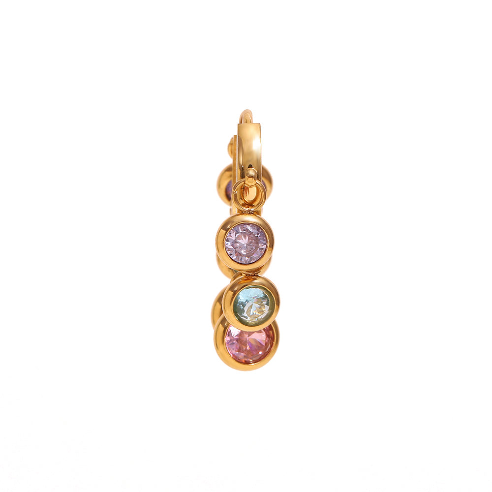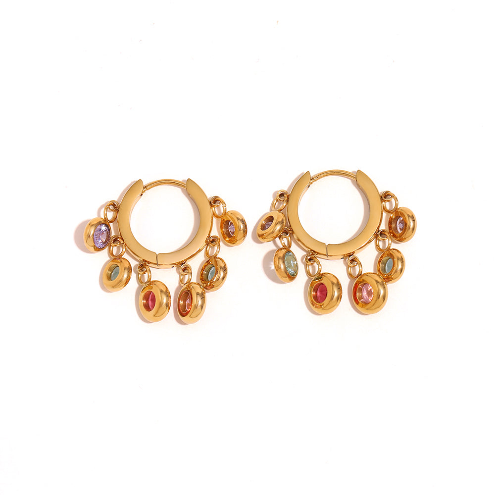 Maya's Gemstone Hoops are gold hoops with multicoloured gemstone charms. These are the perfect statement earrings to brighten any outfit.