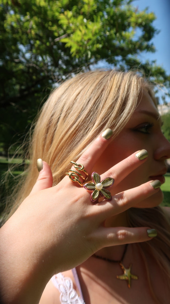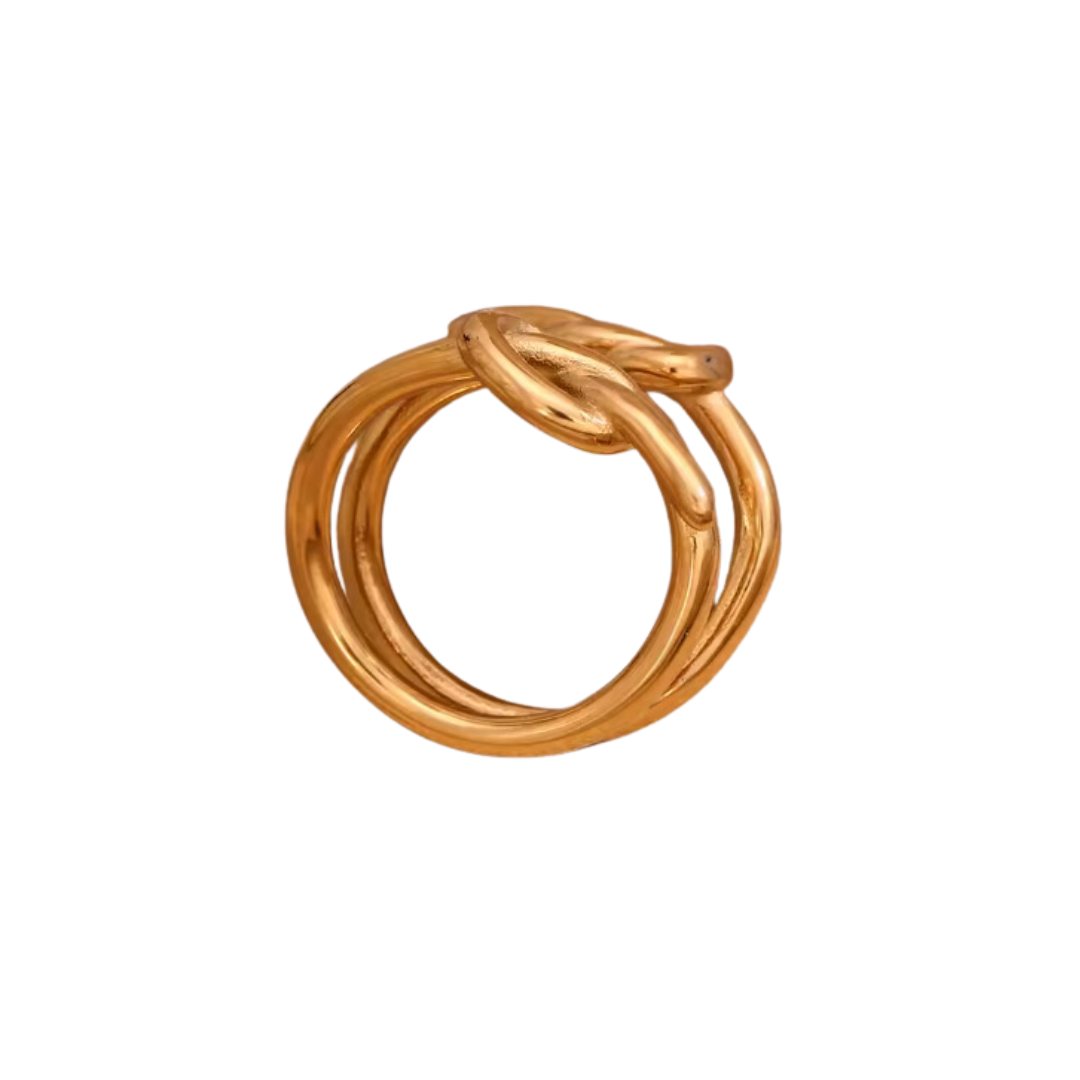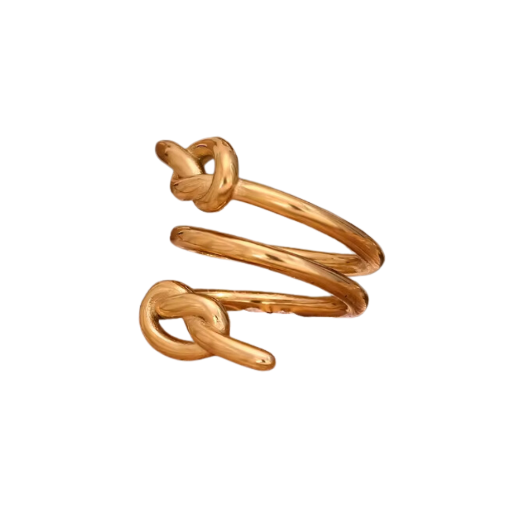Melissa's twist ring is a thin gold ring that twists around the finger in three loops with knot detailing on both ends. This ring perfectly blends simplicity and elegance for a classic and versatile look.