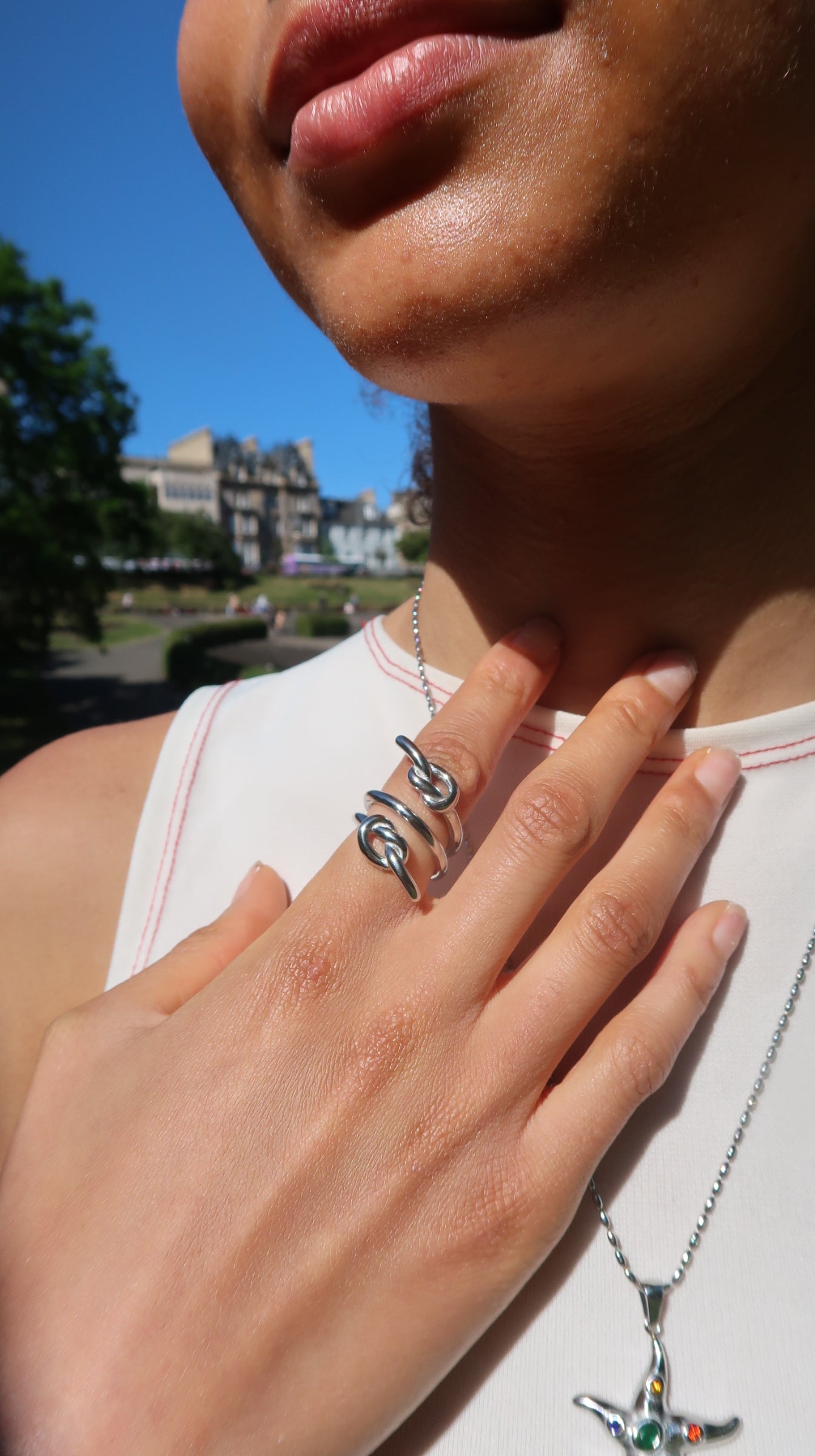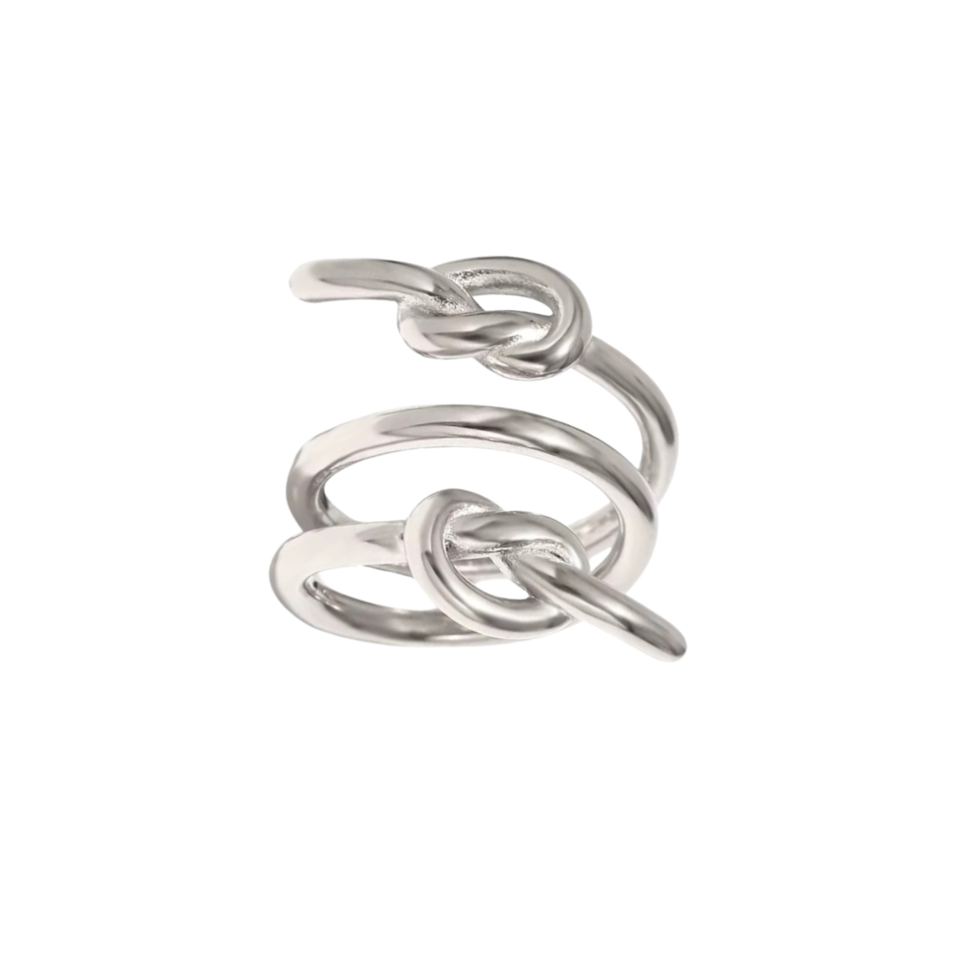 Melissa's twist ring in silver is a thin silver ring that twists around the finger in three loops with knot detailing on both ends. This ring perfectly blends simplicity and elegance for a classic and versatile look.