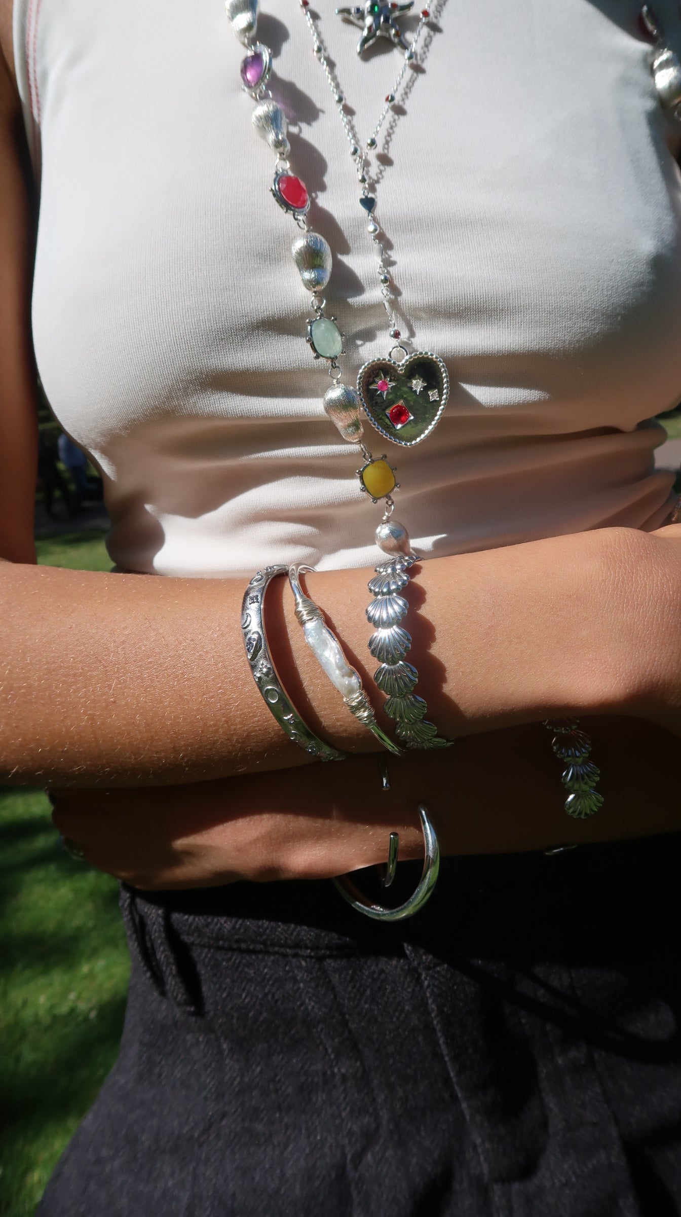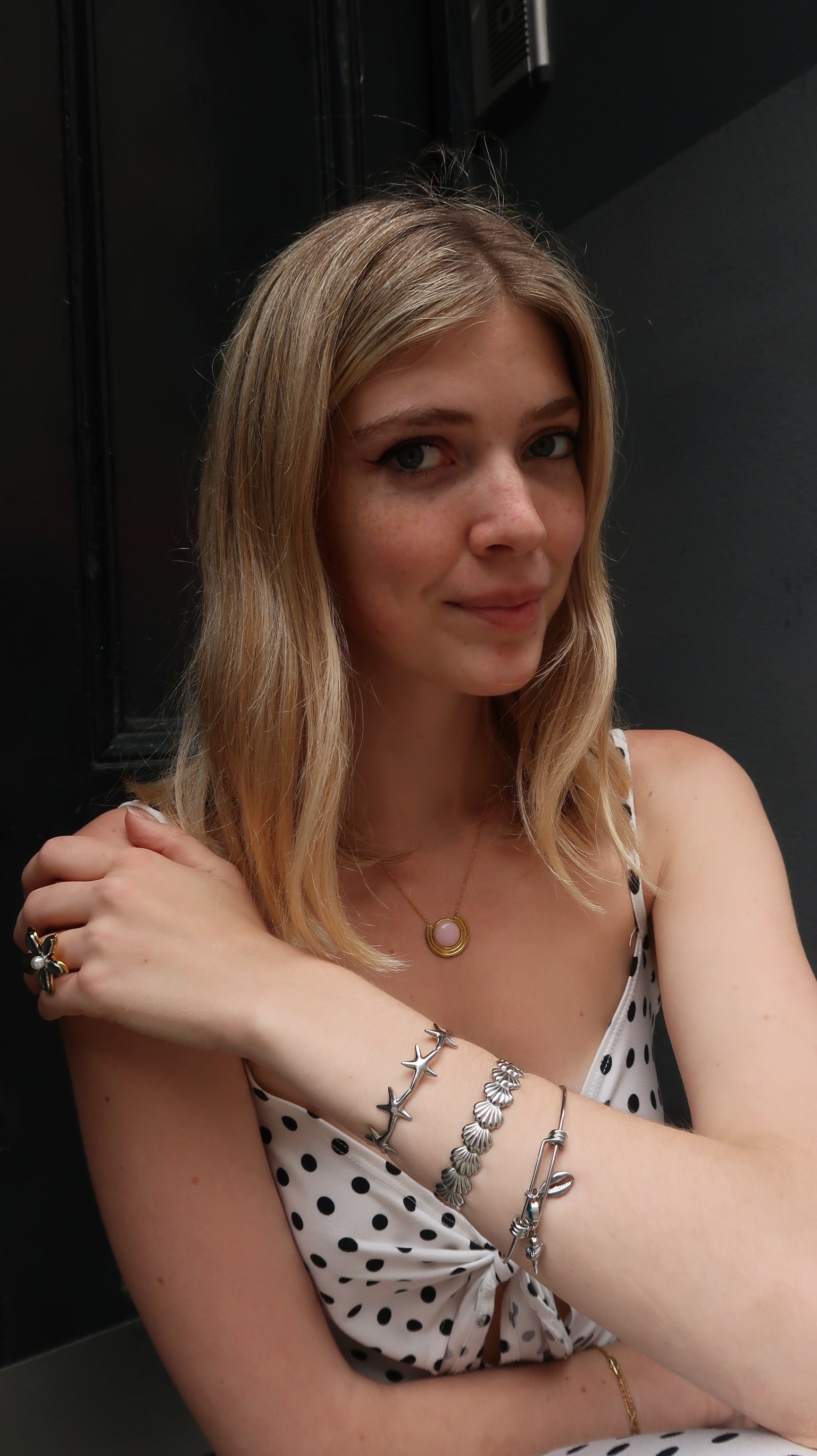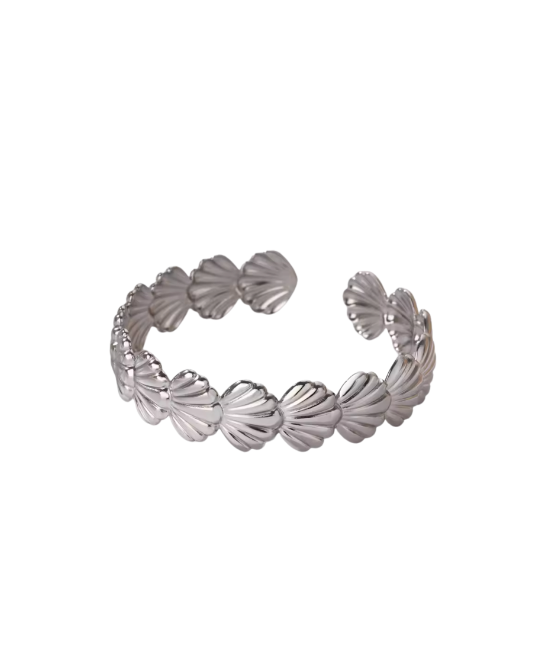 Mila’s Shell Bangle features a row of silver shells, bringing a subtle coastal touch to your everyday stack. With its smooth finish and textured detailing, it’s the perfect piece to elevate any summer outfit — whether you're city-bound or seaside.