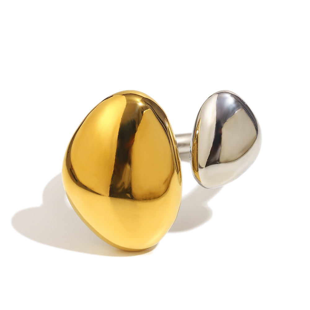 Mina's mixed ring is a chunky mixed metal silver and gold ring. This ring is simple and elegant, perfect for stacking with other rings.