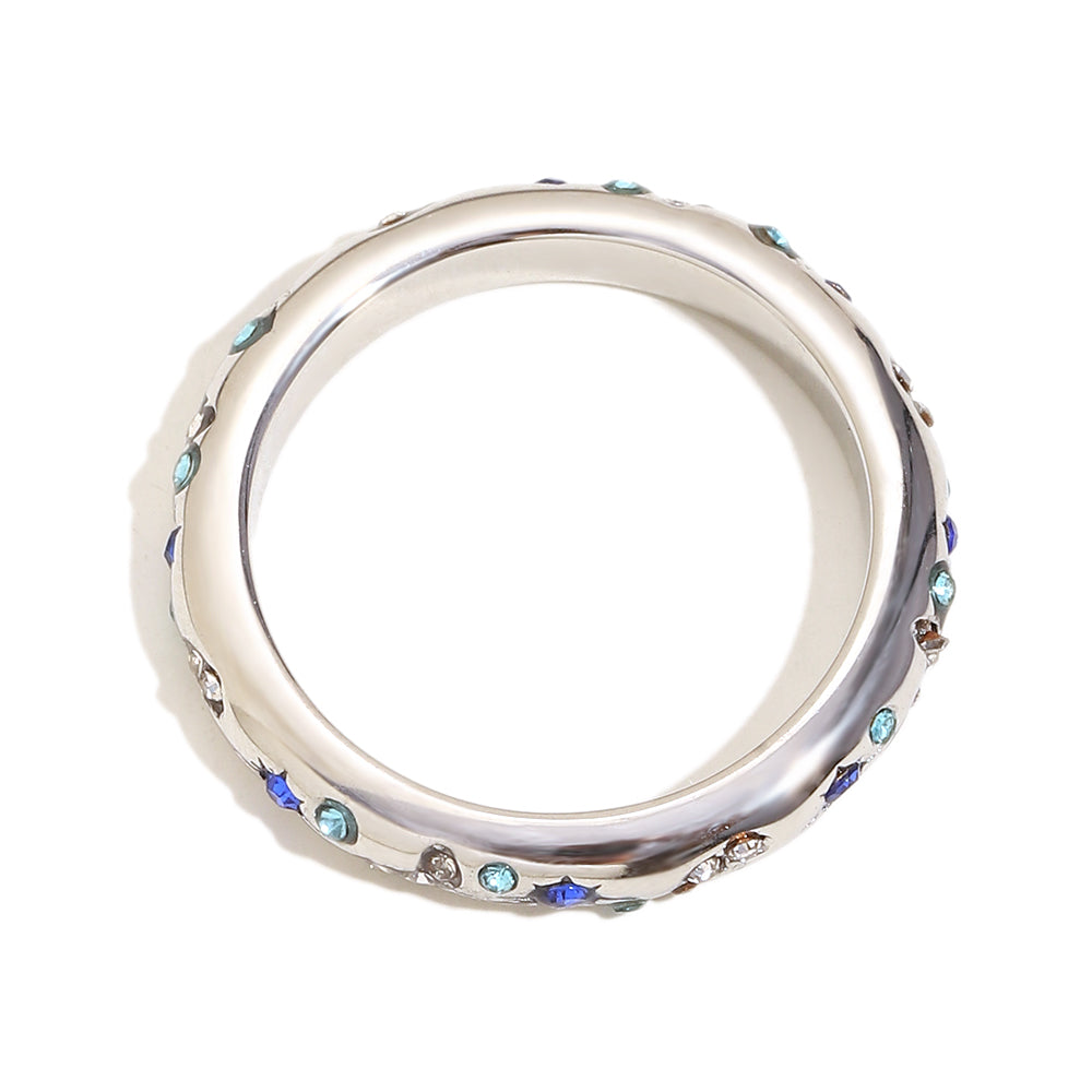 Naomie’s Moonshine Ring in silver is a dainty silver ring accented with light blue, dark blue, and white gemstones in a celestial pattern. This ring is perfect for pairing with other rings in a maximalist stack or to wear by itself.
