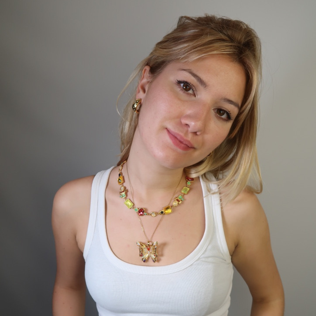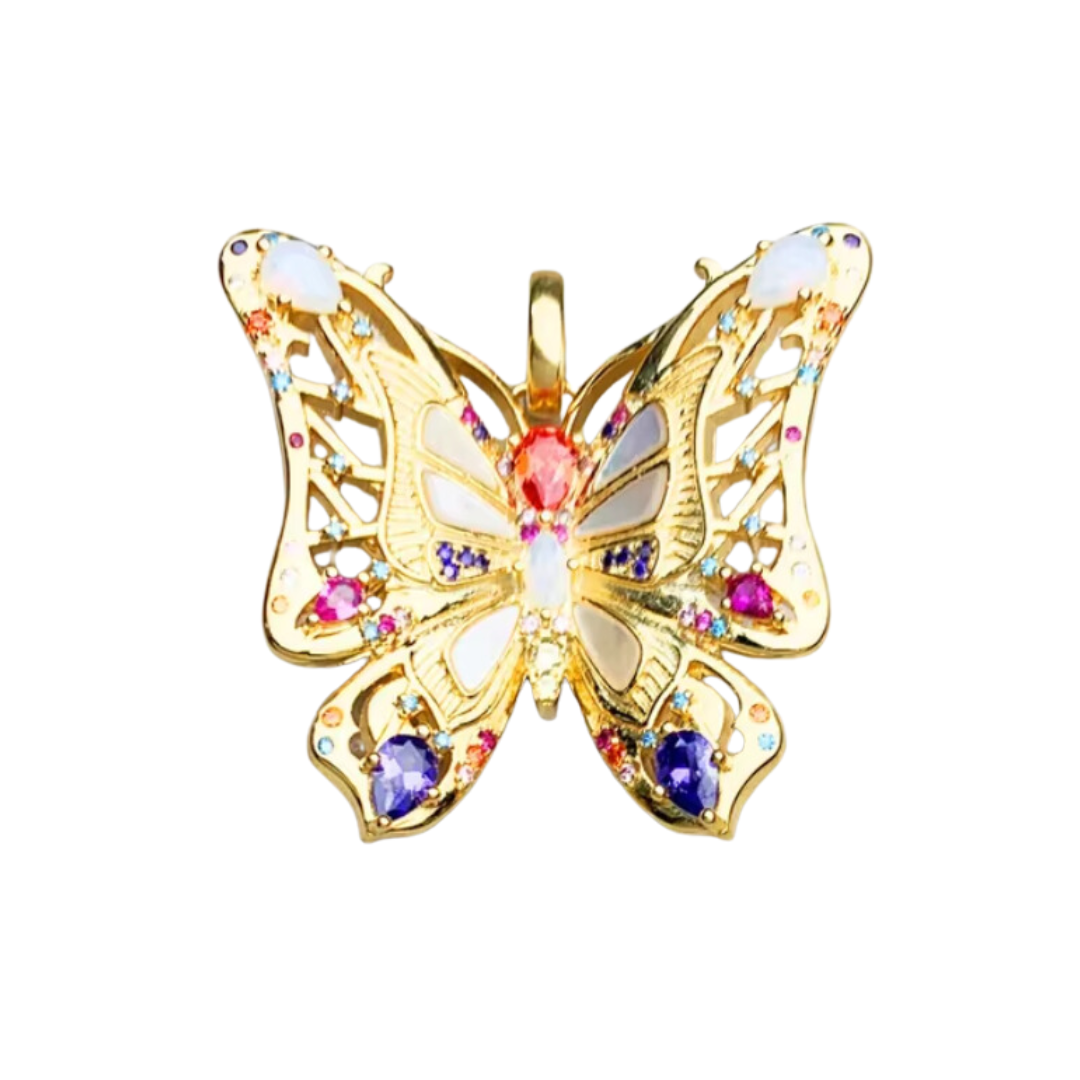 Natalia's butterfly necklace is a butterfly pendant made from 925k sterling silver and plated in gold. It features pink, purple, orange, blue, and white stones that catch the light. This is the perfect statement piece to add to any look.