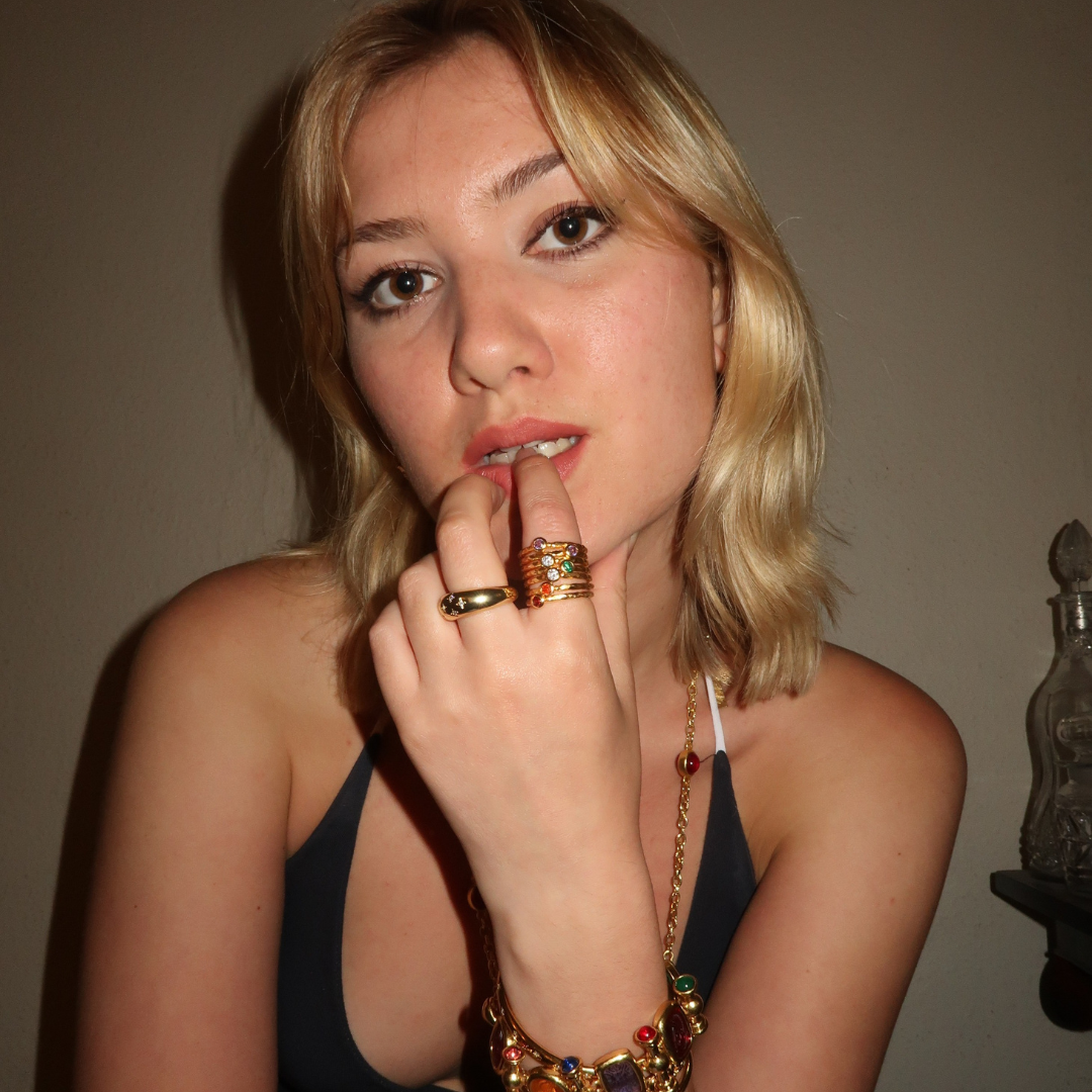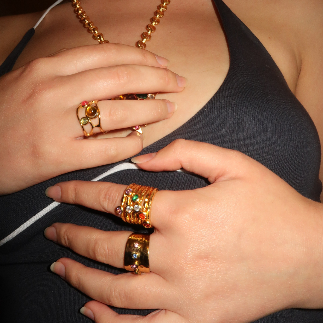 Octavia's Stacked Ring is a gold ring made up of seven different rings, each with a different coloured gemstone, all bound together to form one ring. This is the perfect maximalist piece to add to your stack or wear on its own as a statement.