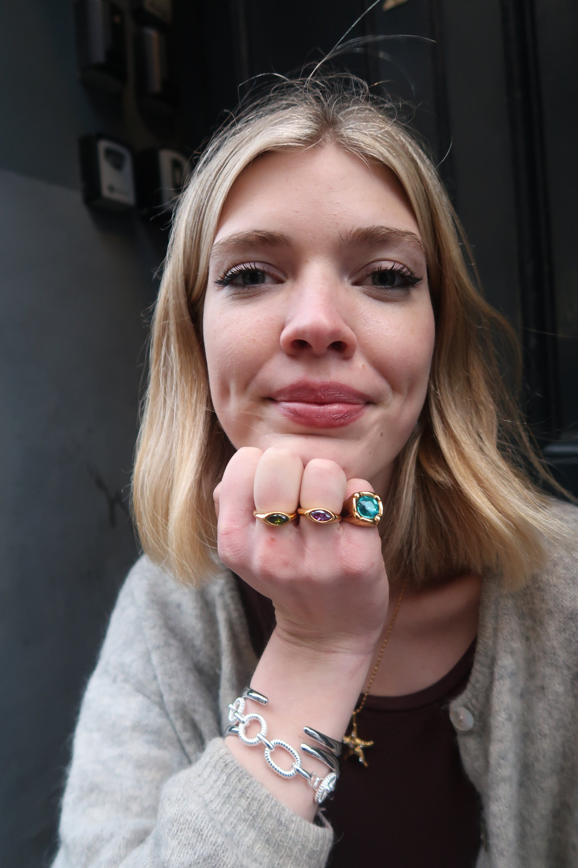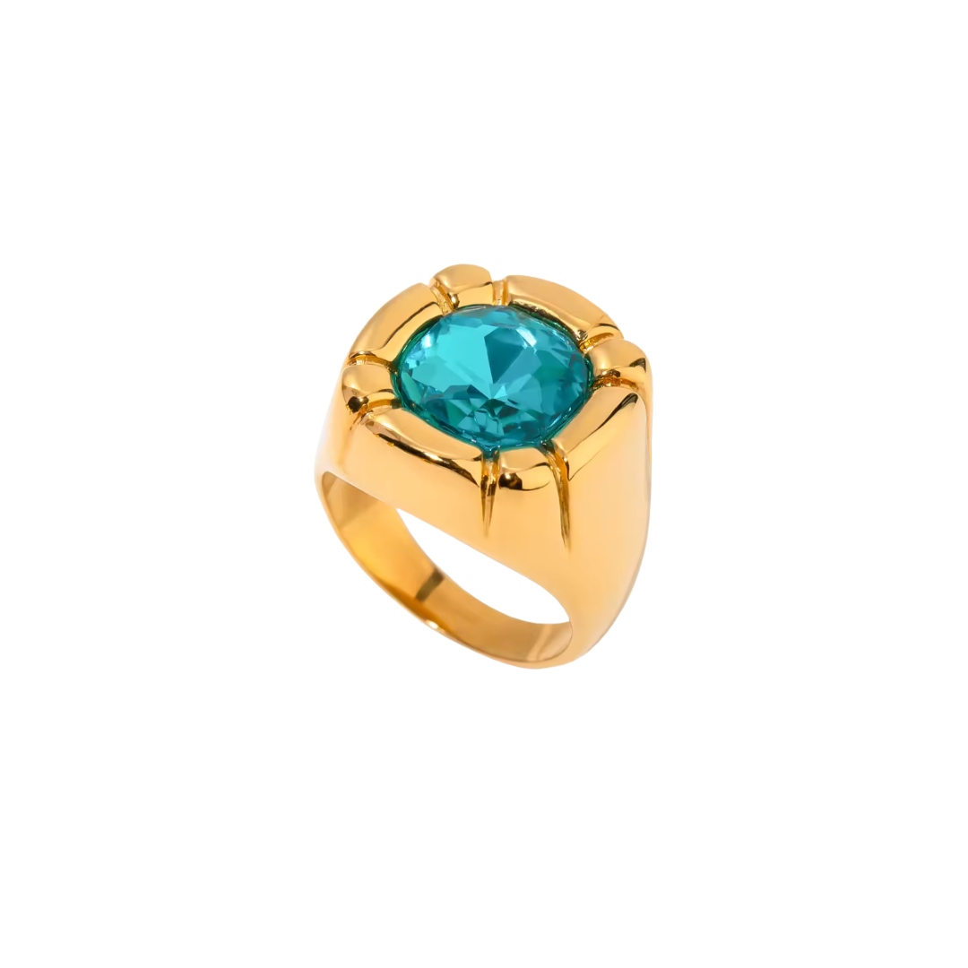 Olivia's blue ring is a chunky gold ring that features a radiant blue gemstone in the center. This is the perfect piece to add to your maximalist set.