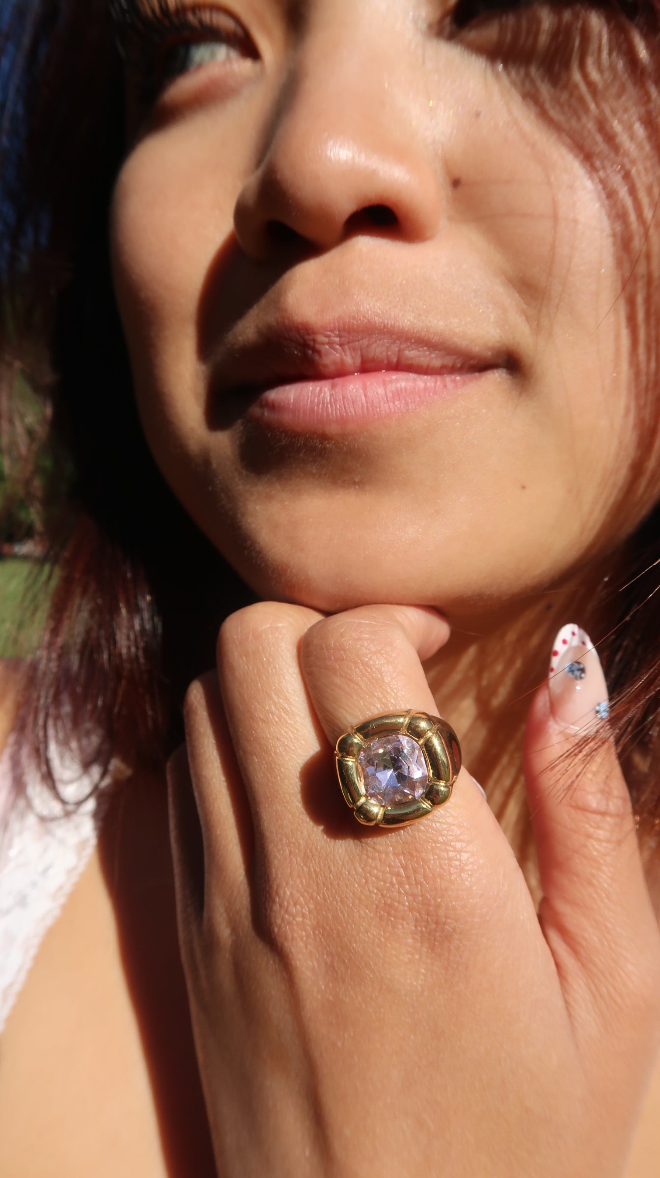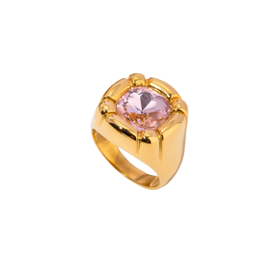 Olivia's pink ring is a chunky gold ring that features a radiant light pink gemstone in the center. This is the perfect piece to add to your maximalist set.