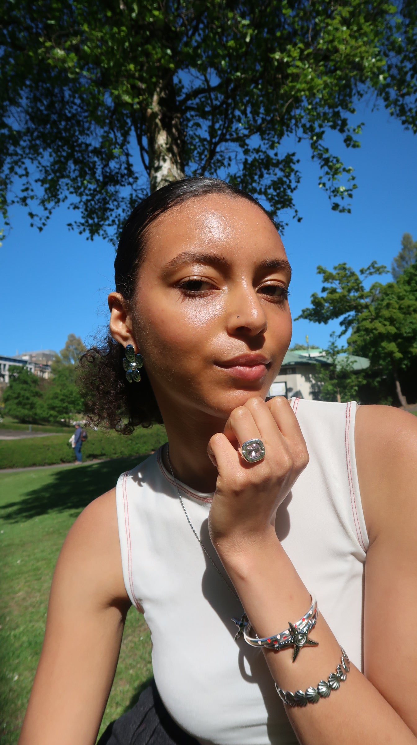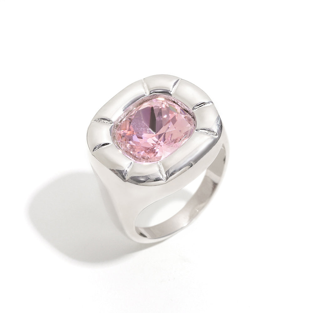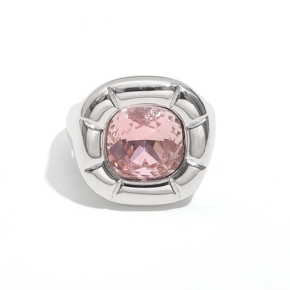 Olivia's Pink Ring is a chunky silver ring that features a radiant light pink gemstone in the center. This is the perfect piece to add to your maximalist set.