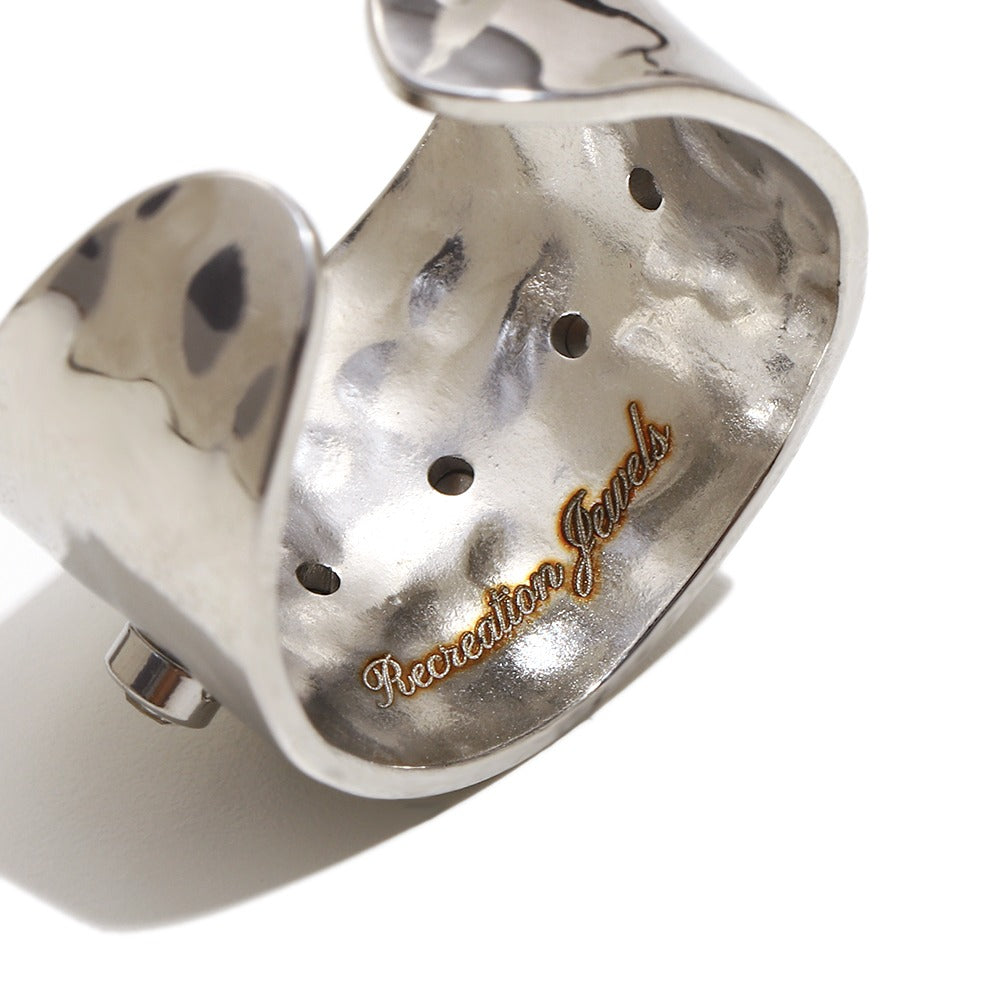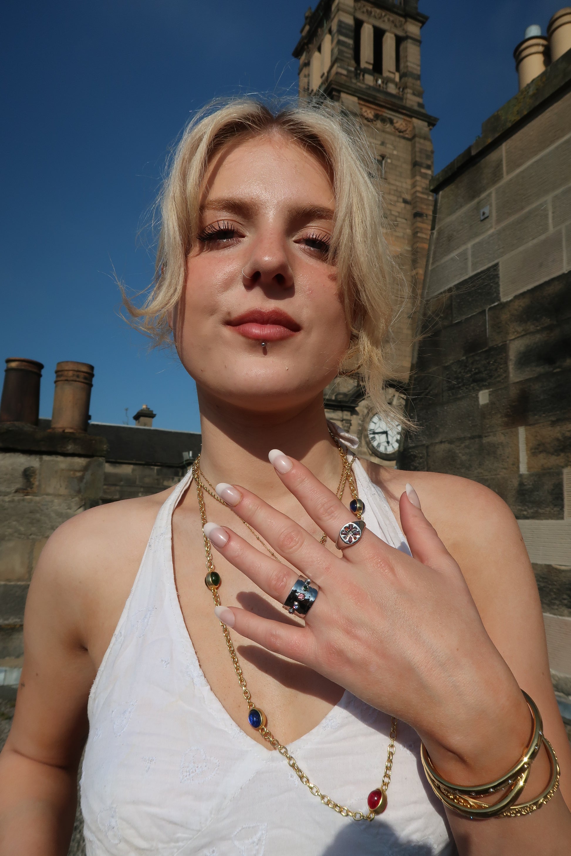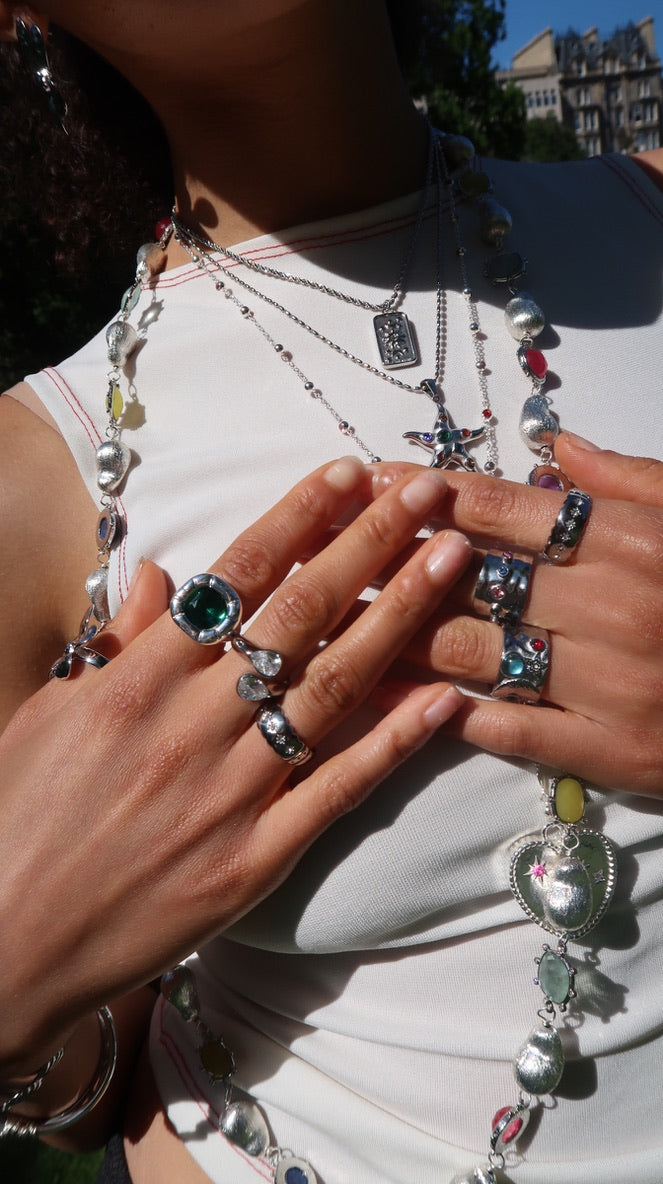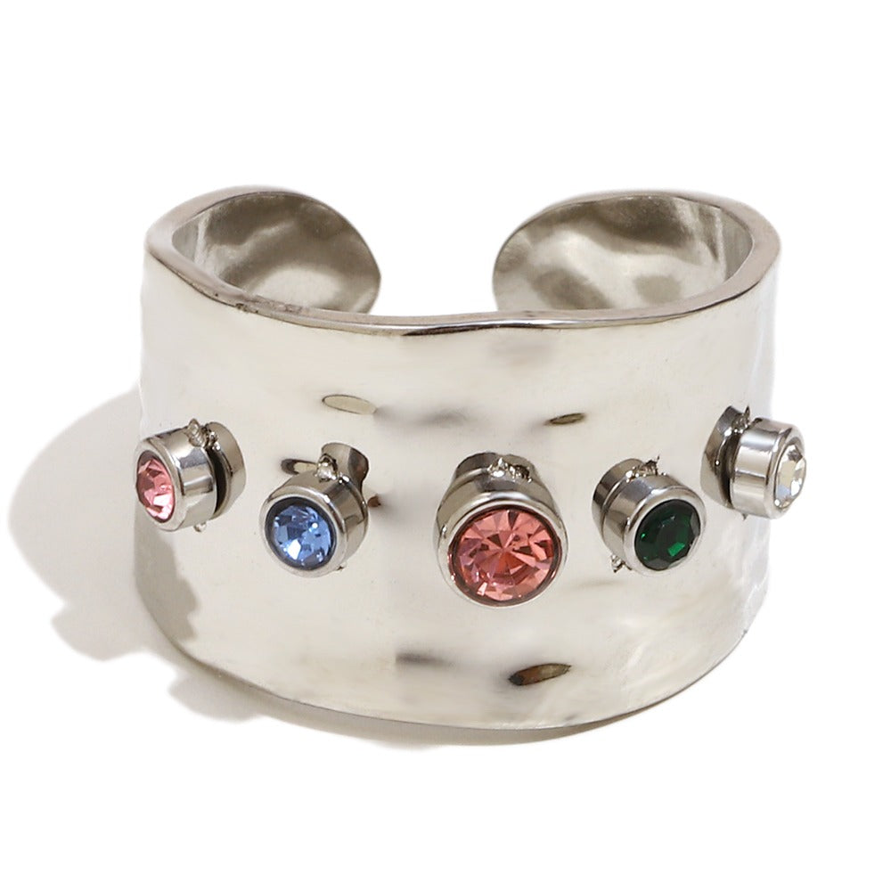 Ophelia's Ring is a thick silver ring that features a stunning array of pink, blue, clear, and green cubic zirconia stones, set in stainless steel.